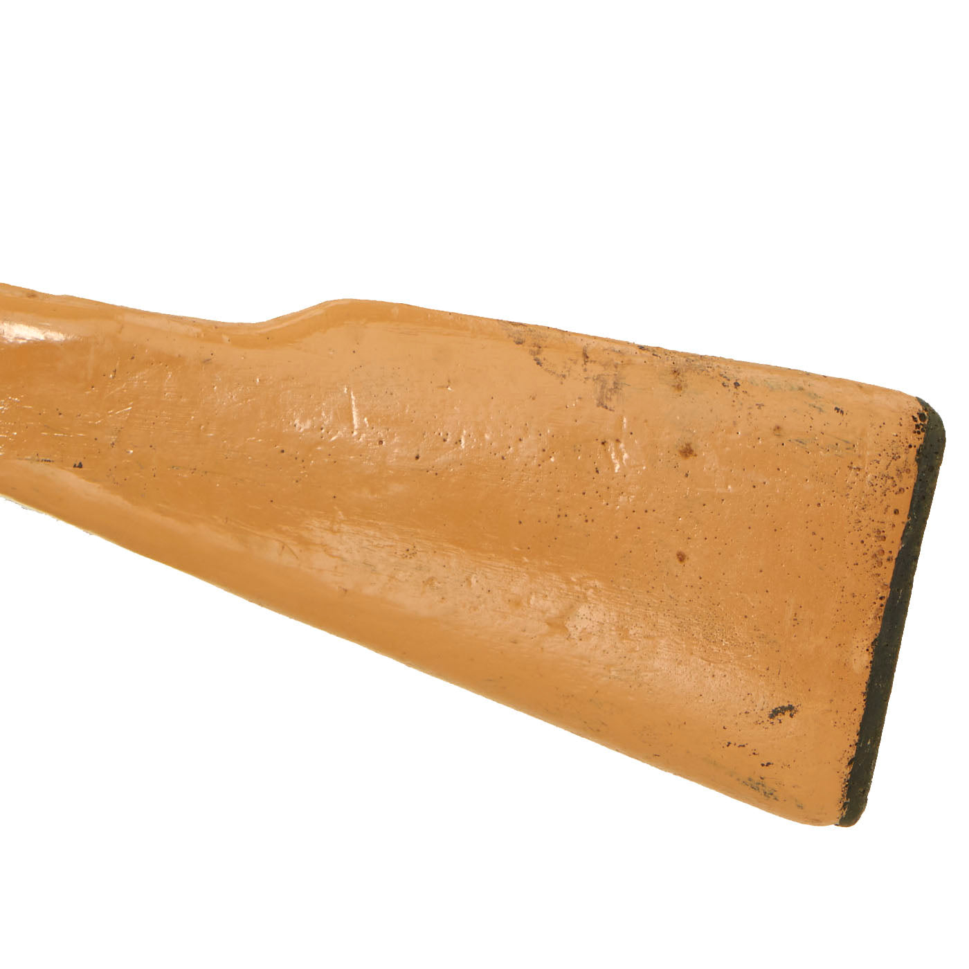 These were used for training by the military so they would not ruin a real rifle and as a safety precaution to prevent accidental discharges. It measures 34 inches long, and is in good condition, though it does have some damage from use. The front sight is broken off, and the rear sight has a glued repair. Otherwise, the rubber is solid and is very detailed without any cracks or splitting.
