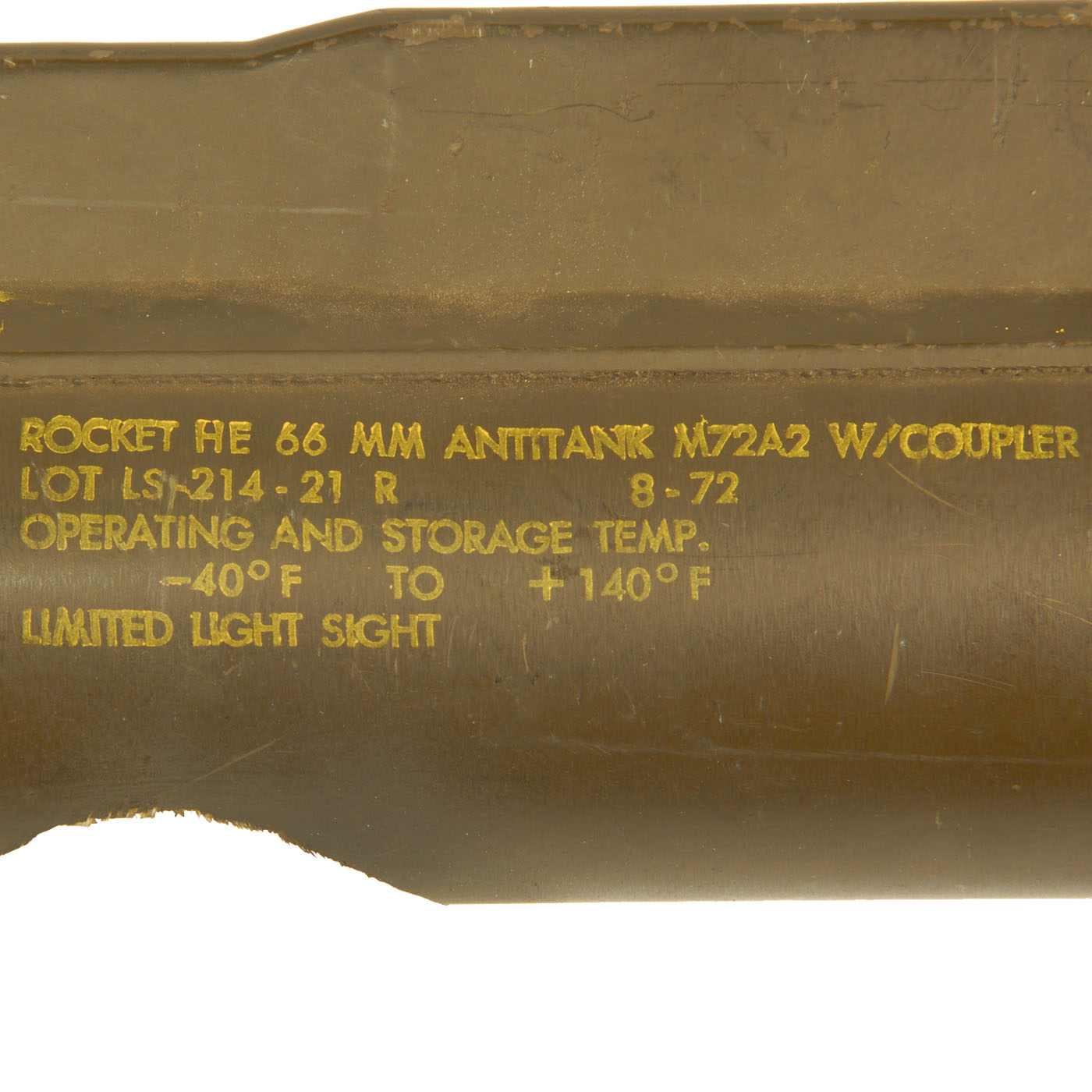 Original Item: Only one available. This is an inert non-firing BATF compliant M72A2 LAW Light Anti-Tank Weapon offered in excellent condition. Once fired, these tubes are unable to be reloaded.