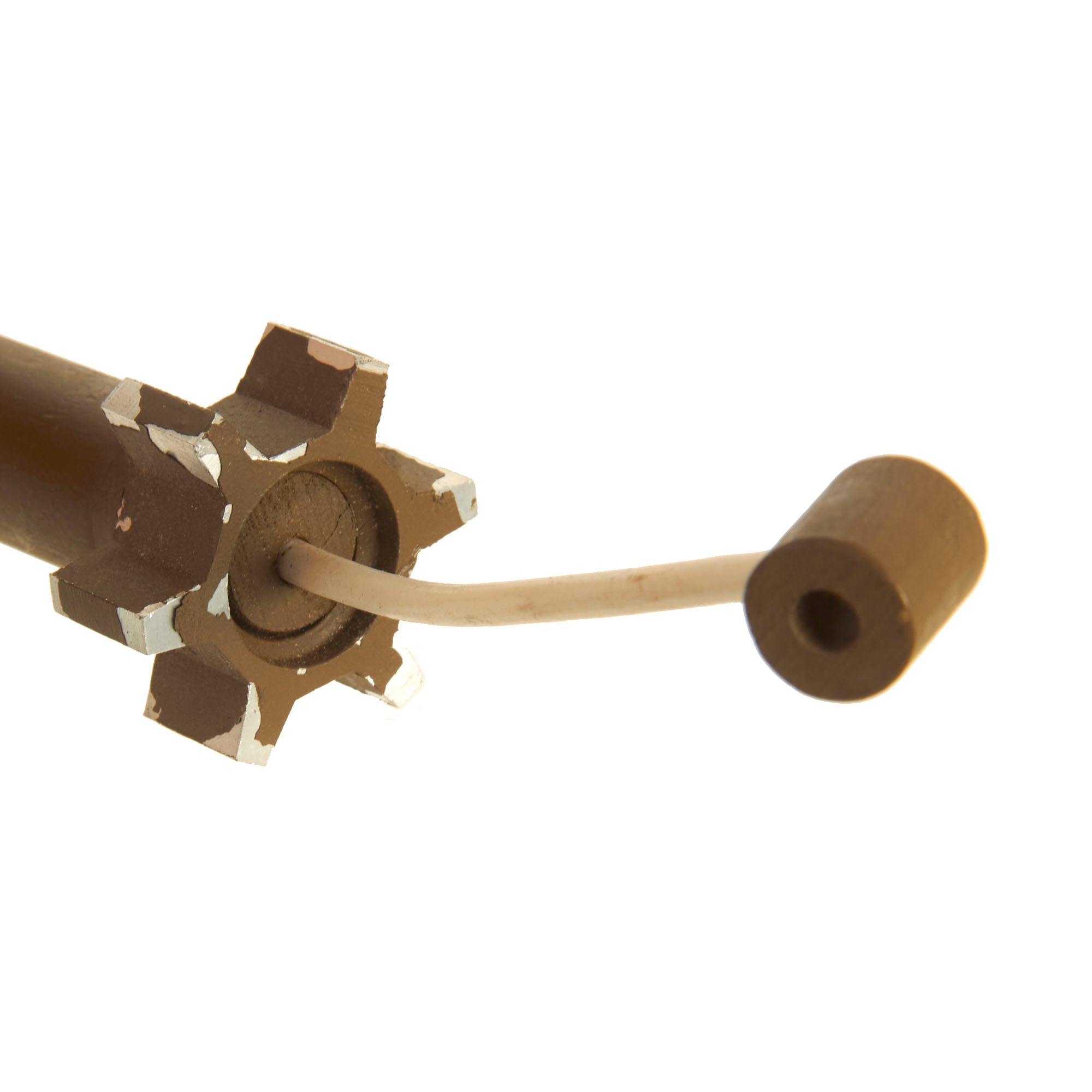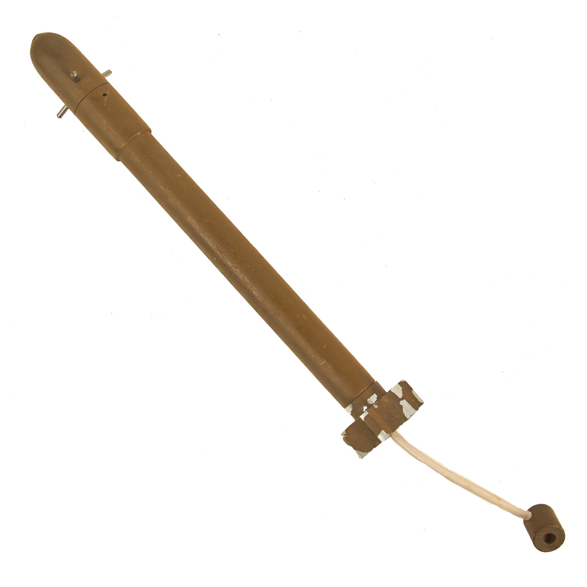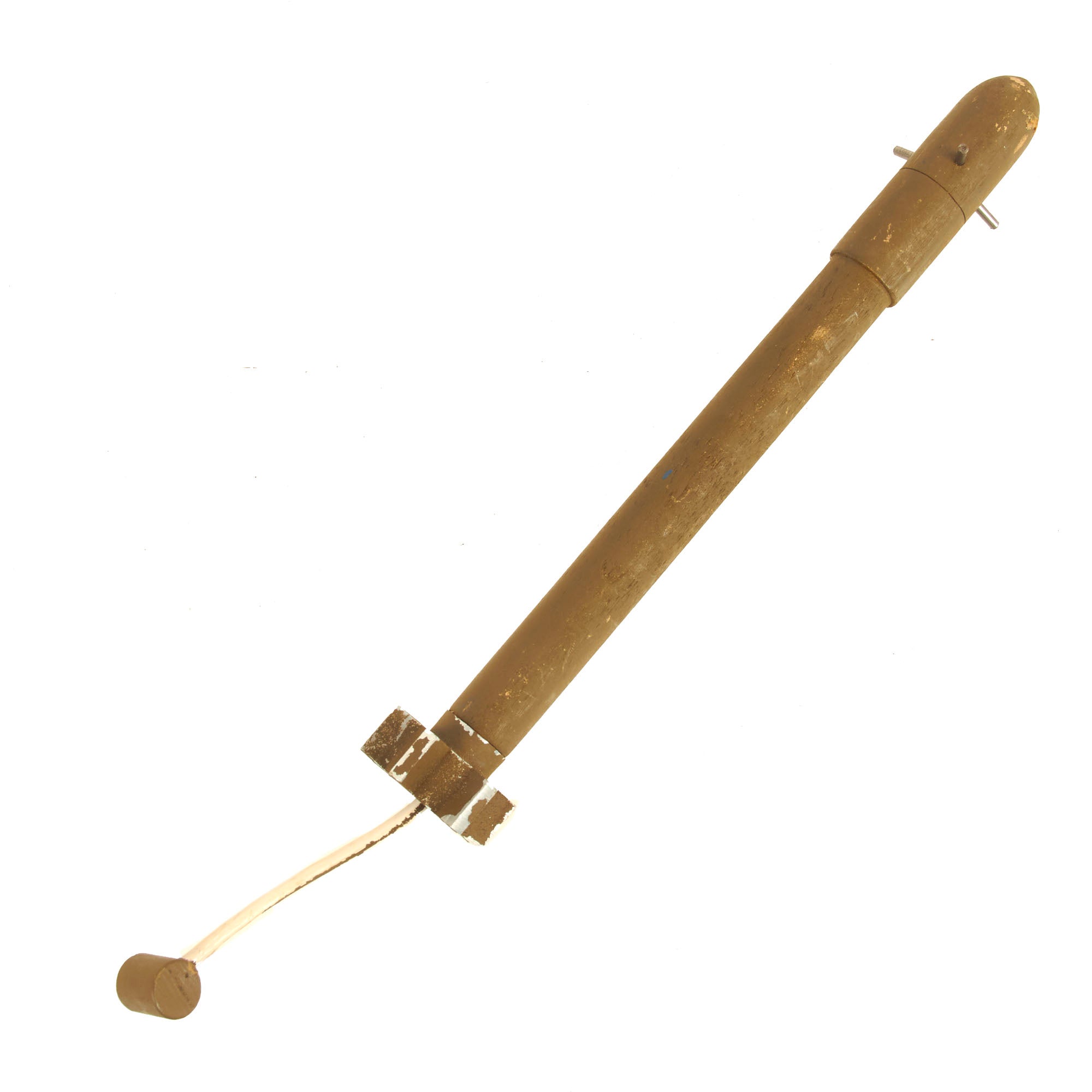 It is in good condition, still extends and even dry fires. Paint is still very good, and the instruction label is intact as well. Safety handle/cocking lever is still present and functional, and the cap has the retaining pin. Included with the launcher is a classroom familiarization subcaliber munition constructed from wood.