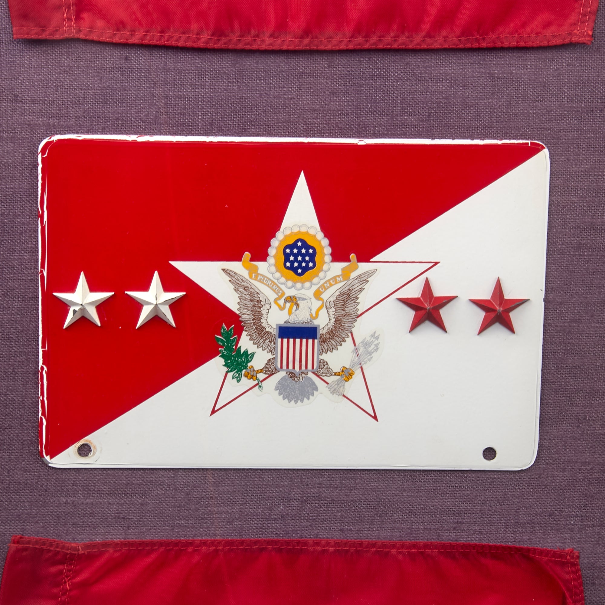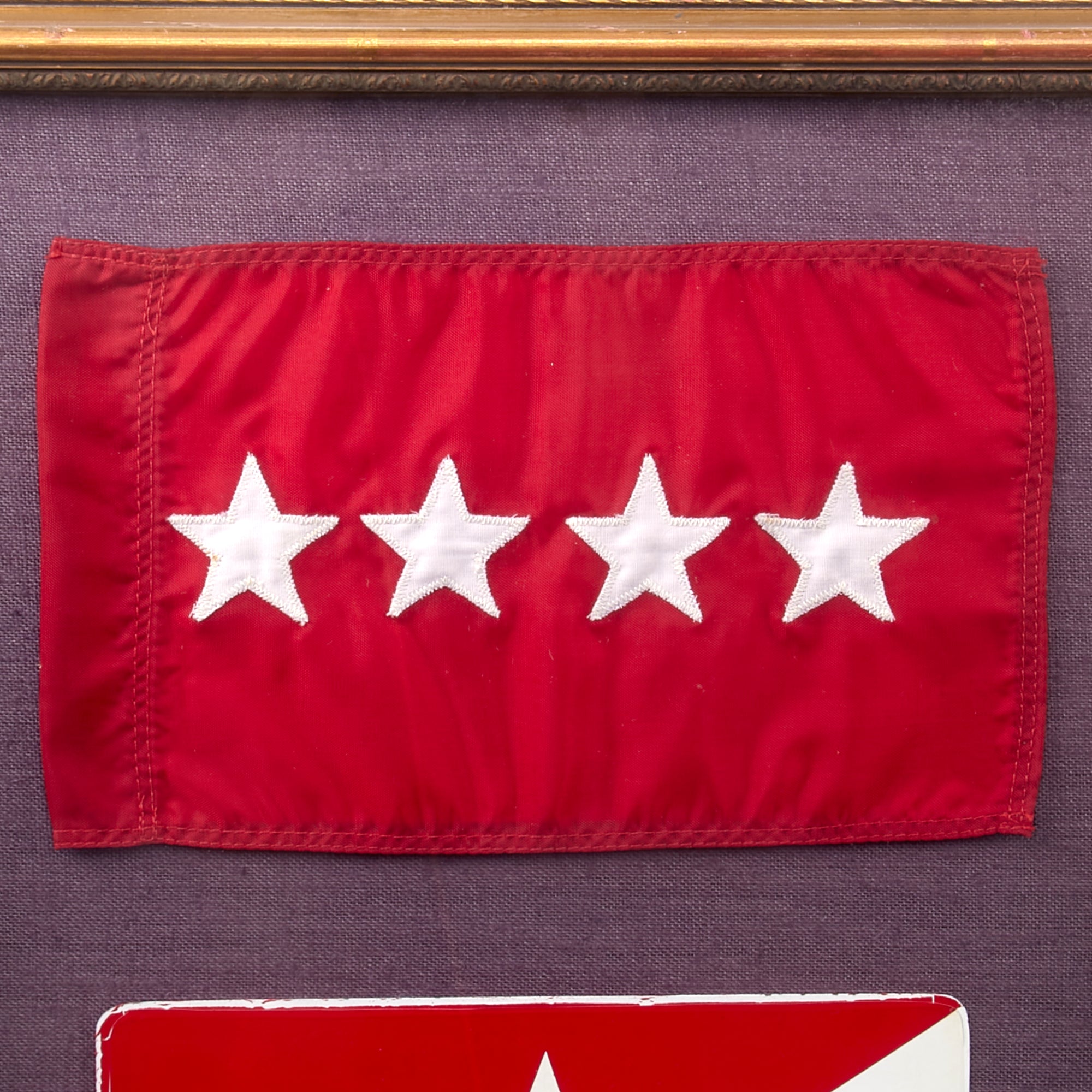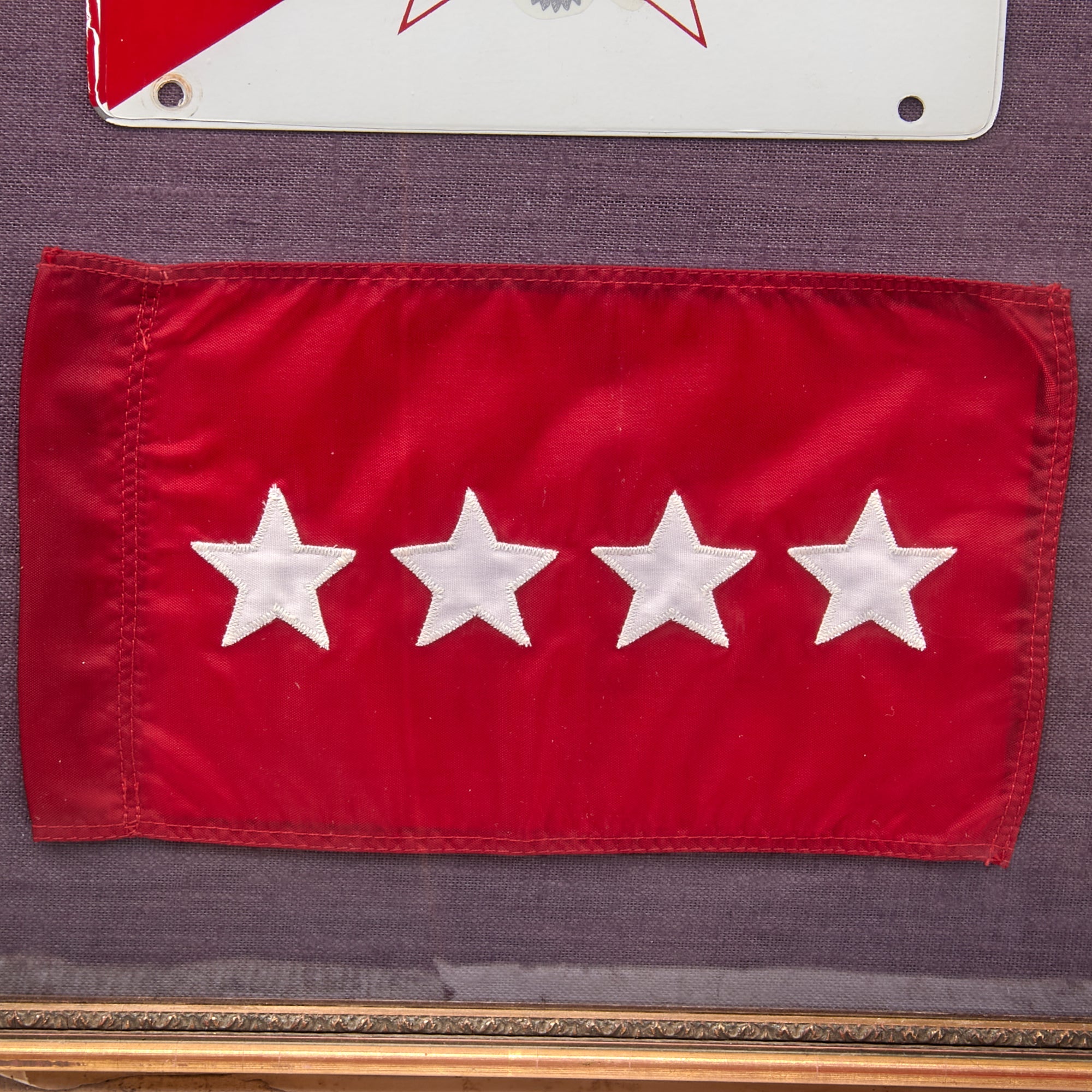 This is a tremendous framed set including a Military Vehicle Identification Plate for the U.S. Army Chief of Staff. The plate measures 6 x 9” and appears to be of the Vietnam War era, but we can’t say for certain. The frame also includes two 4-Star General vehicle pennants which are in great order with lovely embroidery.
