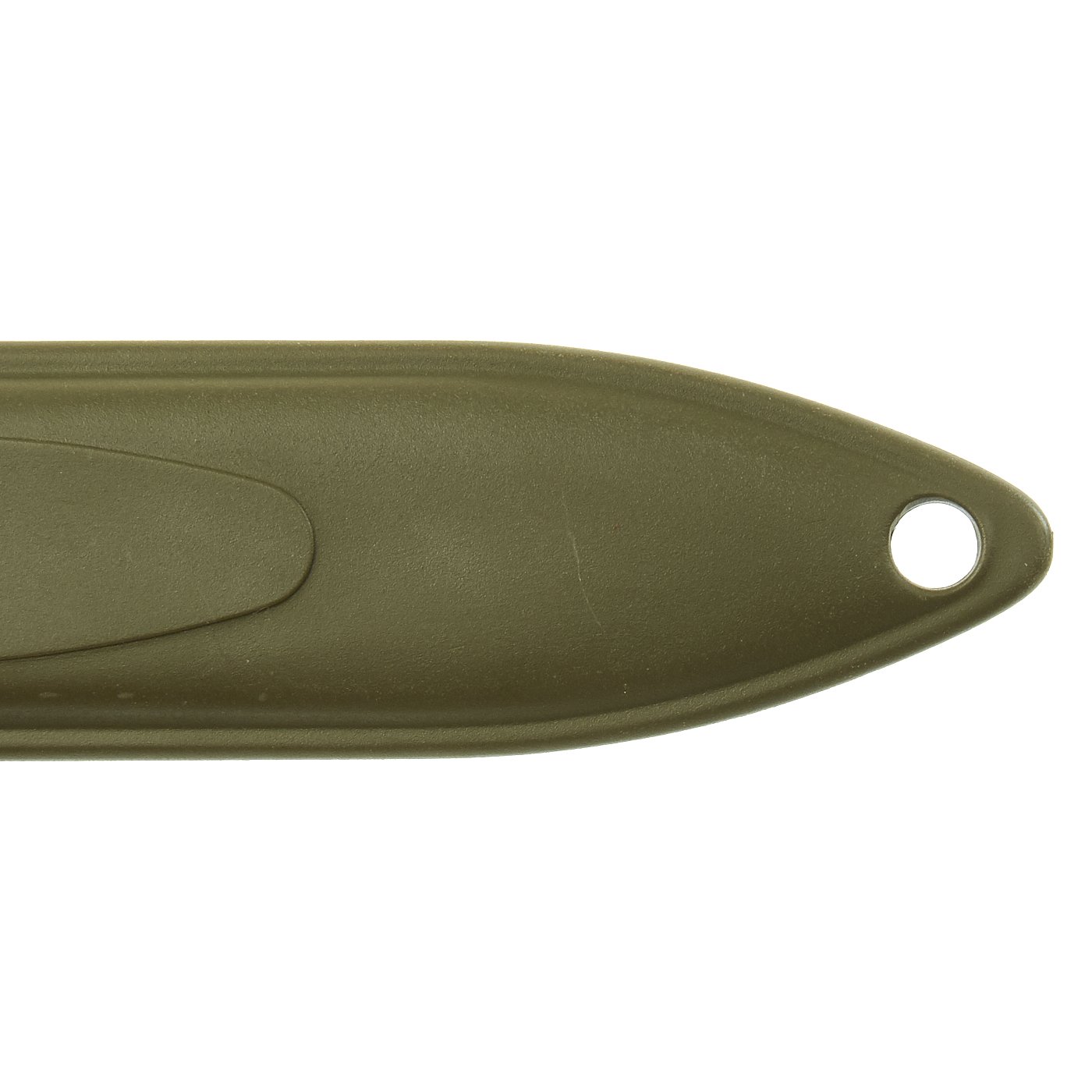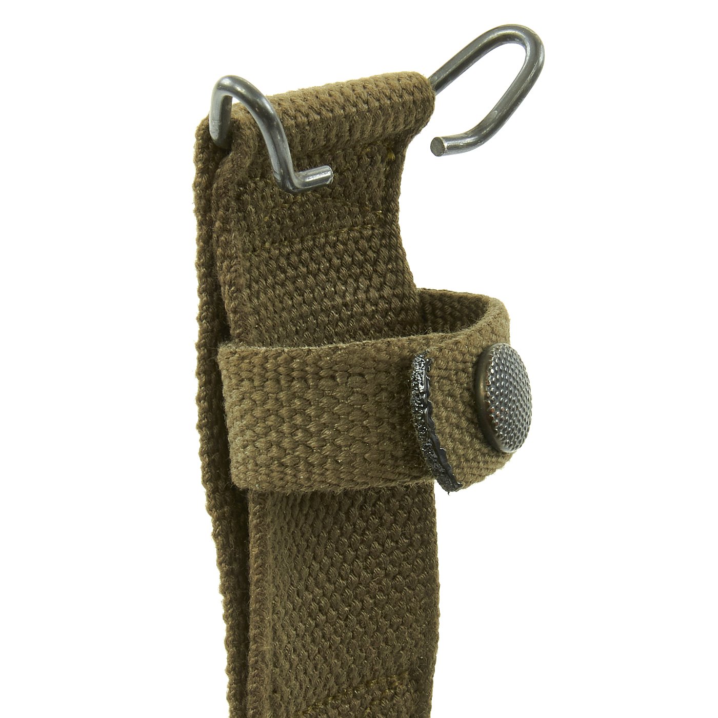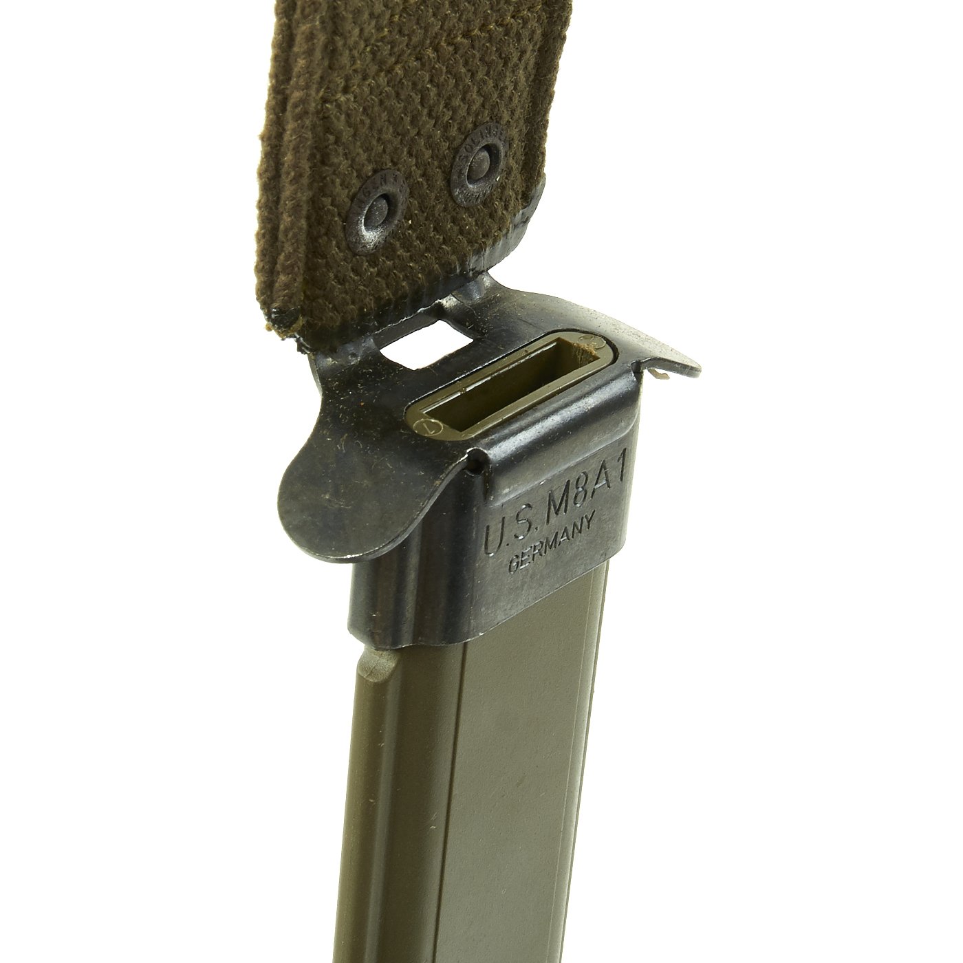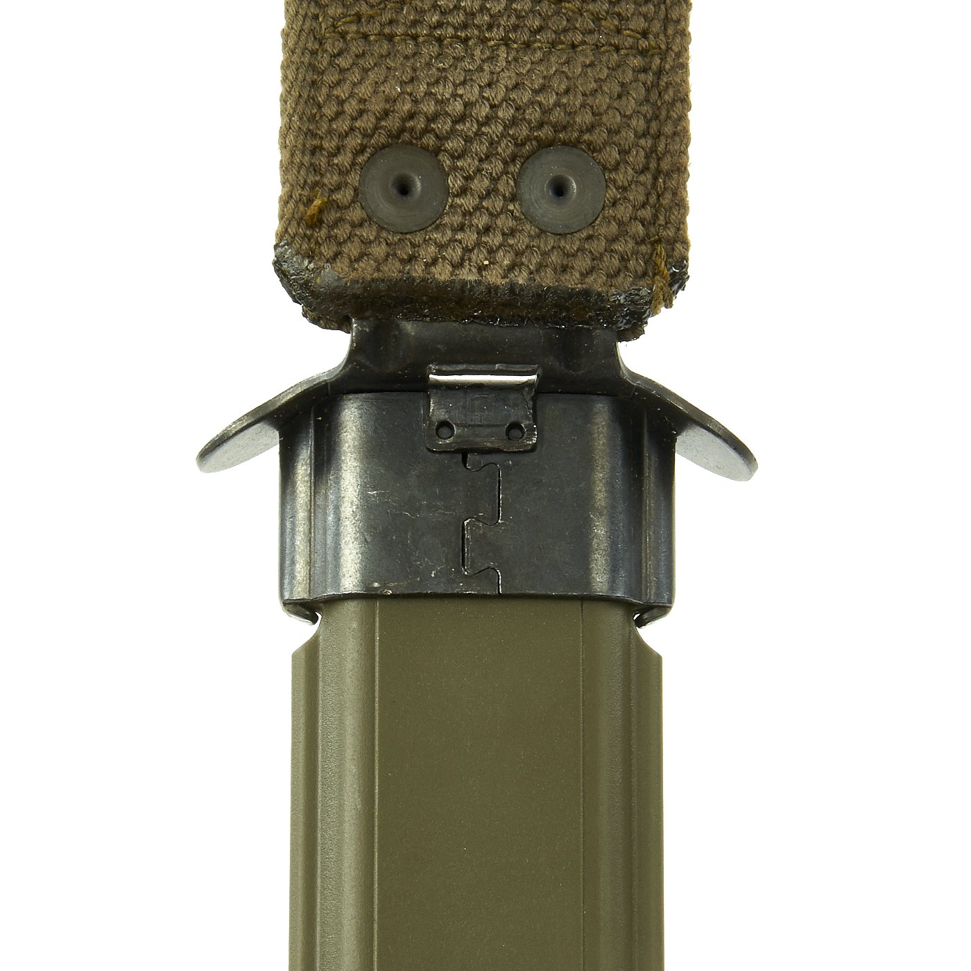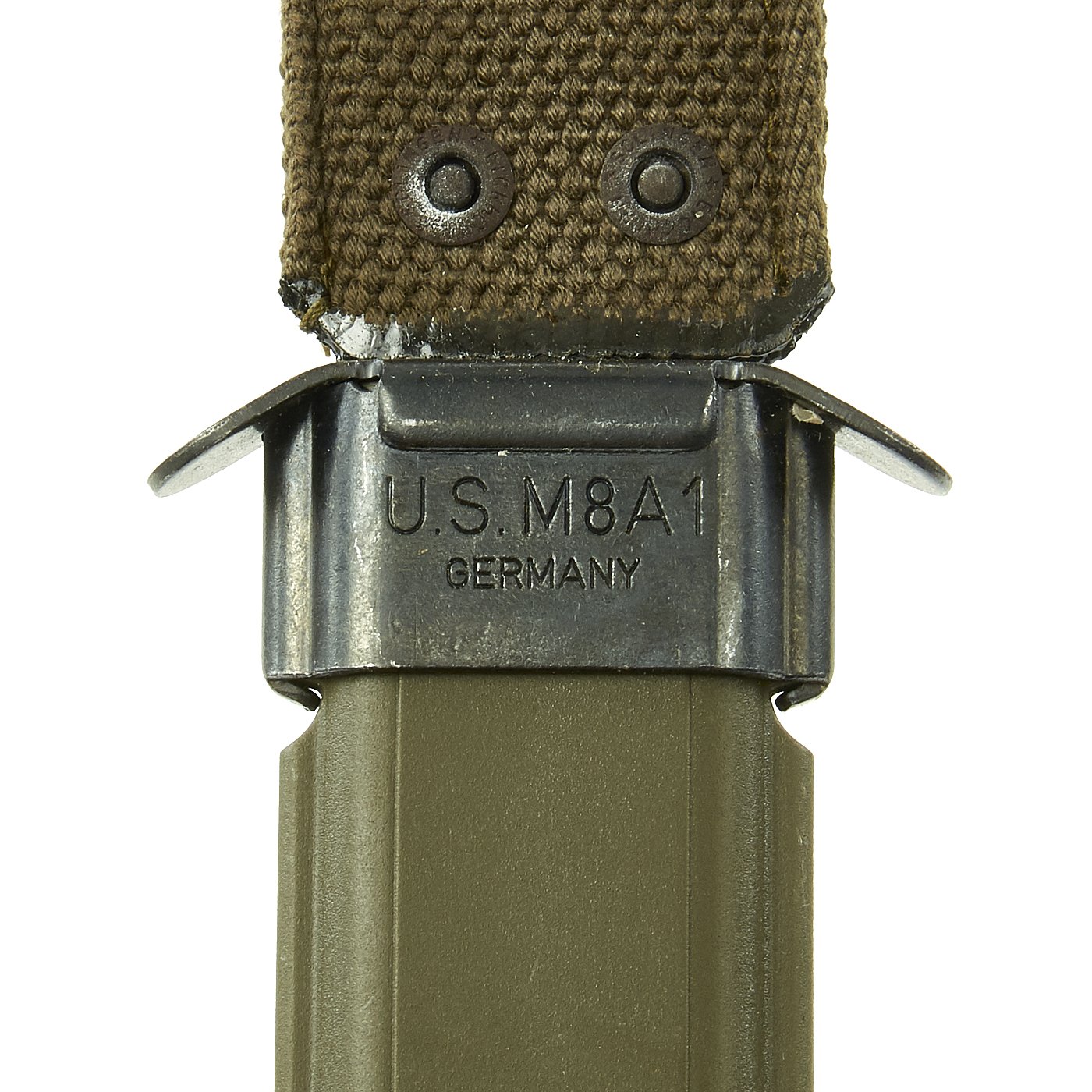 Comes with an OD green fiber scabbard marked U.S. M8A1 / GERMANY also in offered in very good condition. This later design features a hard plastic body, not thermoplastic impregnated cotton fabric, with a dark OD green canvas frog. The scabbard looks to pretty much be unissued.