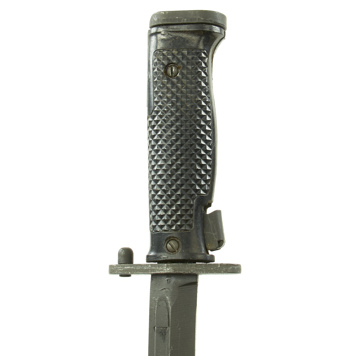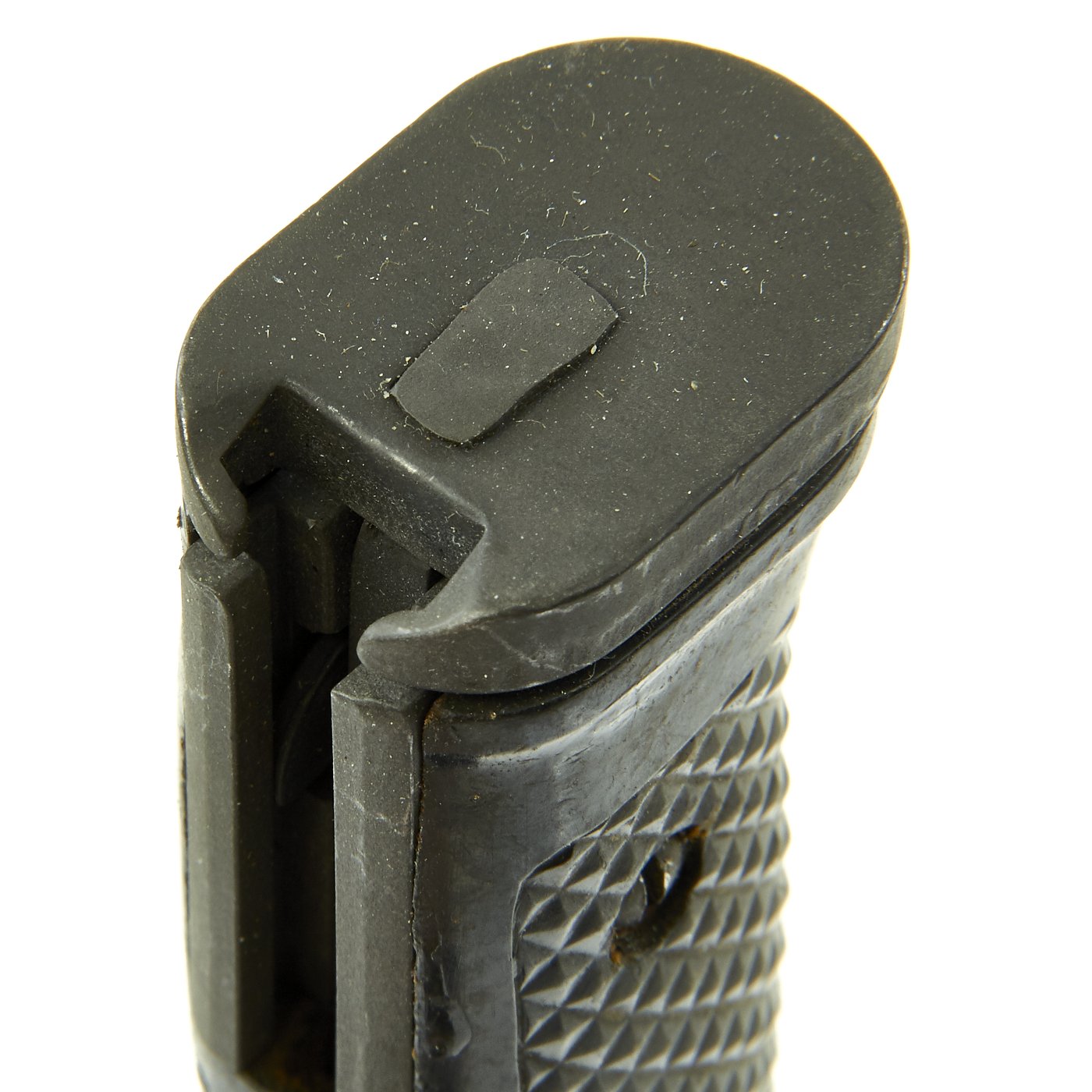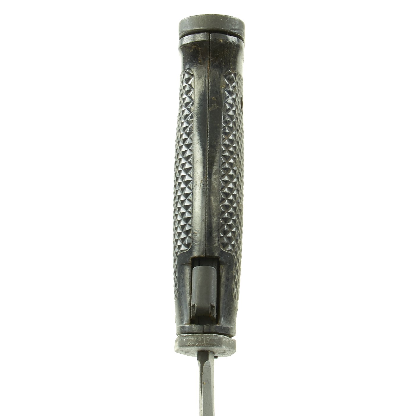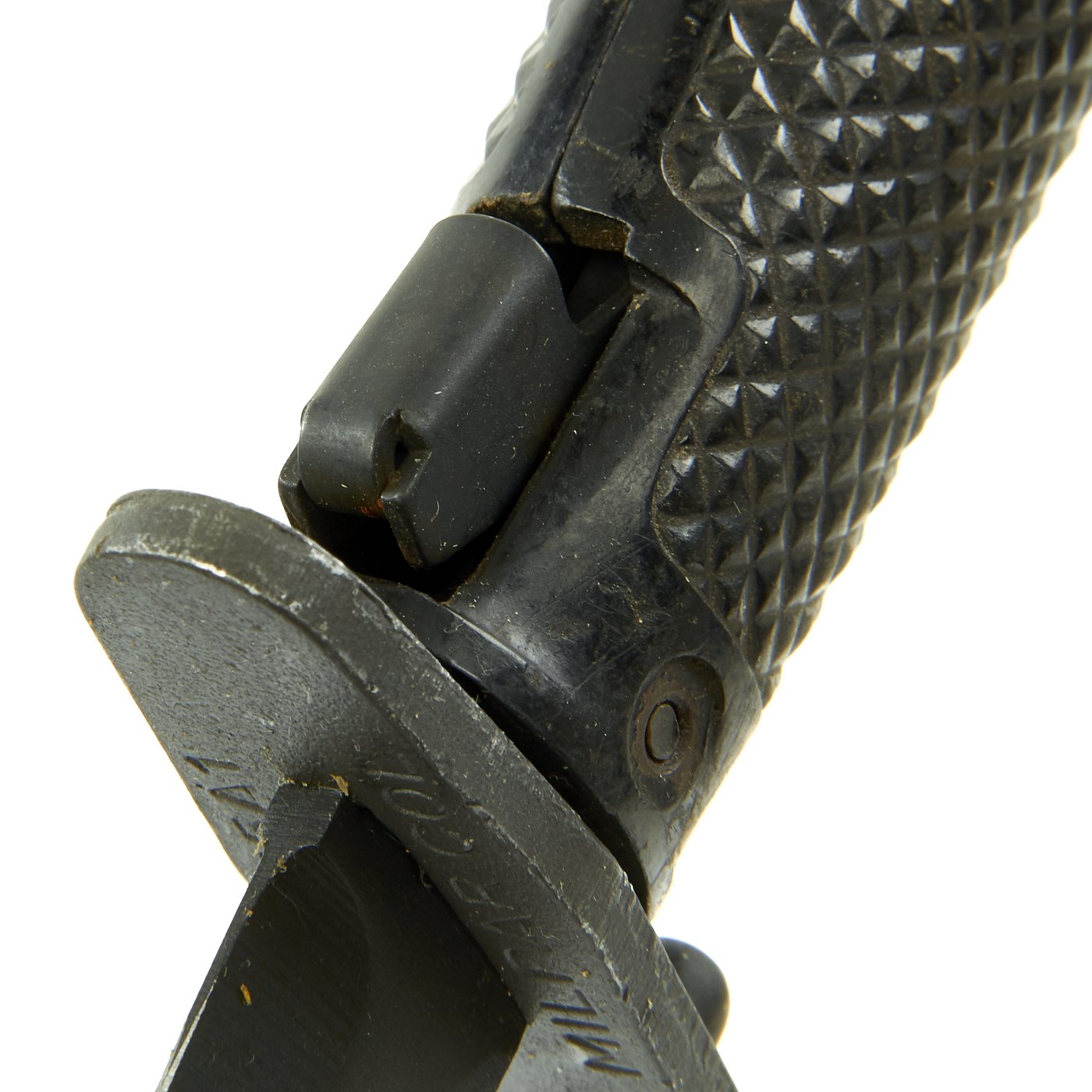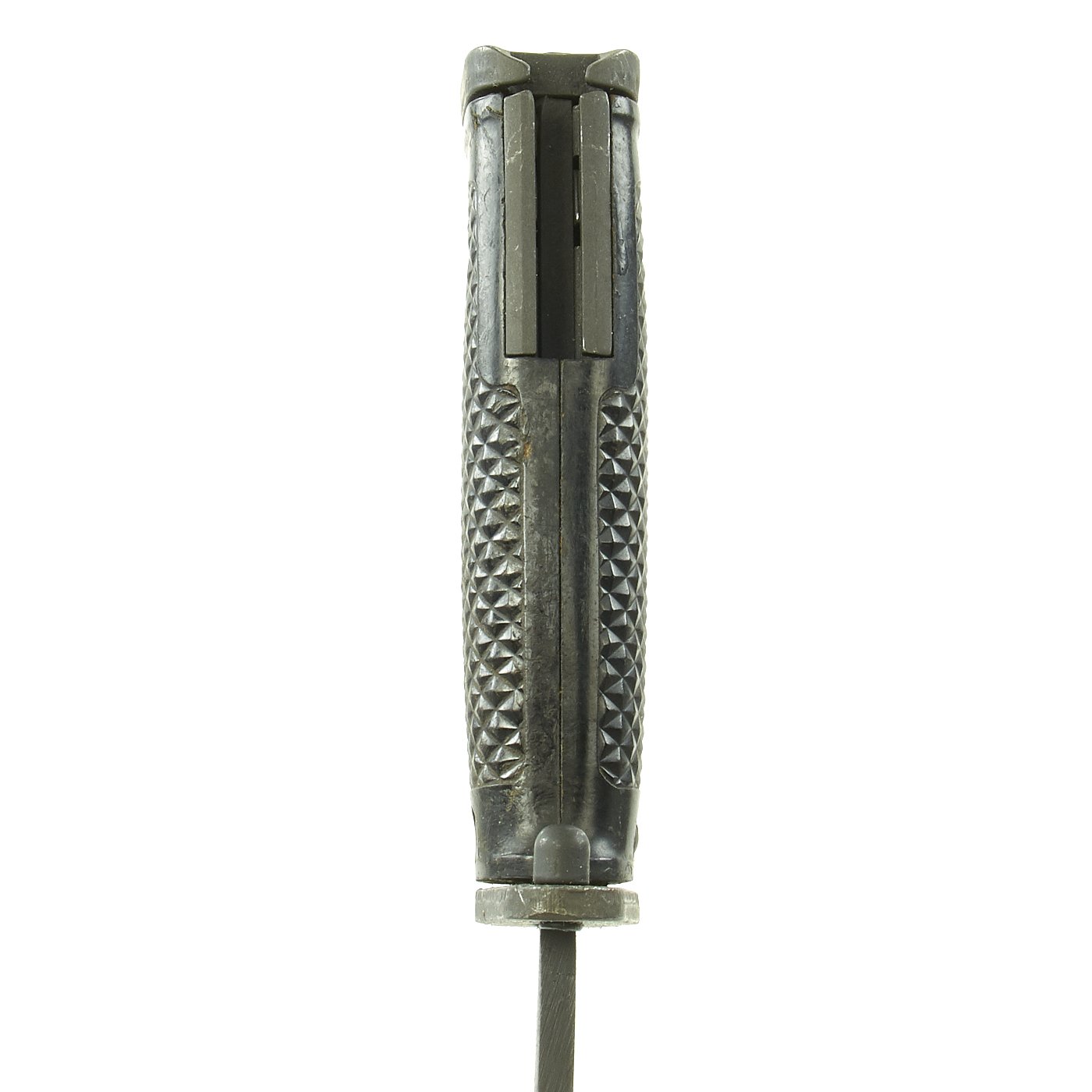 The bayonet has an excellent nearly unissued blade with the original phosphate finish. Zero post-manufacture sharpening that we can see, and the factory grind is still nice and bright. There is just a bit of runner wear on the finish, as is common with all edged weapons. The bayonet has the correct phenolic grips, which are in great shape. There is very little evidence of use anywhere on the bayonet.