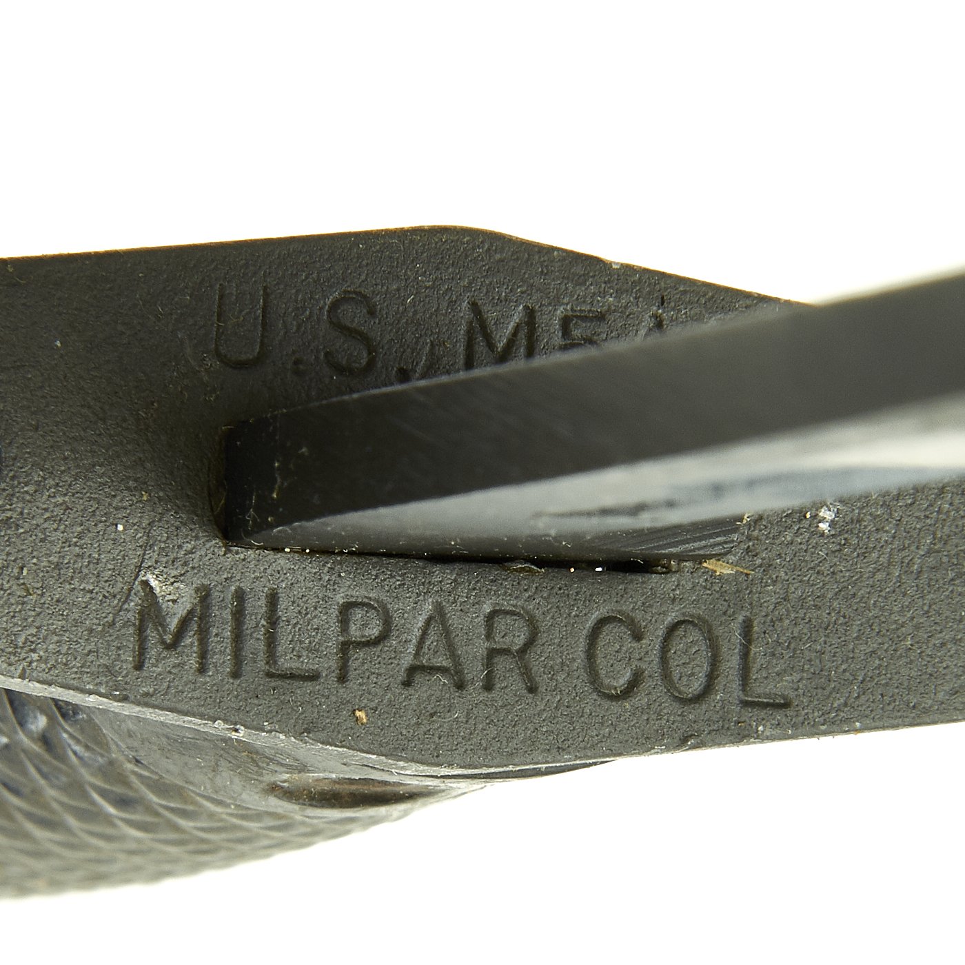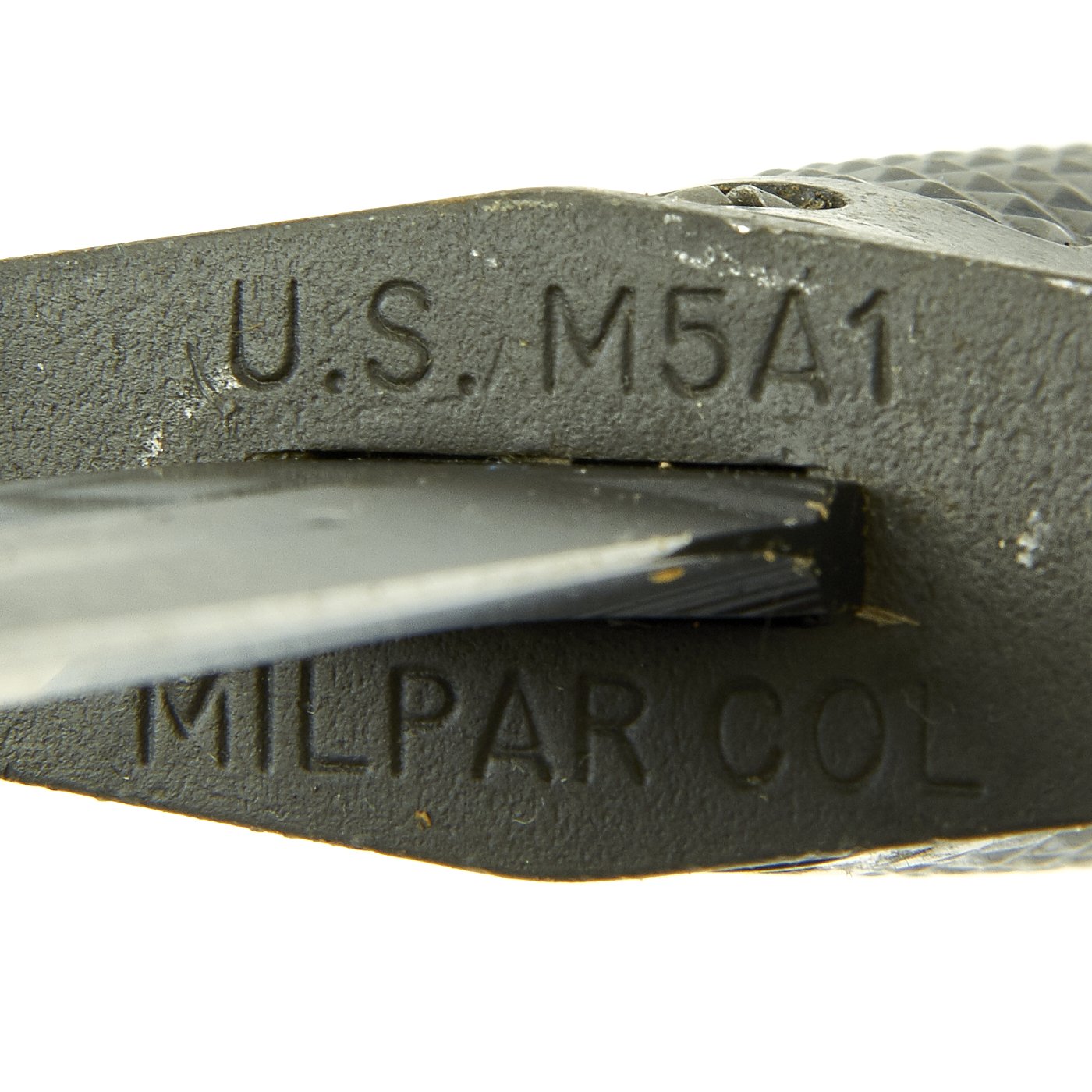 The cross guard is cicely marked U.S. M5A1 / MILPAR COL on the blade side of the cross guard. This indications manufacture by by the Columbus Milpar and Manufacturing Co., Columbus, OH.. They manufactured these bayonets concurrently with M6 bayonets for the M14 rifle they were producing, and they later made M7 bayonets for the M16 rifle. All of these used the same basic blade design, with different grips and attaching hardware.