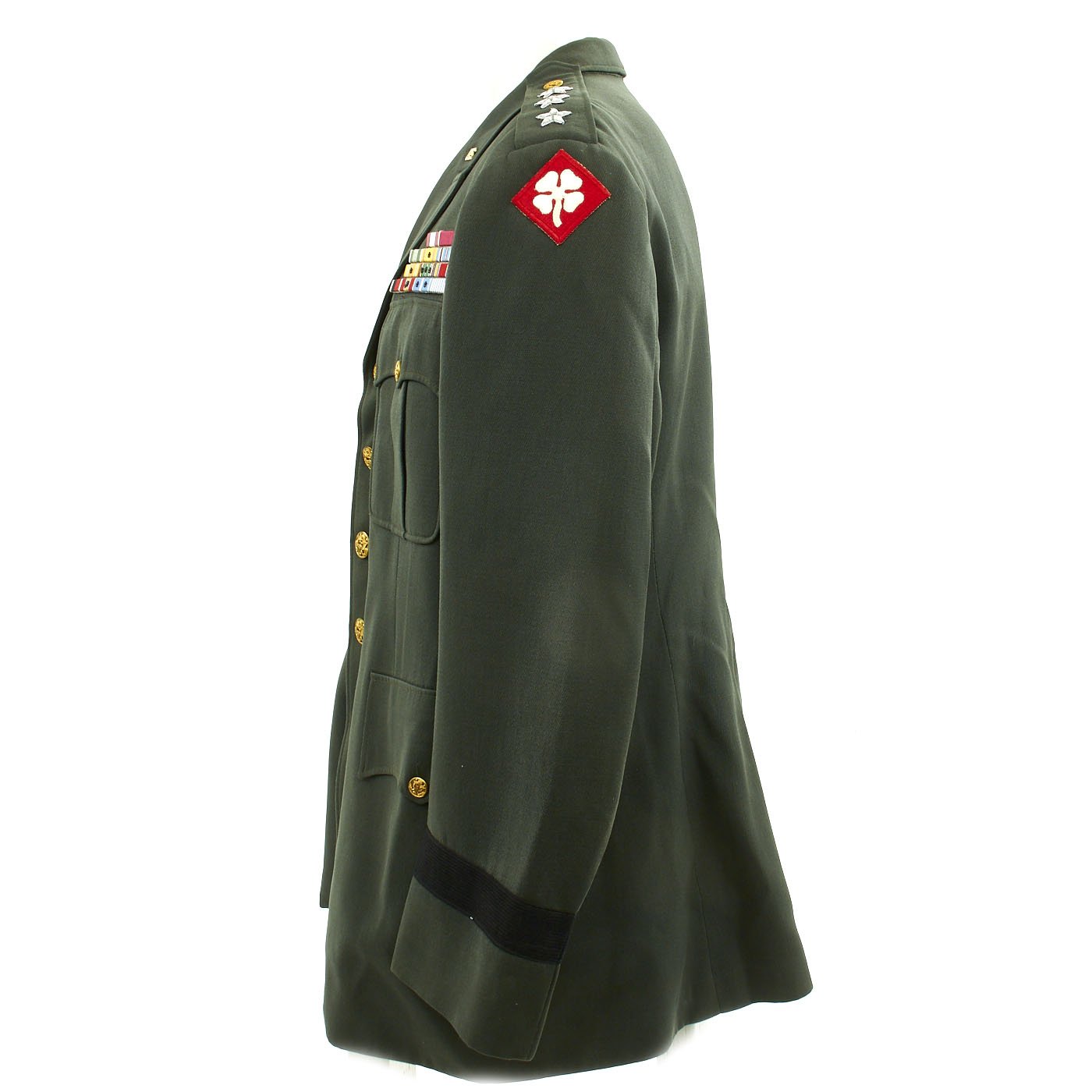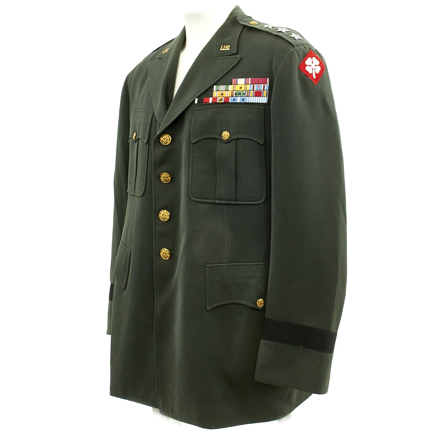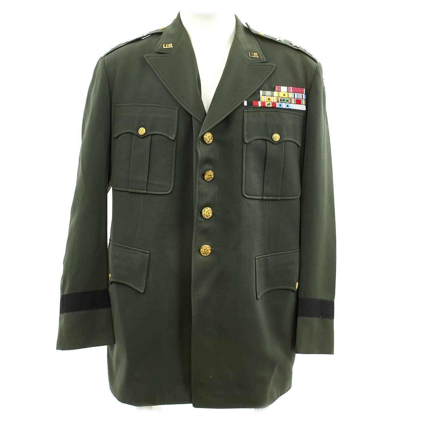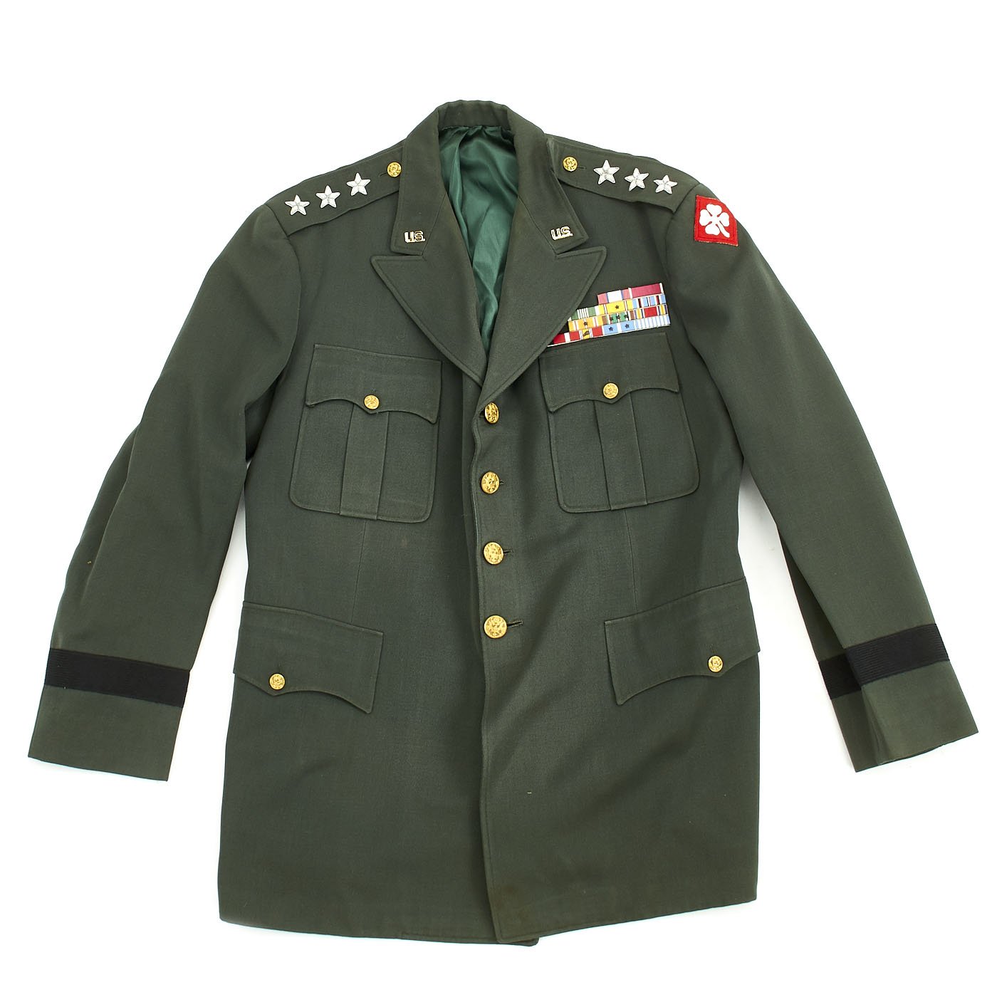 This Service Jacket and trousers is named on the inside tailor label to "Gen Colglazier". It is a large size approximately 42" US and offered in excellent condition. It is complete with bullion embroidered Lieutenant General three stars to the epaulets, medal ribbon bar and Fourth United States Army insignia patch. In 1964 he became the Commanding General of the Fourth US Army. The tailored pants are also included. This uniform dates from the Vietnam War Era. Both the jacket and pants are offered in excellent condition.
