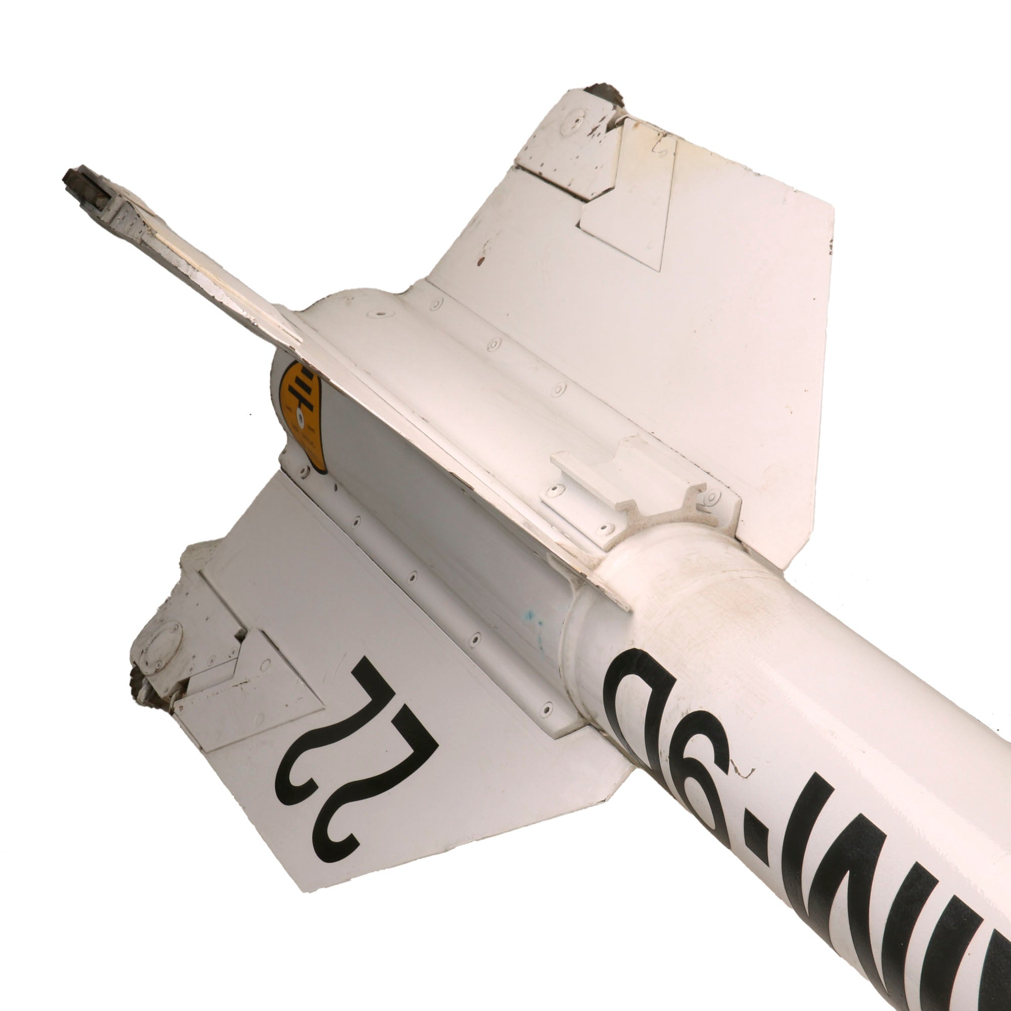 The missile overall is in fair condition with the expected heavy scuffing and loss of material in some of the decals, but the white paint has held up considerably well, with some areas developing a lovely patina.