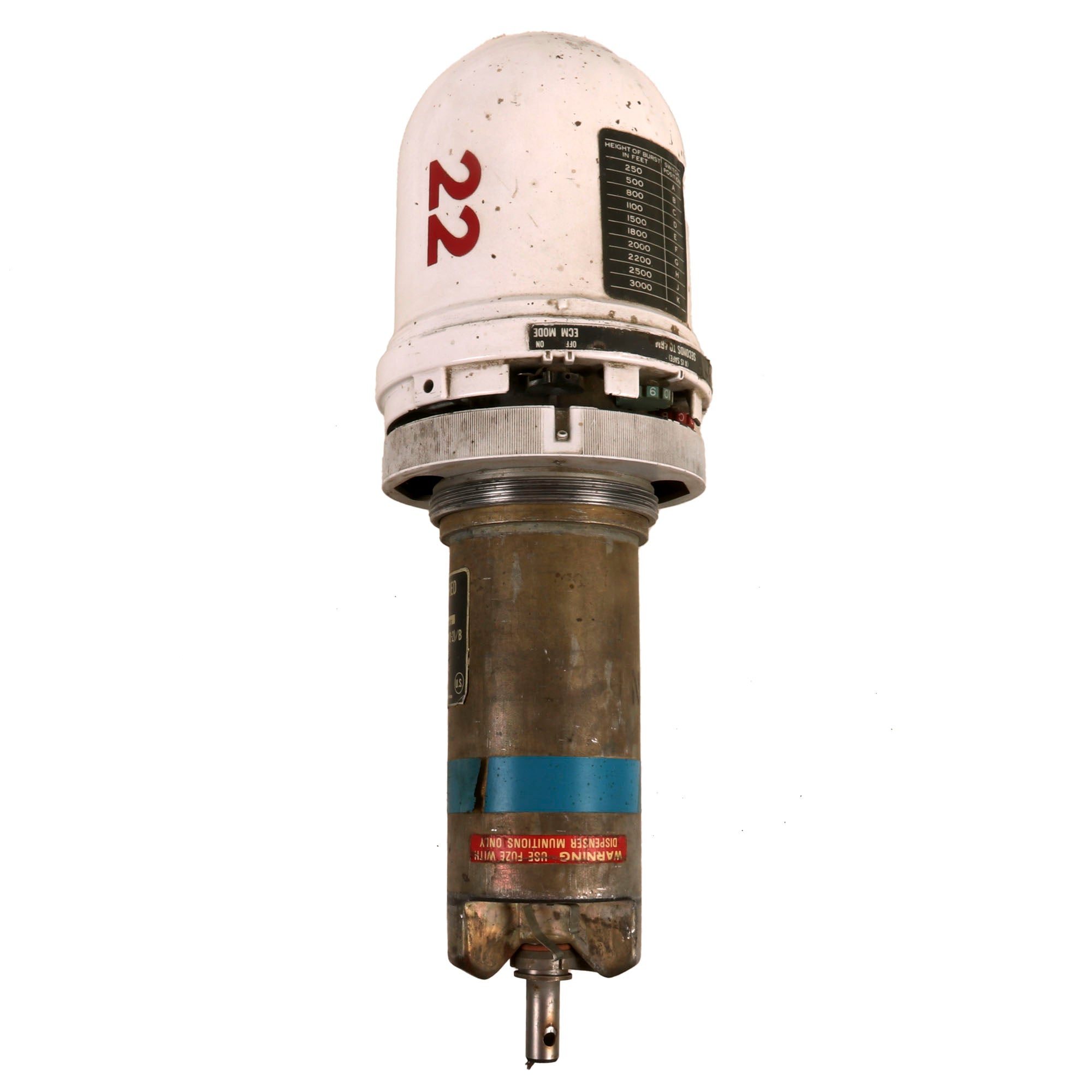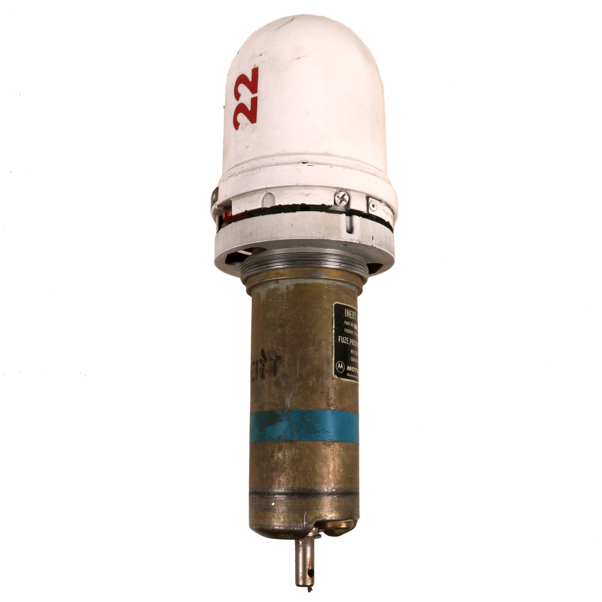 This is a truly stunning piece of ordnance, an AIM-9B “Sidewinder” missile, one of the most well-known air-to-air missiles ever developed. This example had decals applied identifying it as an AIM-9D, but from the style of tail fin attachment, we are certain that the missile was originally an AIM-9B. This example came to us out of a now-defunct museum which appears to have altered the missile, affixing it with a FMU-56D Proximity Fuze - incorrect for this model. The proximity fuze still unscrews and measures roughly 16” long. It also retains its data plate: