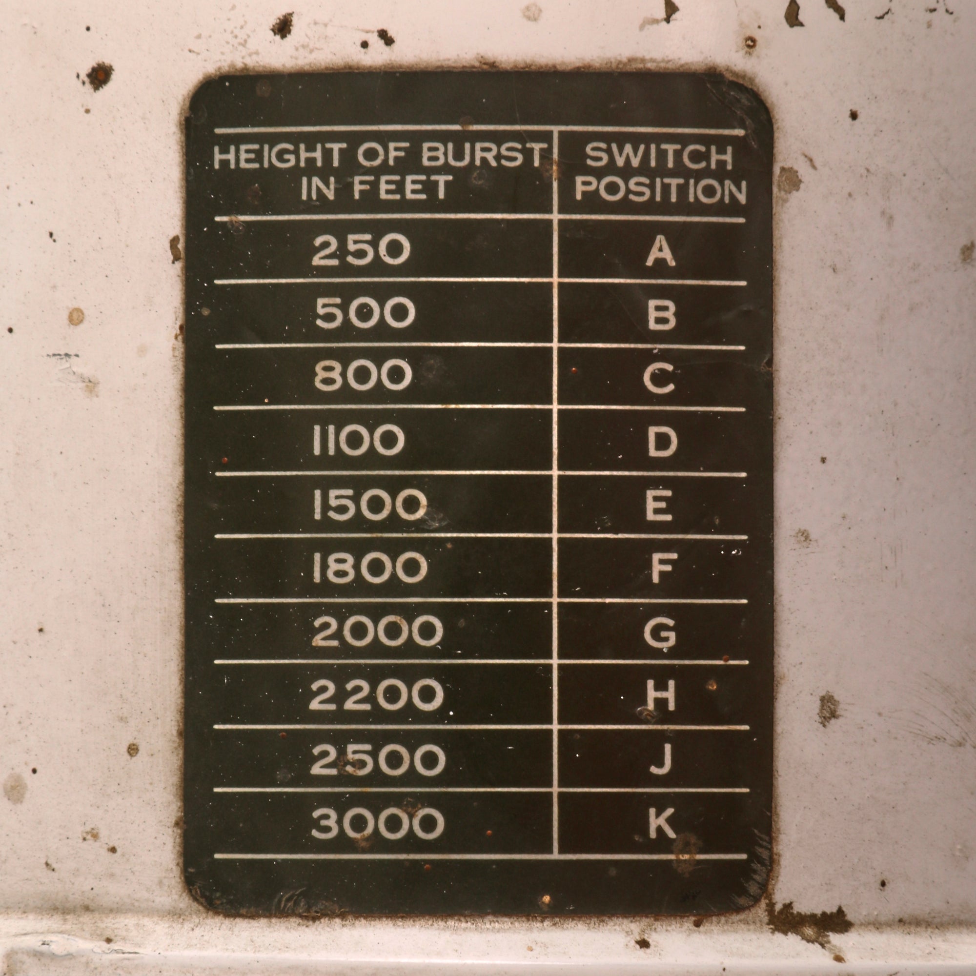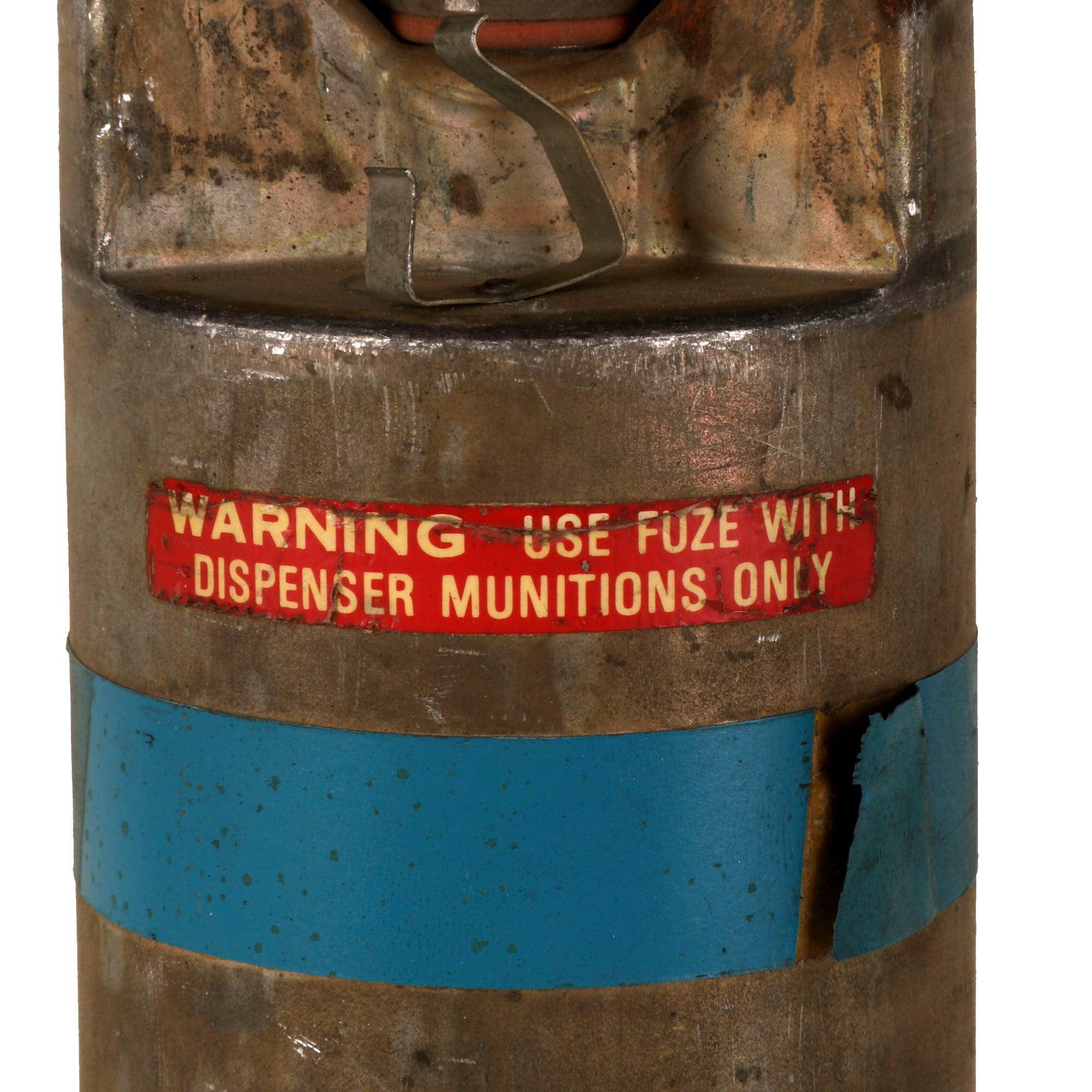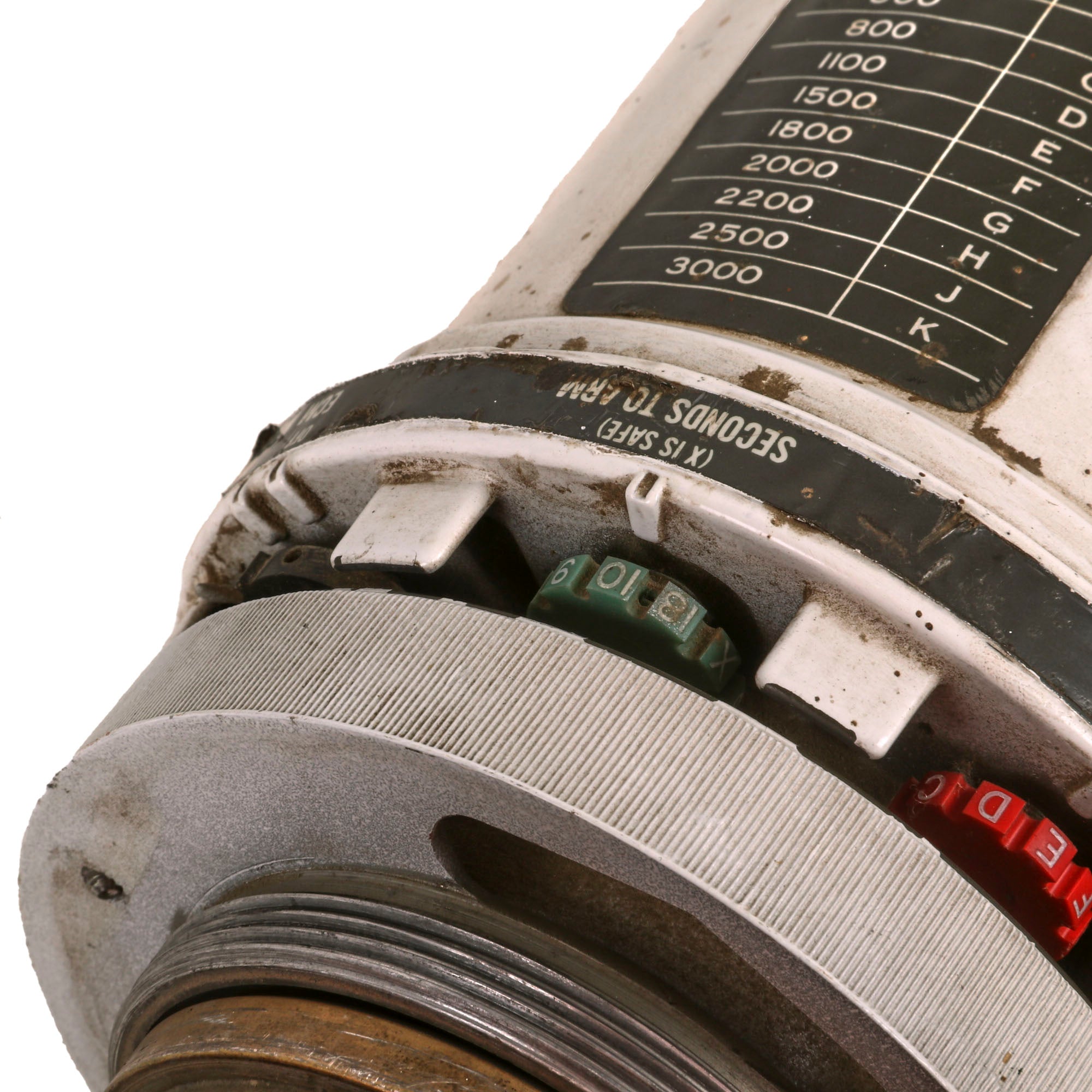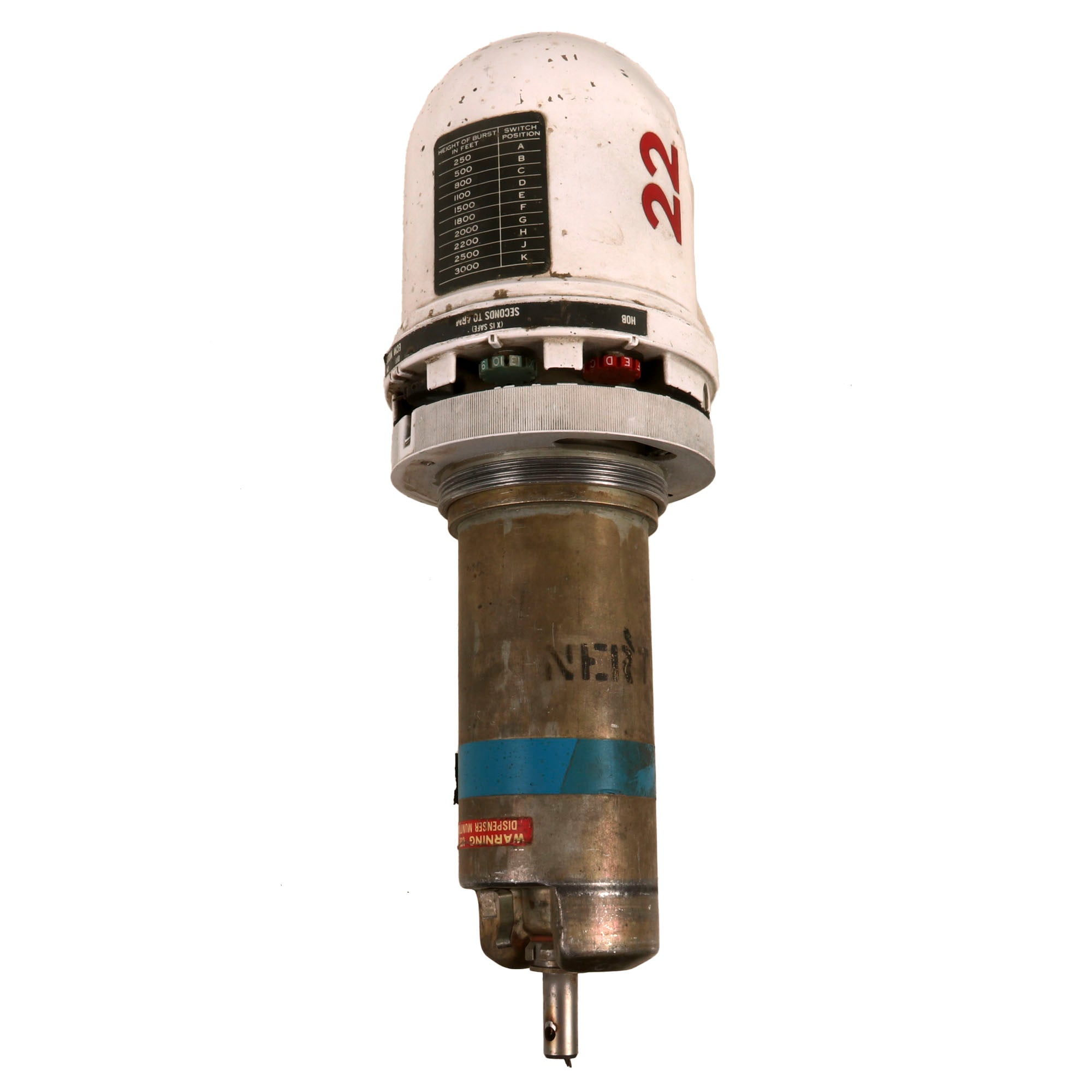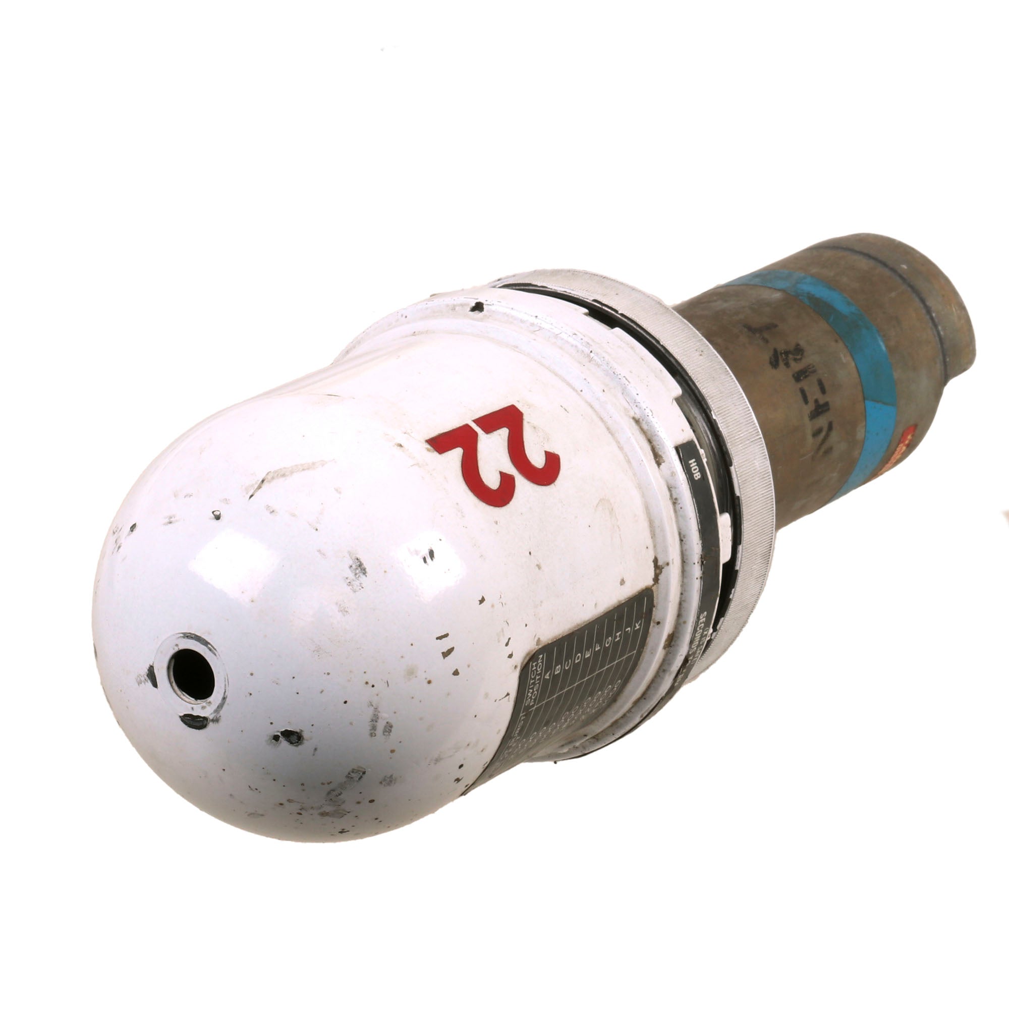 The fuze still retains its switch position reference plate on the head, with the three “wheels” still intact. Prior to flight, these selector switches would be set to the correct positions. This fuze is incorrect for the Sidewinder missile, which utilizes an Infrared Proximity Fuze, otherwise referred to as “Heat-Seeker”. Additionally, the thin-skinned honeycomb fins are incorrect for the Sidewinder, so we believe the top 1/4th of the missile to have been added from a different model for display. The entire missile as it stands now measures roughly 95 x 25 x 25”, and weighs 76lbs.
