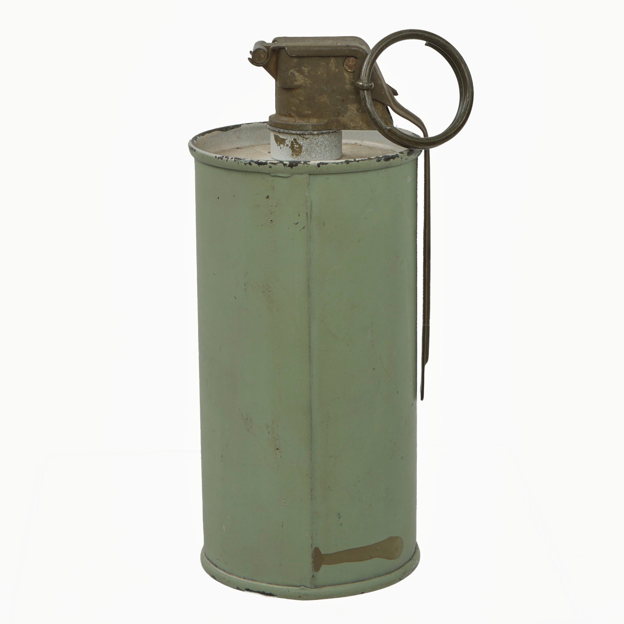 This is a great example of the scare AN-M8 (HC) smoke grenade. It is used for smoke screening, target marking, and signalling, although the M18 colored smoke grenades are mainly used for the latter. HC stands for Hexachloroethane. The AN-M8 hand grenade produces harmful hydrochloric fumes that irritate the eyes, throat, and lungs.