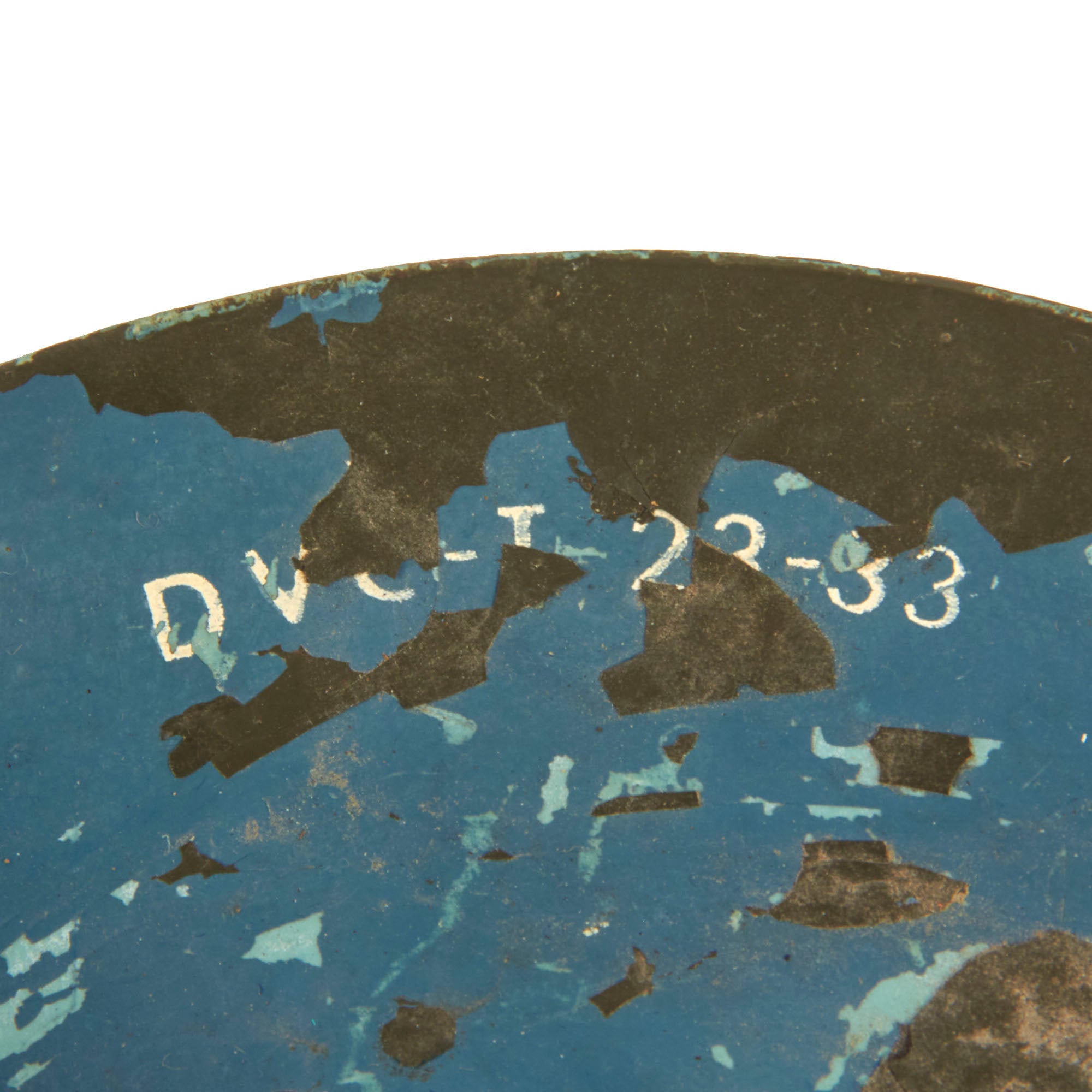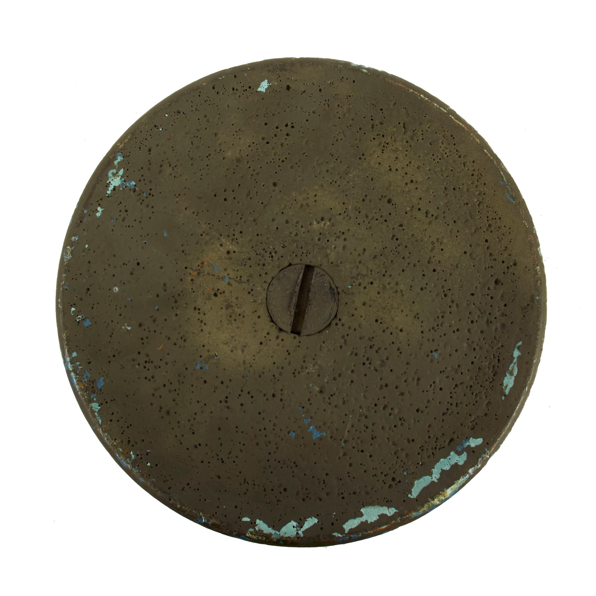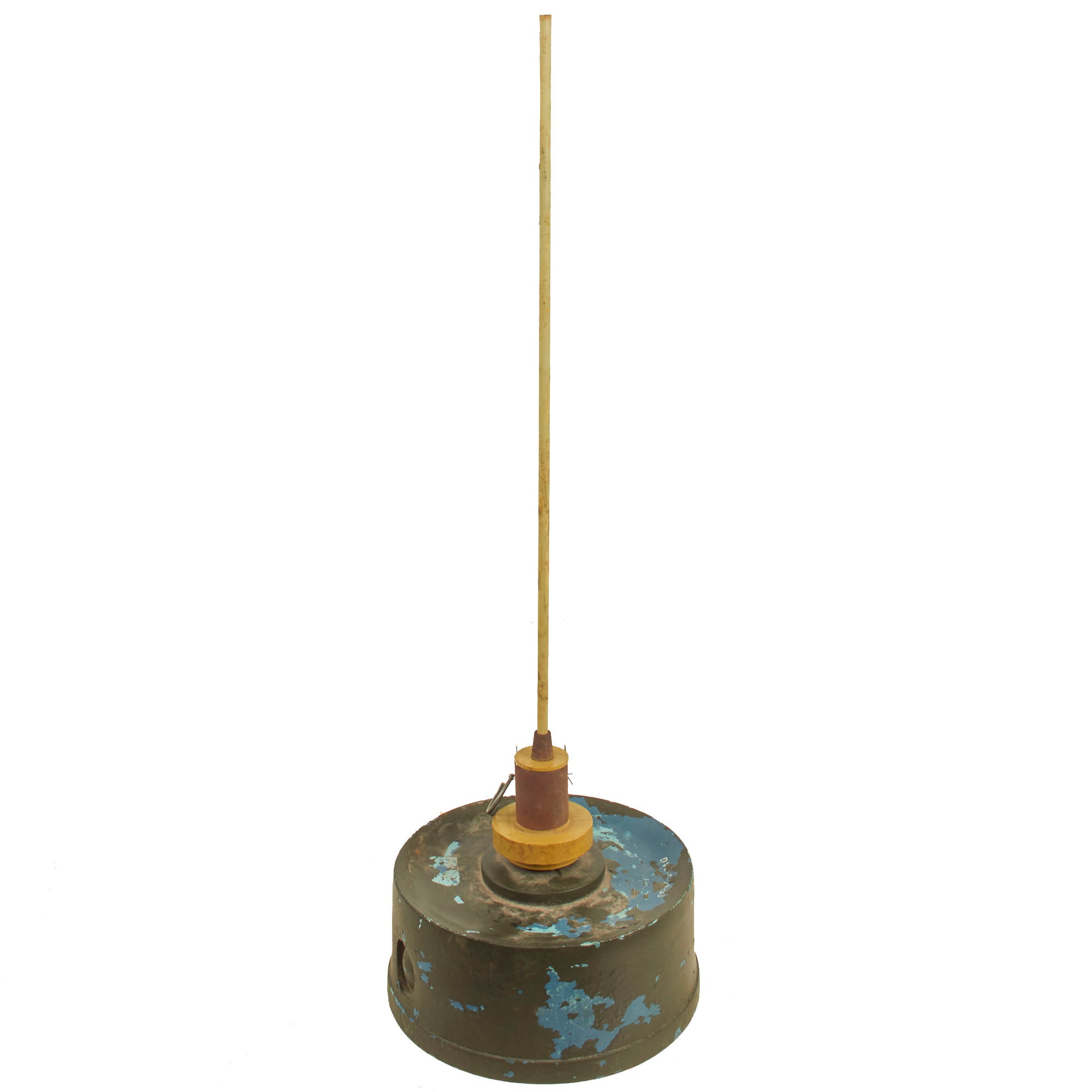 Original Item: Only One Available. This is a wonderful example of a repainted M21 Anti-Tank practice mine, complete with deactivated M607 pressure fuse and tilt rod. The mine is in great condition aside from the OD green repaint and does have some minor denting, consistent with service use. The body of the mine measures 8 1/4" in diameter by 4", and the tilt rod is 21 inches in length.