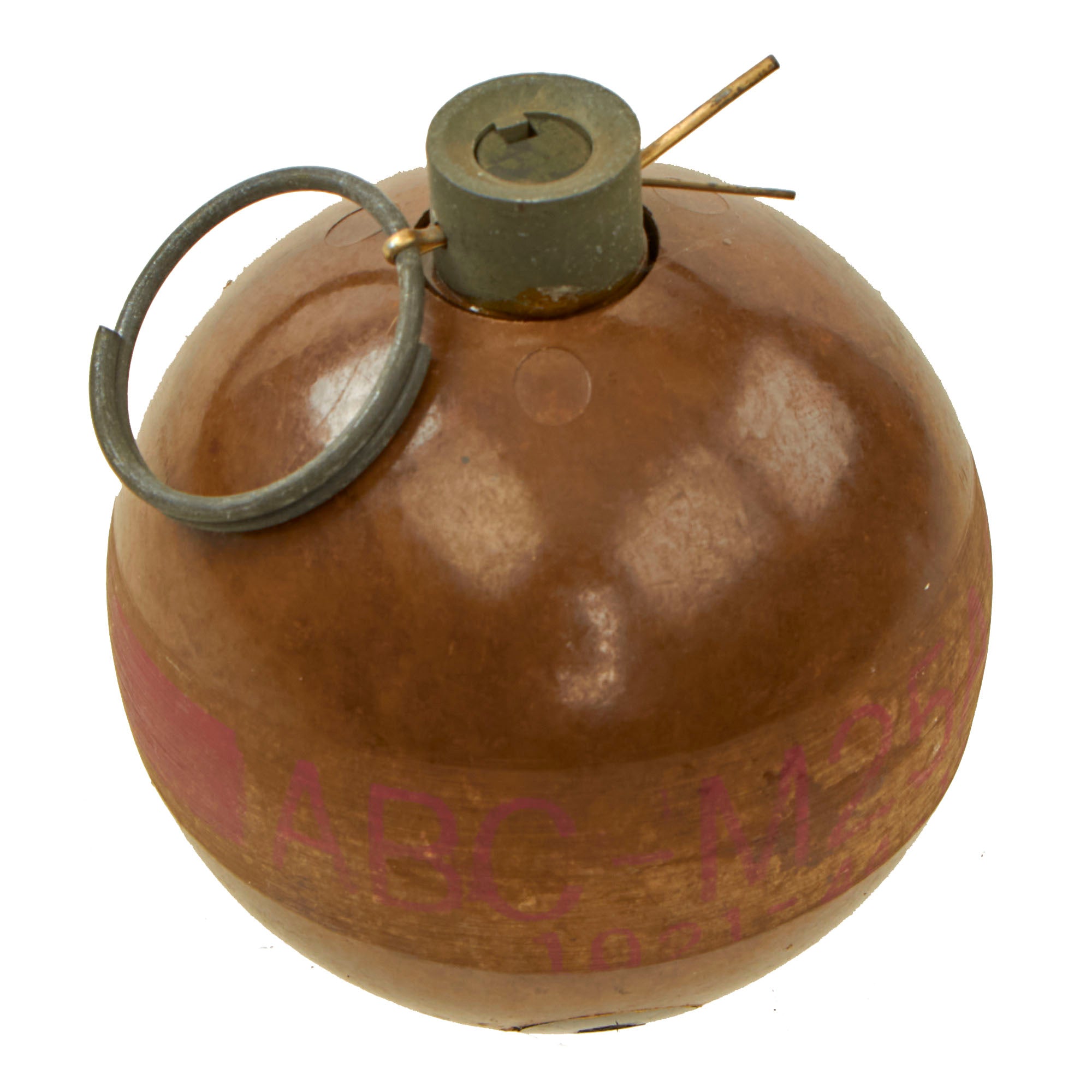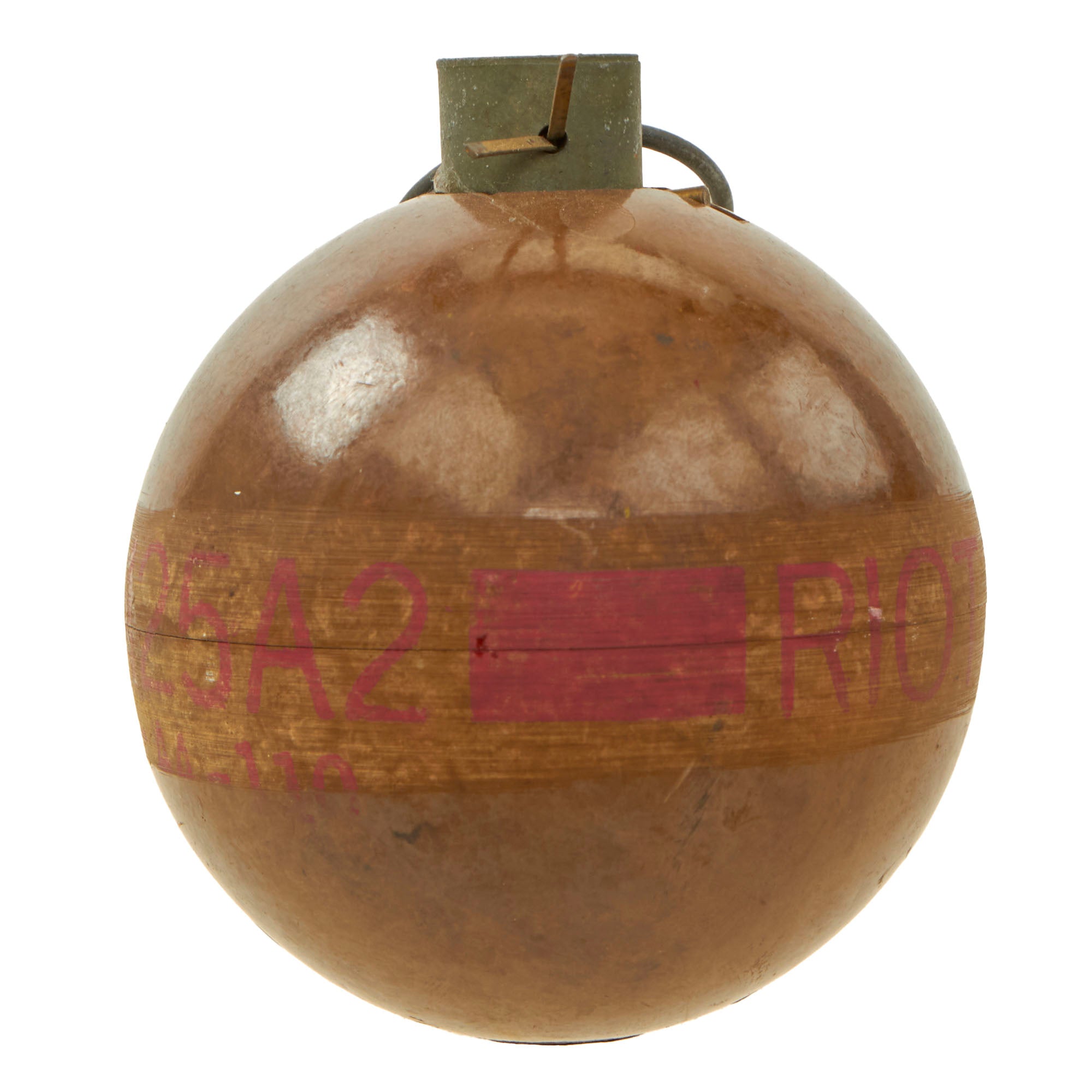 Original Item: Only One Available. This is a lovely example of the bursting type, plastic CS “Riot Control” grenade known as the M25A2. The grenade is in wonderful condition and appears to have no damage to the phenolic plastic type body. The grenade retains most of the original markings in red paint making this a fantastic offering.Unloaded or dummy grenades, artillery shell casings, and similar devices, which are cut or drilled in an BATF-approved manner so that they cannot be used as ammunition components for destructive devices, are not considered NFA weapons. This example is in total compliance and is NOT AVAILABLE FOR EXPORT.Hand grenade riot CS1, ABC-M25A2 is a bursting type riot control agent grenade and may be used to simulate casualty agents during training.The grenade has a powerful lachrymal effect and is irritating to the upper respiratory passages, causing coughing, difficulty in breathing and chest tightness. Heavy concentrations will cause nausea and vomiting as well. The onset of incapacitation is 15 to 30 seconds and duration from 30 minutes to several hours depending upon the dosage concentration. CS is more persistent and has a more severe reaction than CN. The grenade body is spherical and is made of two plastic hemispheres attached together. The two pieces together form a burster well and slider housing.The fuze is a pyrotechnic delay-detonating type integral with the grenade body. The fuzing components consist of an arming sleeve, arming pin, firing spring, slider assembly, and firing pin. The slider assembly contains a primer, pyrotechnic delay column, and a detonator which are not present. The grenade is assembled with a safety pin and pull ring which is still present on this example.A lovely example ready for further research and display.