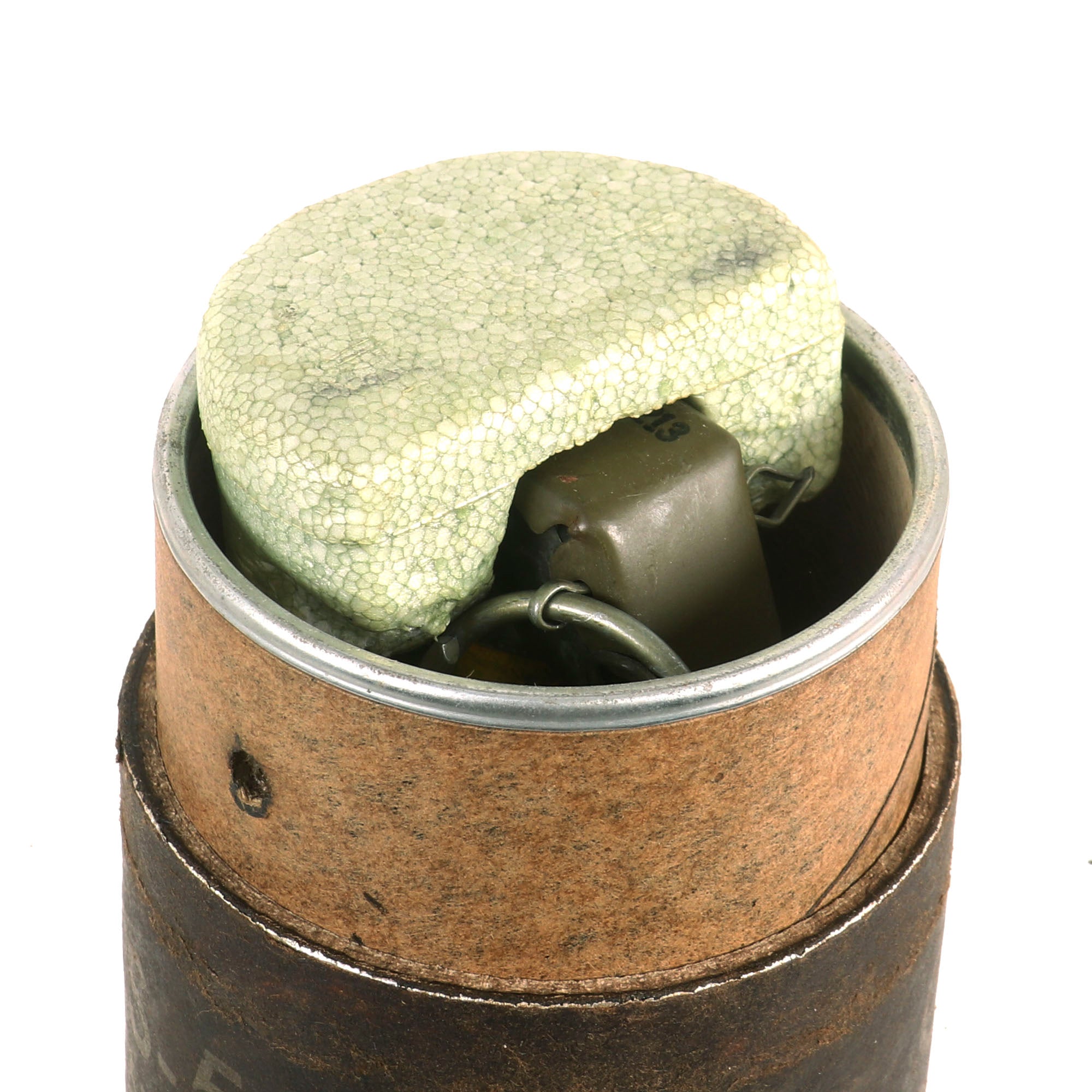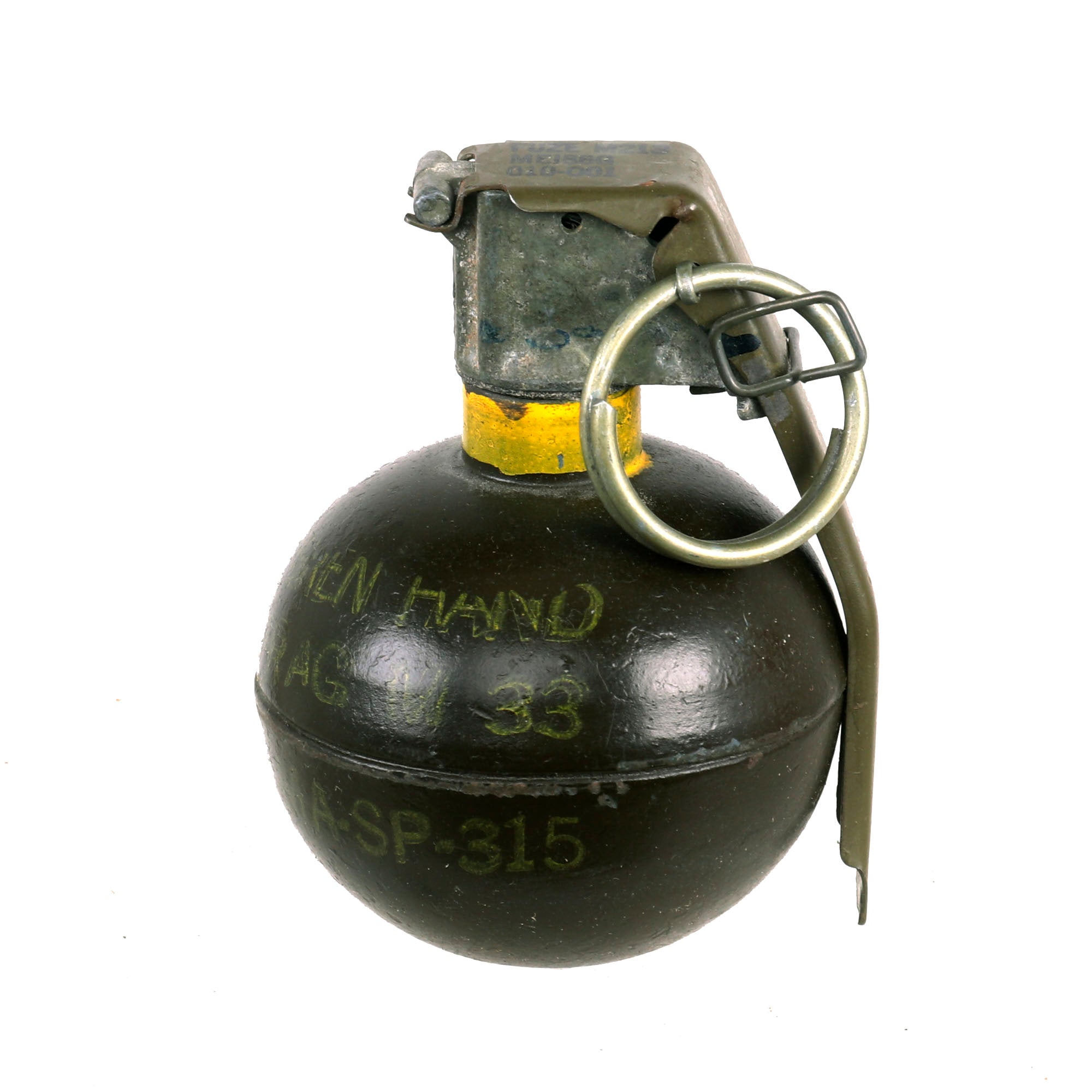 Original Item: Only One Available. This is a very nice inert example of the rare U.S. M67 Hand Fragmentation Grenade, first fielded during the Vietnam War and still current today. It is marked on the body and fuze, and appears to be a factory M67 made inert through filling the body and sealing the bottom. It comes in its original canister with markings. Like all deactivated ordnance, this grenade is Not Available for Export.