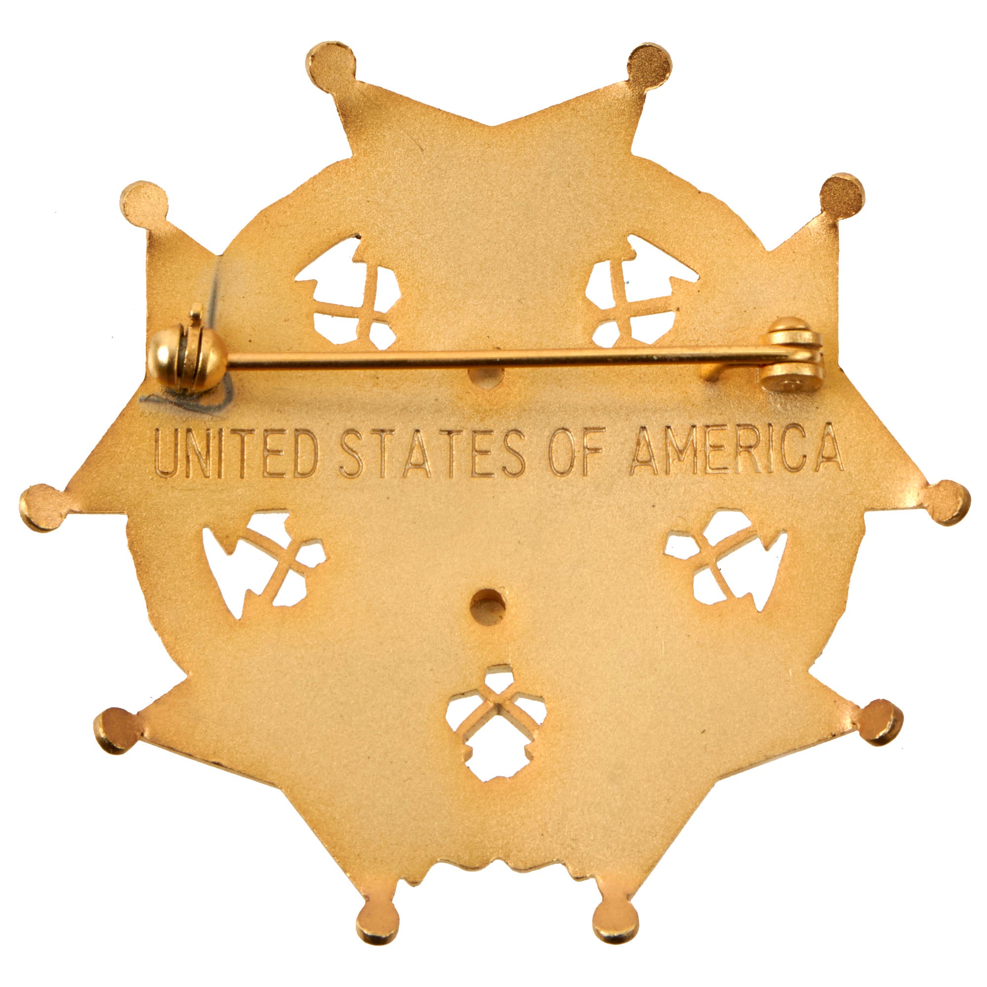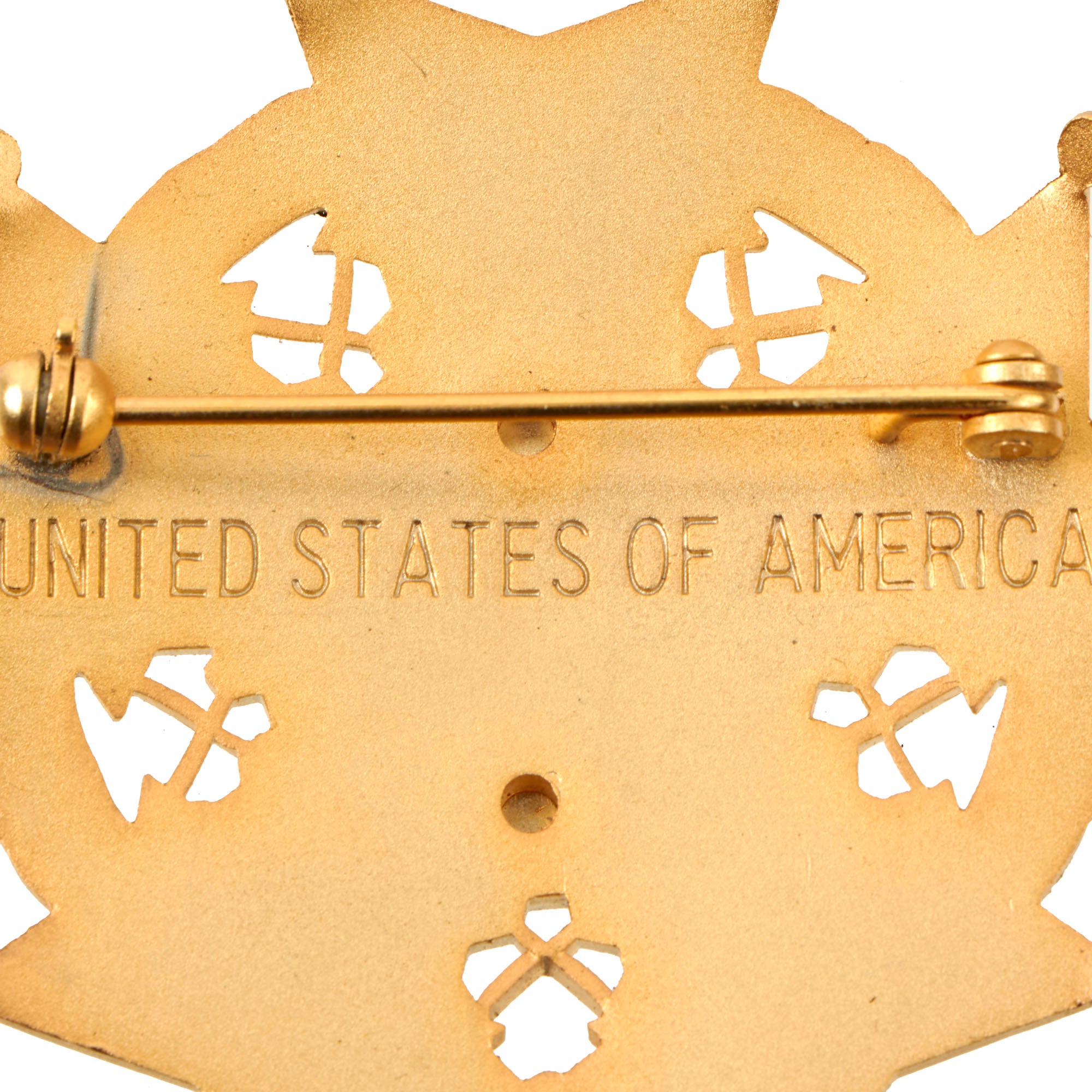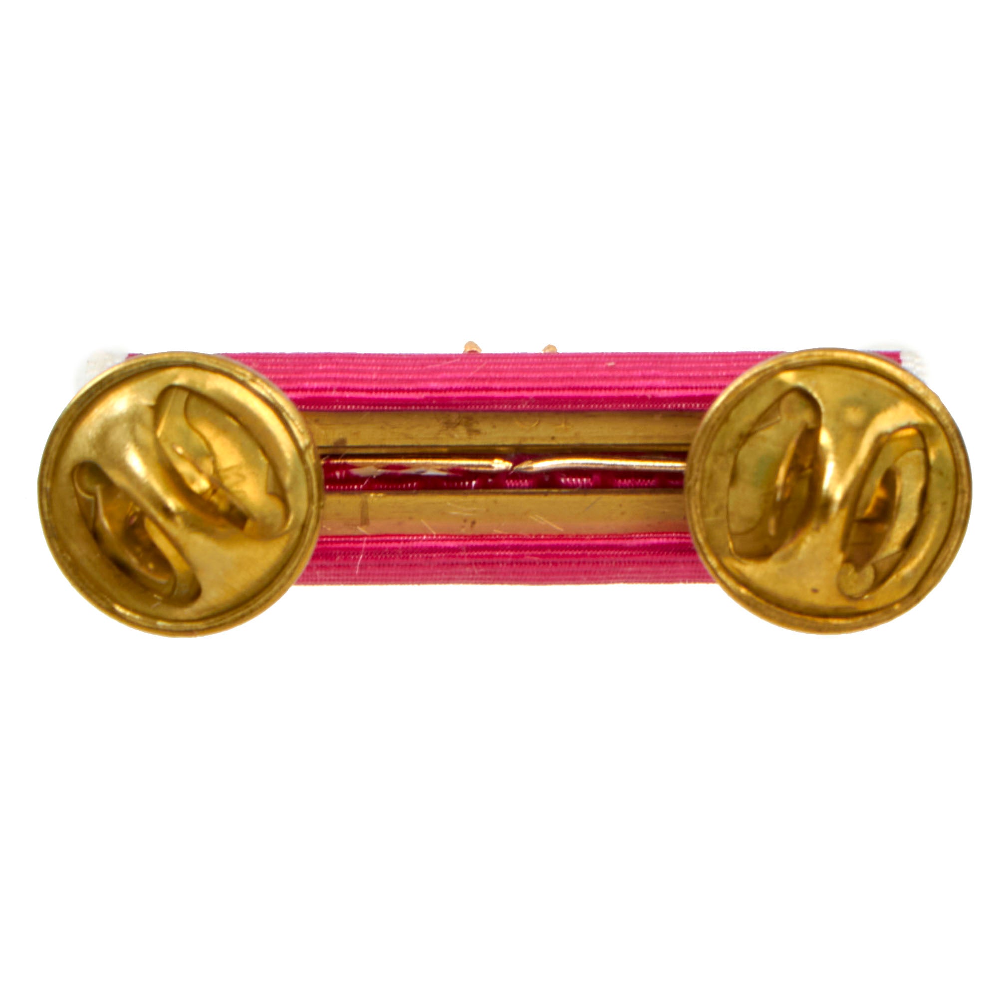 The Chief Commander Degree of the Legion of Merit Medal is, on a wreath of green laurel joined at the bottom by a gold bow-knot (rosette), a domed five-pointed white star bordered crimson, points reversed with v-shaped extremities tipped with a gold ball. In the center, a blue disk encircled by gold clouds, with 13 white stars arranged in the pattern that appears on the Great Seal of the United States. Between each point, within the wreath are crossed arrows pointing outwards. The overall width is 2+15⁄16 inches (75 mm). The words "UNITED STATES OF AMERICA" are engraved in the center of the reverse. A miniature of the decoration in gold on a horizontal gold bar is worn on the service ribbon which is present as is the lapel device.