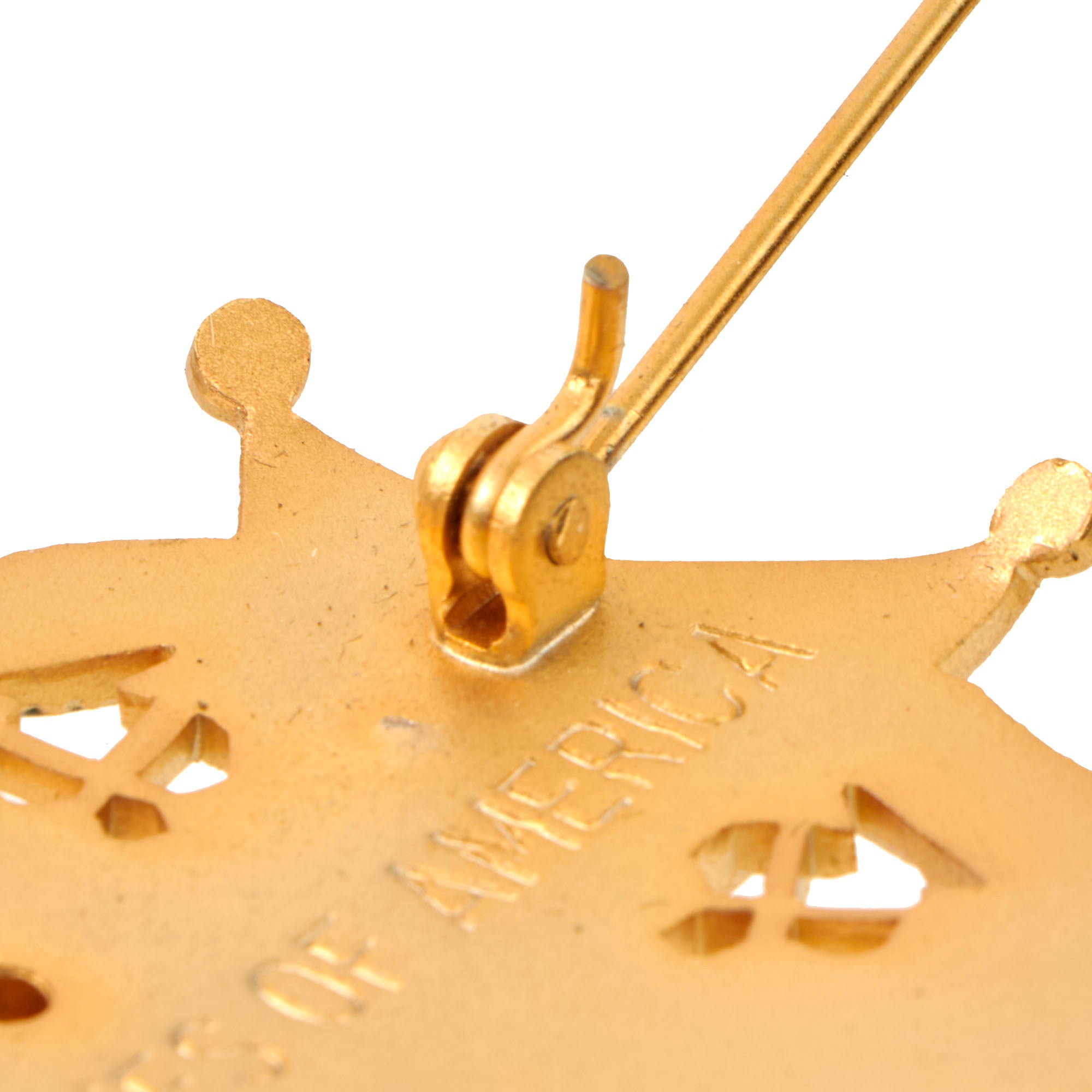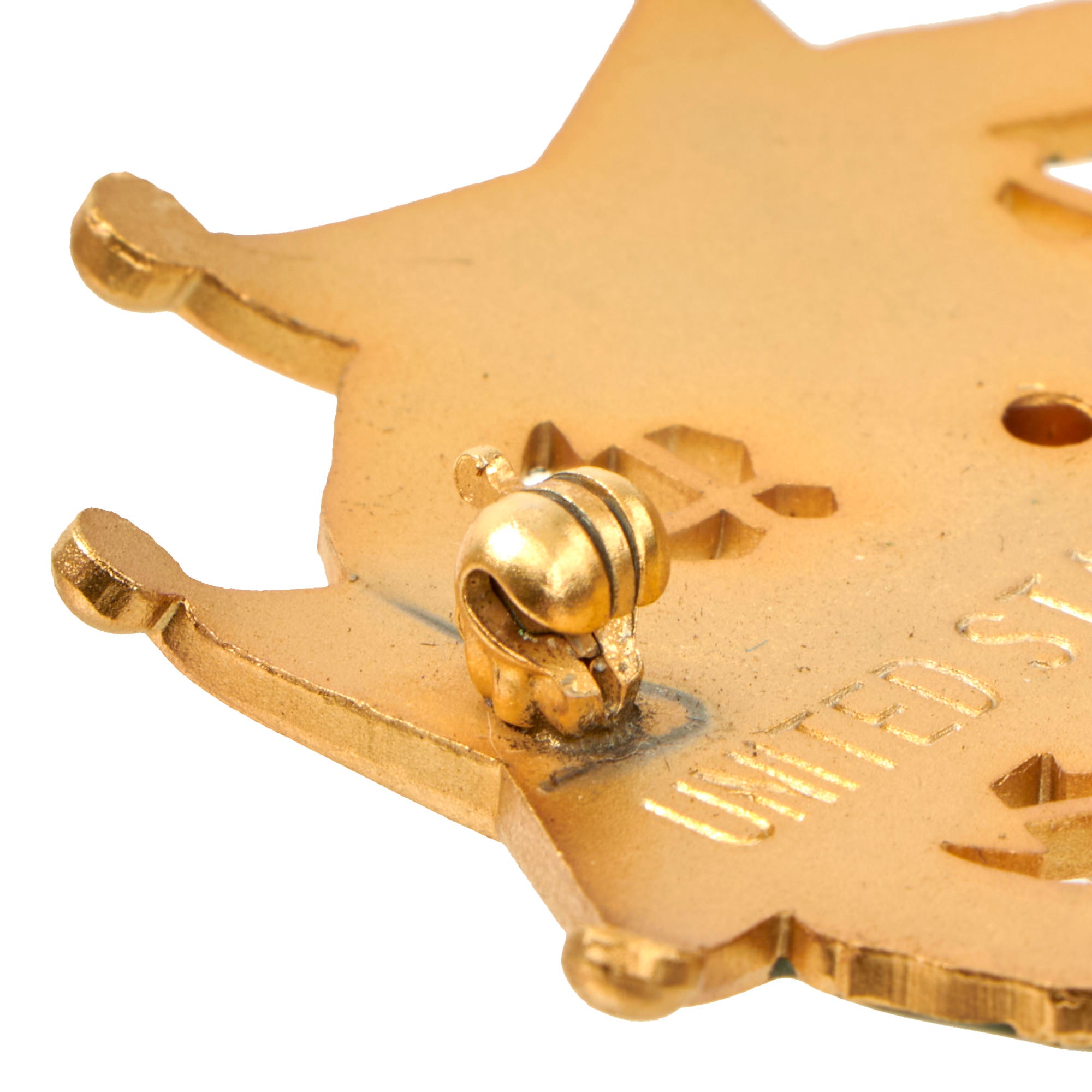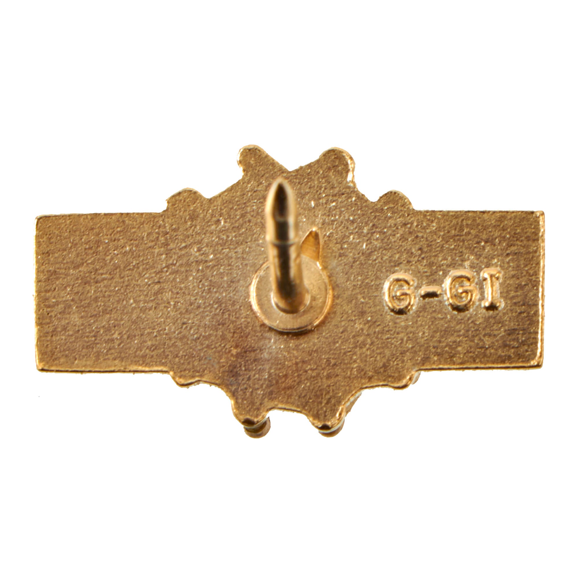 The Chief Commander Degree of the Legion of Merit Medal is, on a wreath of green laurel joined at the bottom by a gold bow-knot (rosette), a domed five-pointed white star bordered crimson, points reversed with v-shaped extremities tipped with a gold ball. In the center, a blue disk encircled by gold clouds, with 13 white stars arranged in the pattern that appears on the Great Seal of the United States. Between each point, within the wreath are crossed arrows pointing outwards. The overall width is 2+15⁄16 inches (75 mm). The words "UNITED STATES OF AMERICA" are engraved in the center of the reverse. A miniature of the decoration in gold on a horizontal gold bar is worn on the service ribbon which is present as is the lapel device.