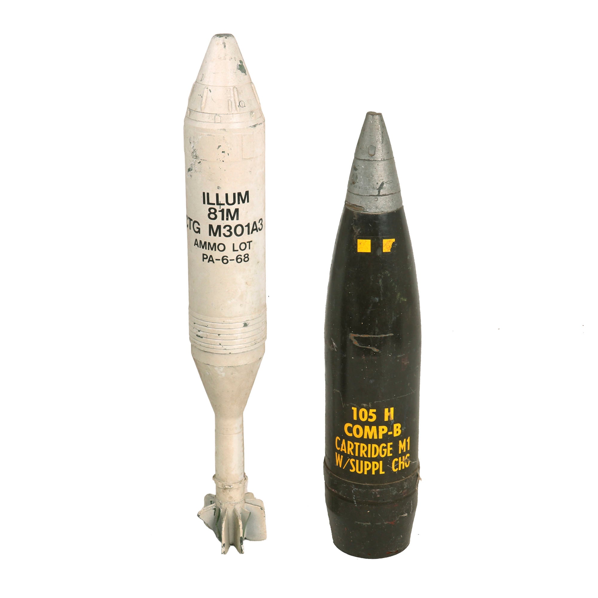 -Two originally 22” long thinner white painted shells labeled in black letters ILLUM 81M CTG M301A3 AMMO LOT PA-6-68. The smaller shaft above the fin assembly is stamped NAE 1-20 1952 81-MM M-301A1. One of the two examples has lost its entire fin assembly, now only measuring about 18½”.