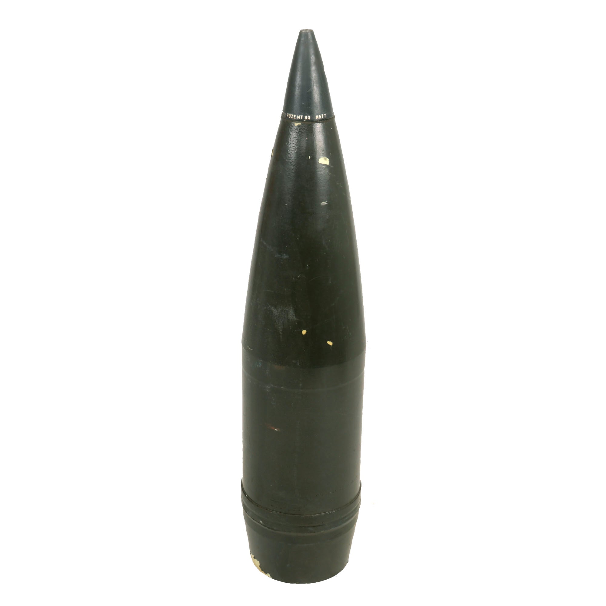 -One 27” tall shell with a fuze labeled FUZE MT SQ M577. The lower body is stamped LOP 2-3 3-67