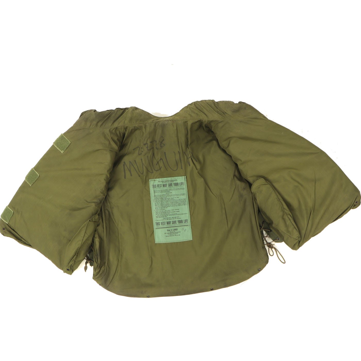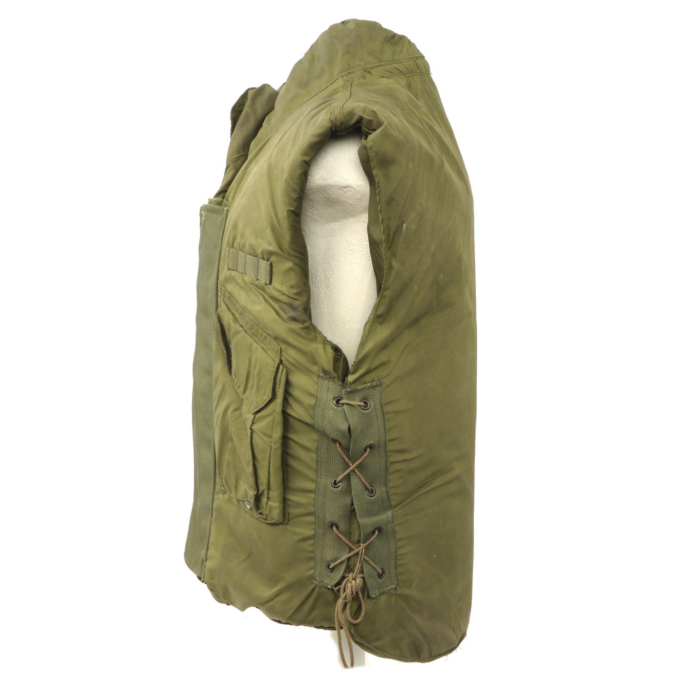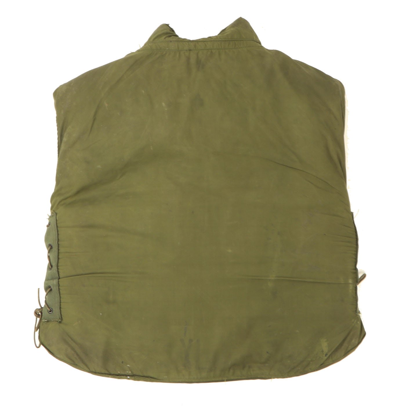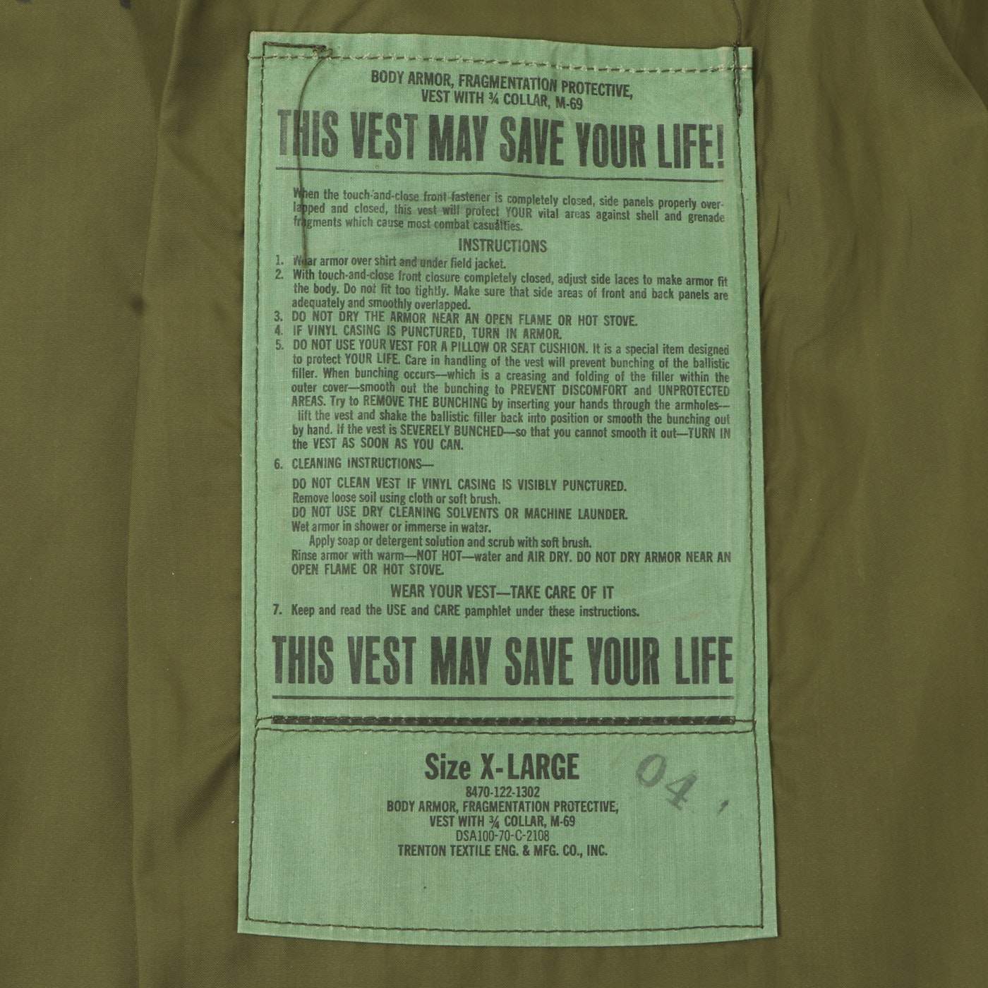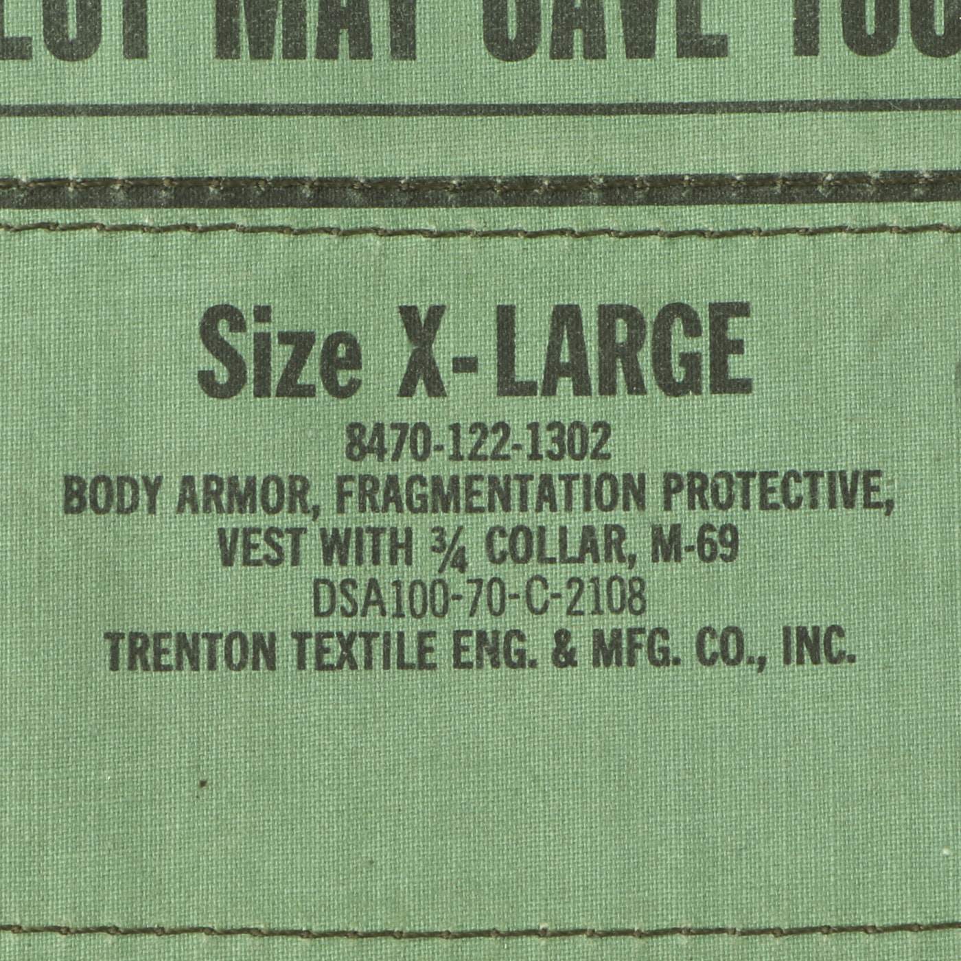Original Item: Only One Available. This is an excellent condition M-69 Flak Vest Body Armor with 3/4 Collar in a size extra large. Manufactured by TRENTON TEXTILE ENG. & MFG. CO., INC.. These are bulletproof with included hips drawstrings, sturdy front hook and loop closure, with front two pockets.