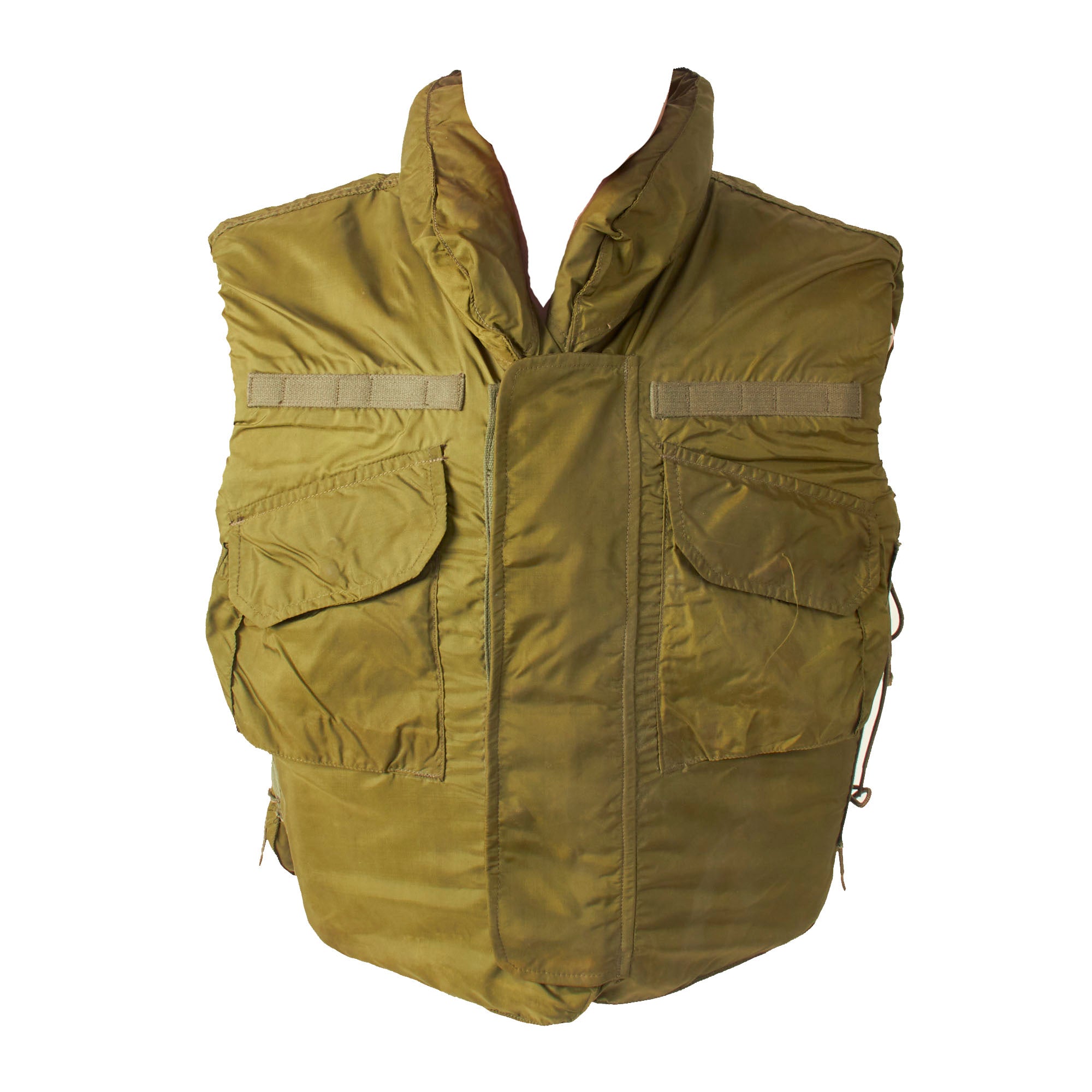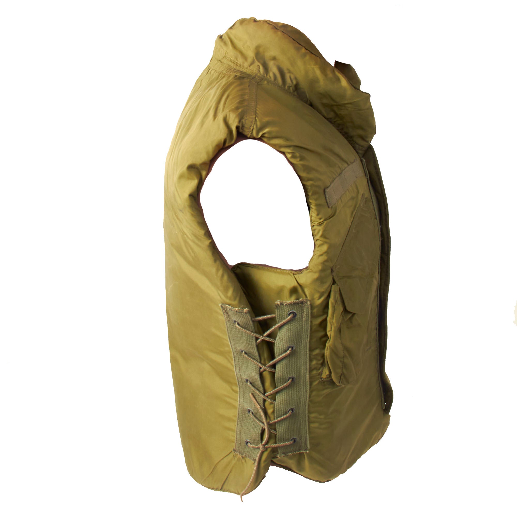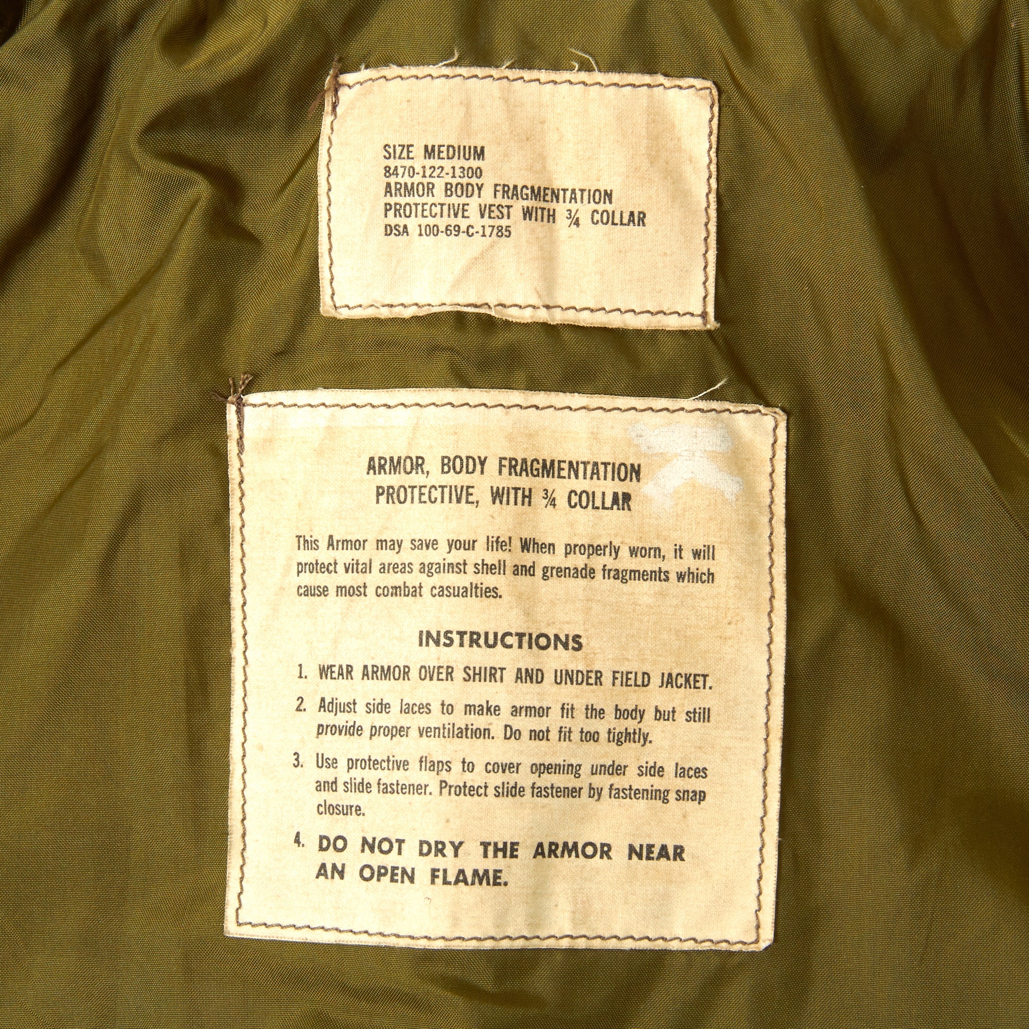 Original Item: Only One Available. This is a very good condition M69 Flak Vest Body Armor with 3/4 Collar in a size MEDIUM. These were designed with side elastic drawstrings, snap reinforced front zipper, and front two pockets. This allowed a secure fit and maximum protection from shrapnel and low velocity projectiles.