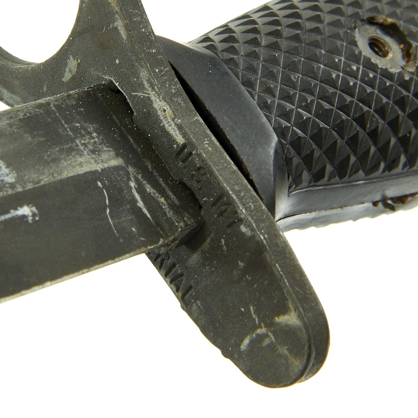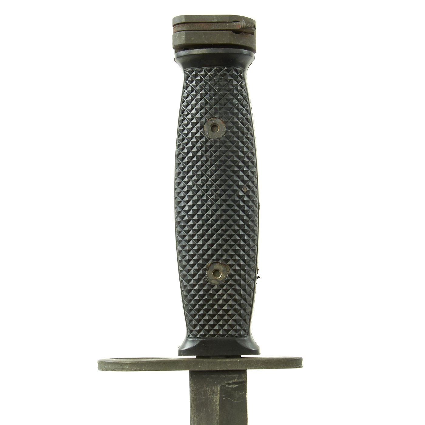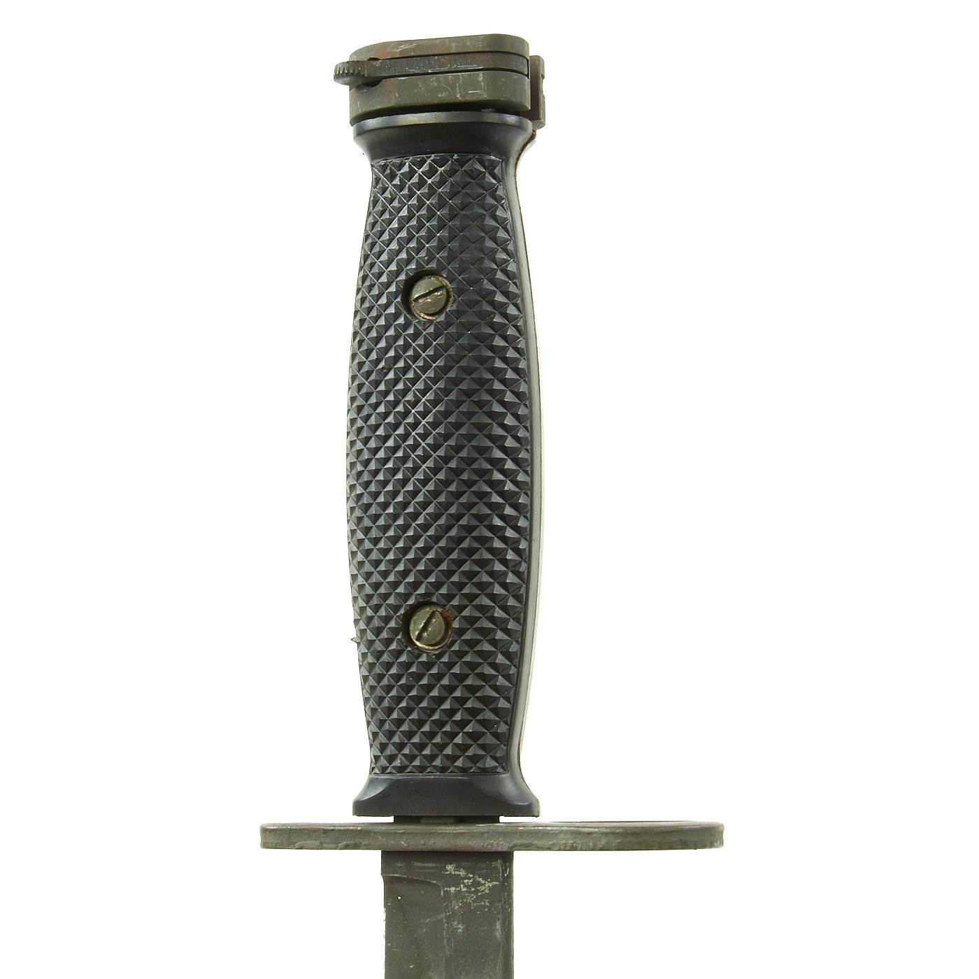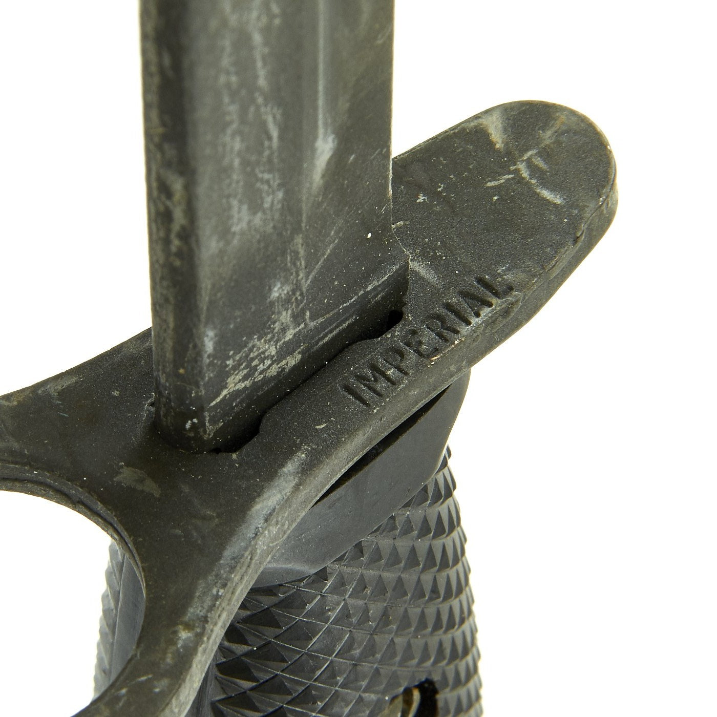 Original Item: Only One Available. Genuine Vietnam War Era U.S. Army M7 bayonet fighting knife for the M-16 Rifle, with an original M8A1 scabbard. This knife-style bayonet was based on the M4 bayonet for the M1 Carbine, which was itself based on the M3 fighting knife. The M7 is almost identical, except for the much larger muzzle ring to go over the M16's flash hider. This example is nicely marked U.S. M7 / IMPERIAL around the blade on the cross guard. This was manufactured by Imperial Knife Co, at the time one of the largest knife manufacturers in the country. They had manufactured many M4 bayonets for the m1 Carbine, as well as the M5 for the M1 Garand, and the M6 for the M-14. All of these featured the same blade, with different handles and other fittings.