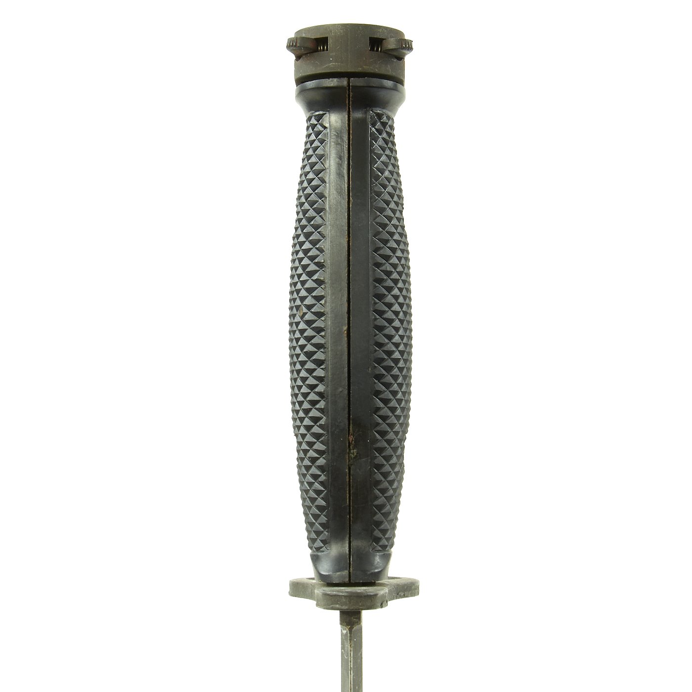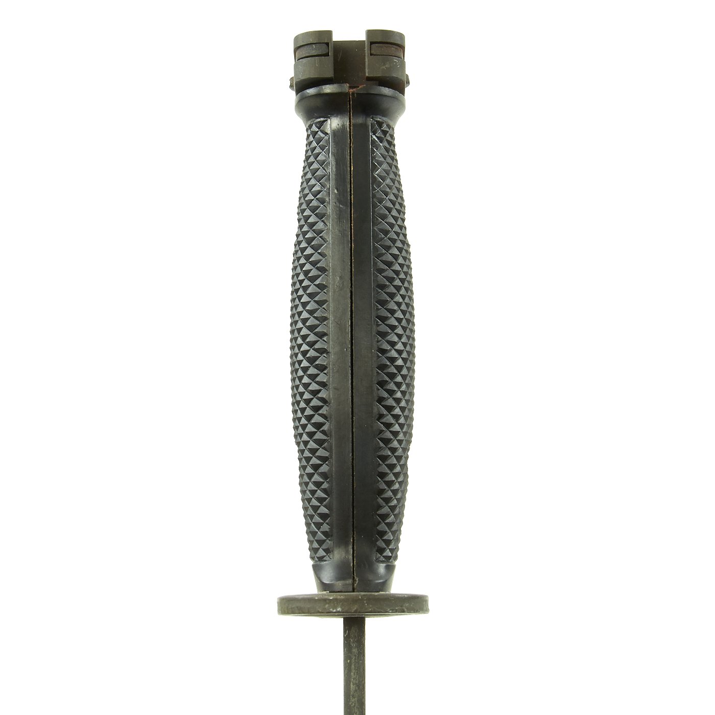 The blade is in very good condition with almost no wear. It looks to be powder coated, maybe over a phosphate finish. The blade is still very sharp, and the only wear is from the runners, and also some of the plastic from the scabbard has rubbed onto the powder coat. Grips are the standard hard black checkered phenolic type, and they are in excellent condition, with no cracks or chips, pretty much unissued.