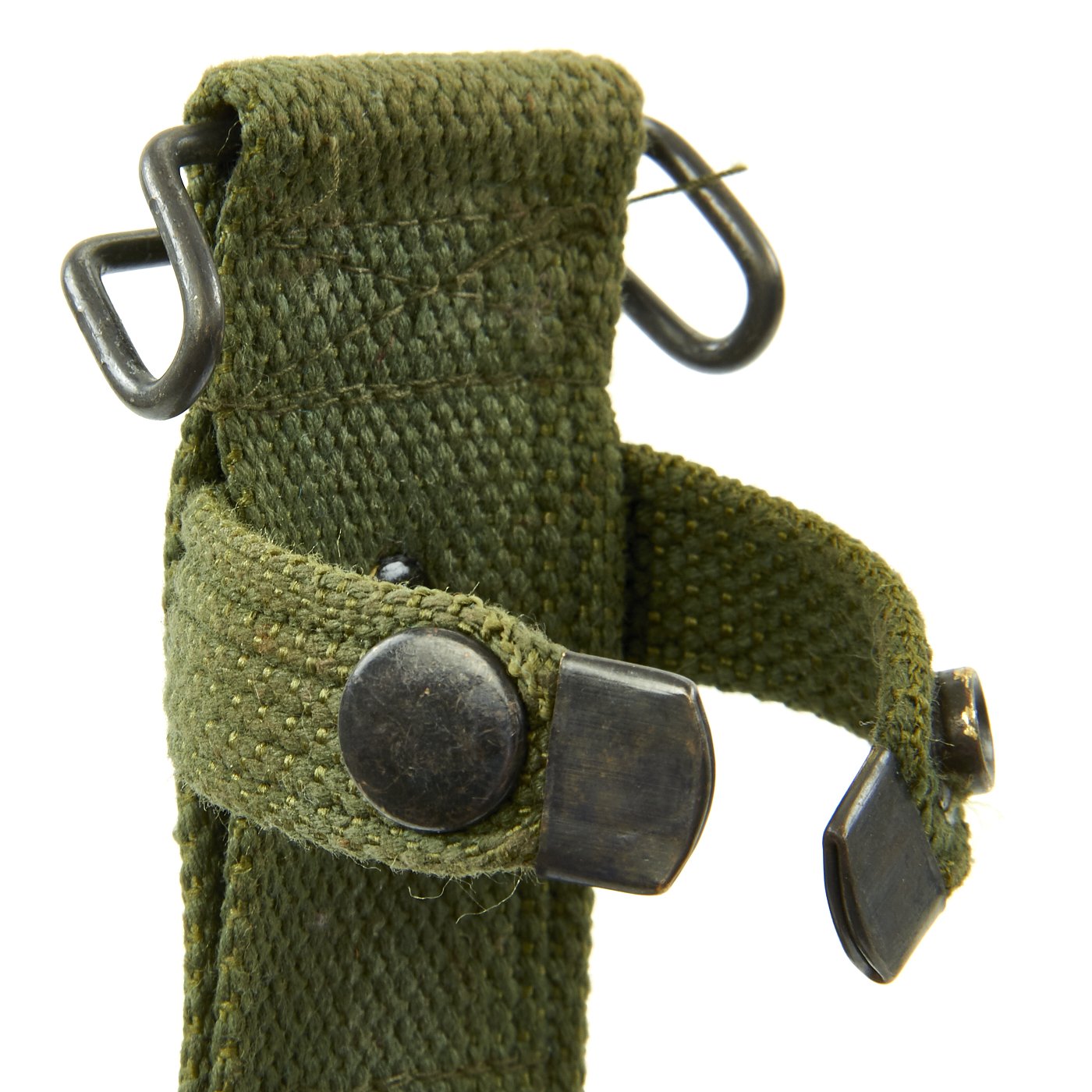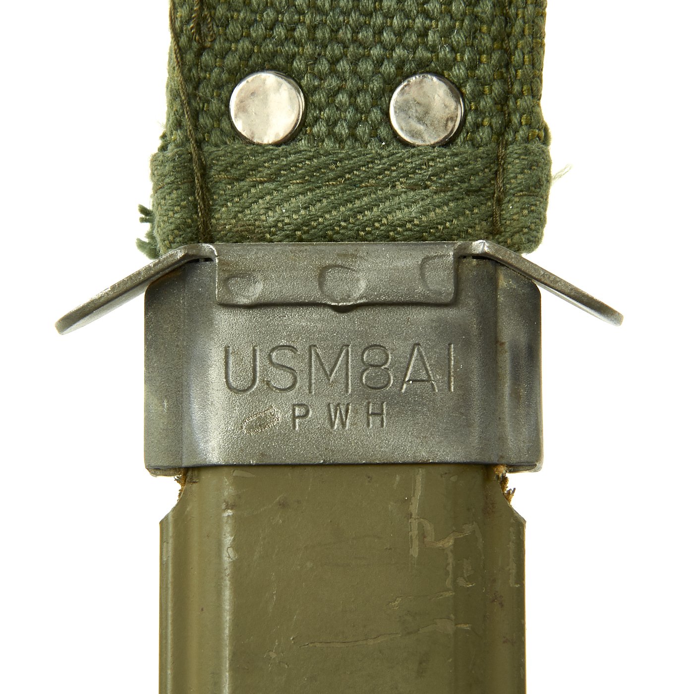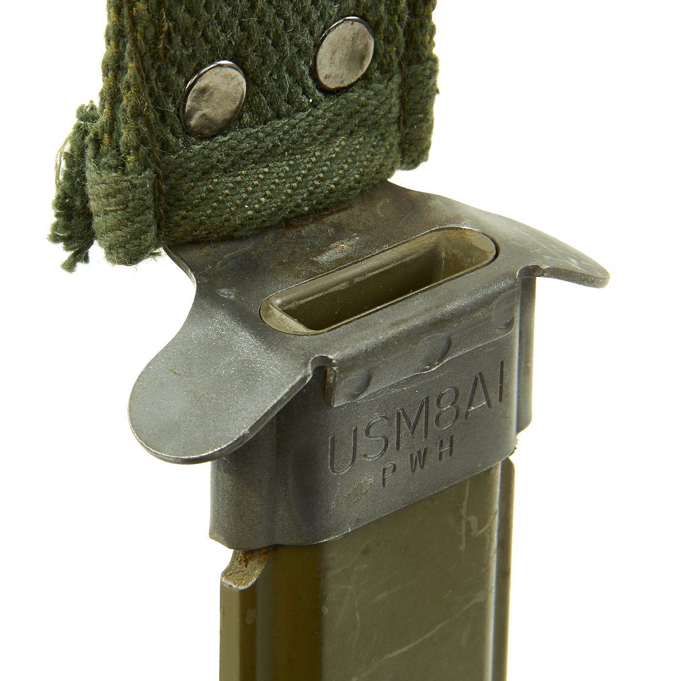 Comes with an OD green scabbard marked U.S. M8A1 / P W H also in offered in very good condition. This design features a thermoplastic impregnated duck canvas body, metal throat, and canvas frog and securing strap with a steel pistol belt hook. This was manufactured by the Pennsylvania Working Home for the Blind, one of many organizations set up after WWII and Korea to provide work to blinded veterans. The condition is pretty much unissued, with just light storage wear.