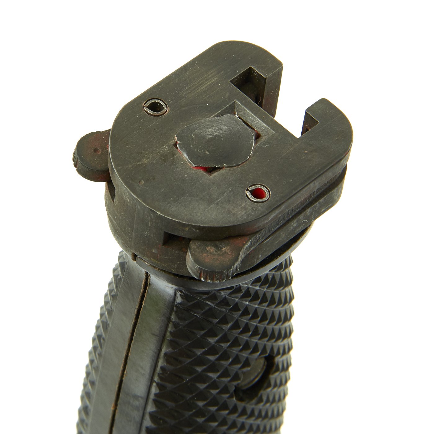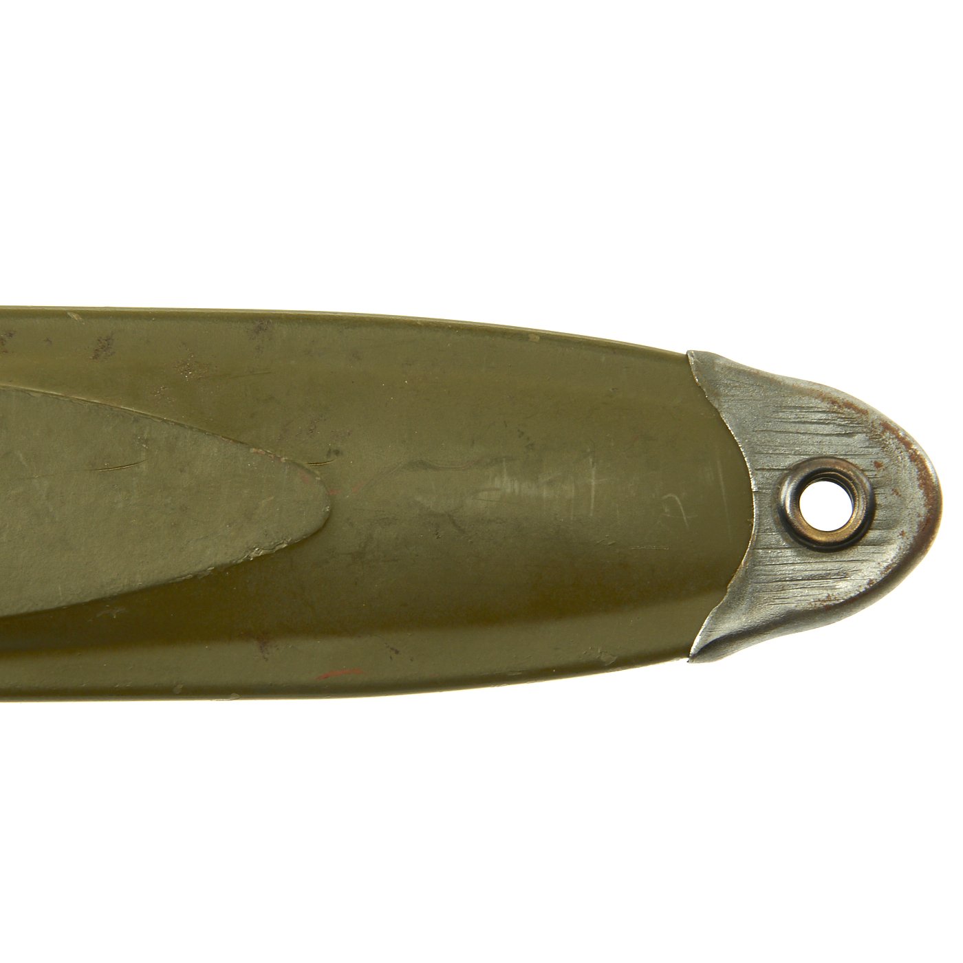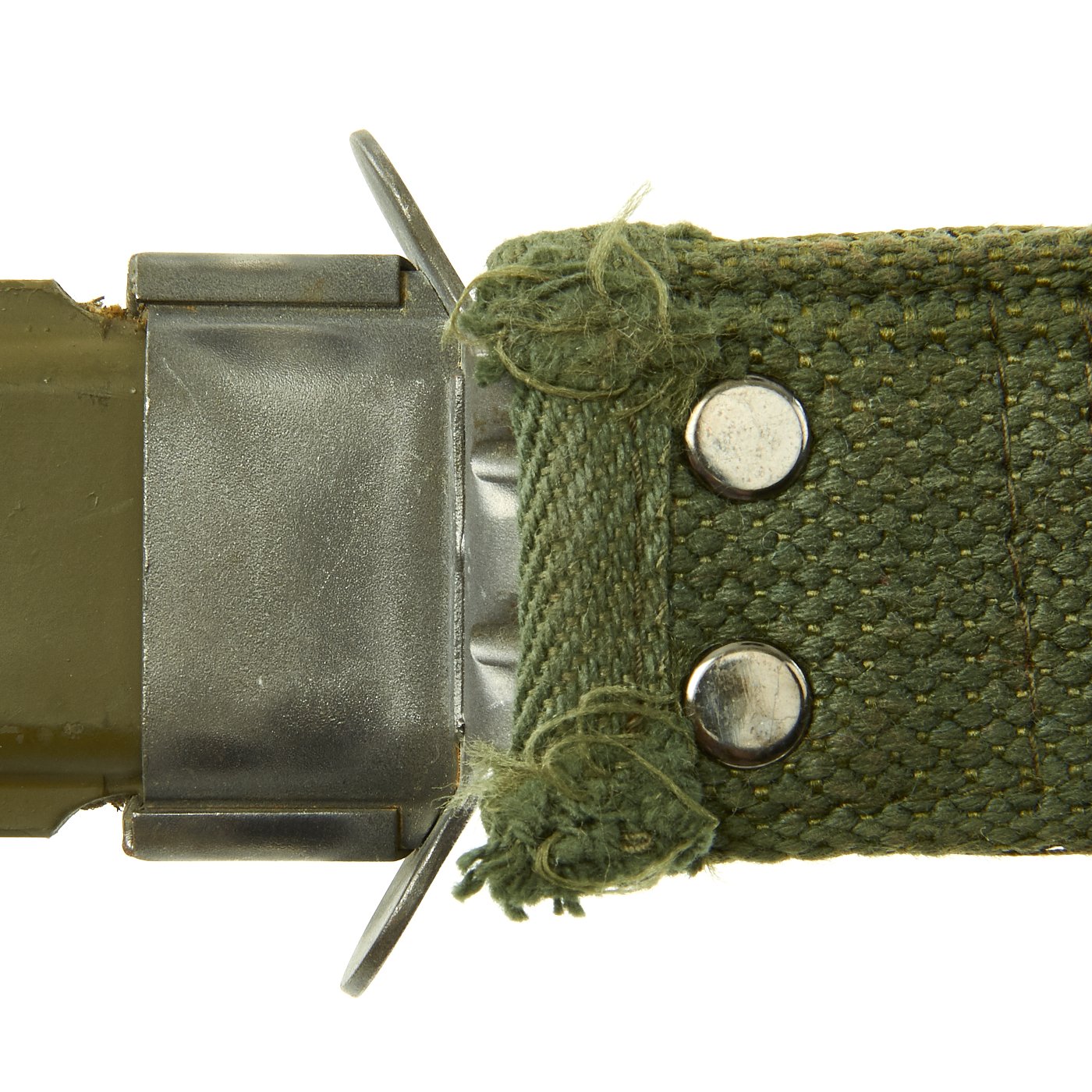 Comes with an OD green scabbard marked U.S. M8A1 / P W H also in offered in very good condition. This design features a thermoplastic impregnated duck canvas body, metal throat, and canvas frog and securing strap with a steel pistol belt hook. This was manufactured by the Pennsylvania Working Home for the Blind, one of many organizations set up after WWII and Korea to provide work to blinded veterans. The condition is pretty much unissued, with just light storage wear.
