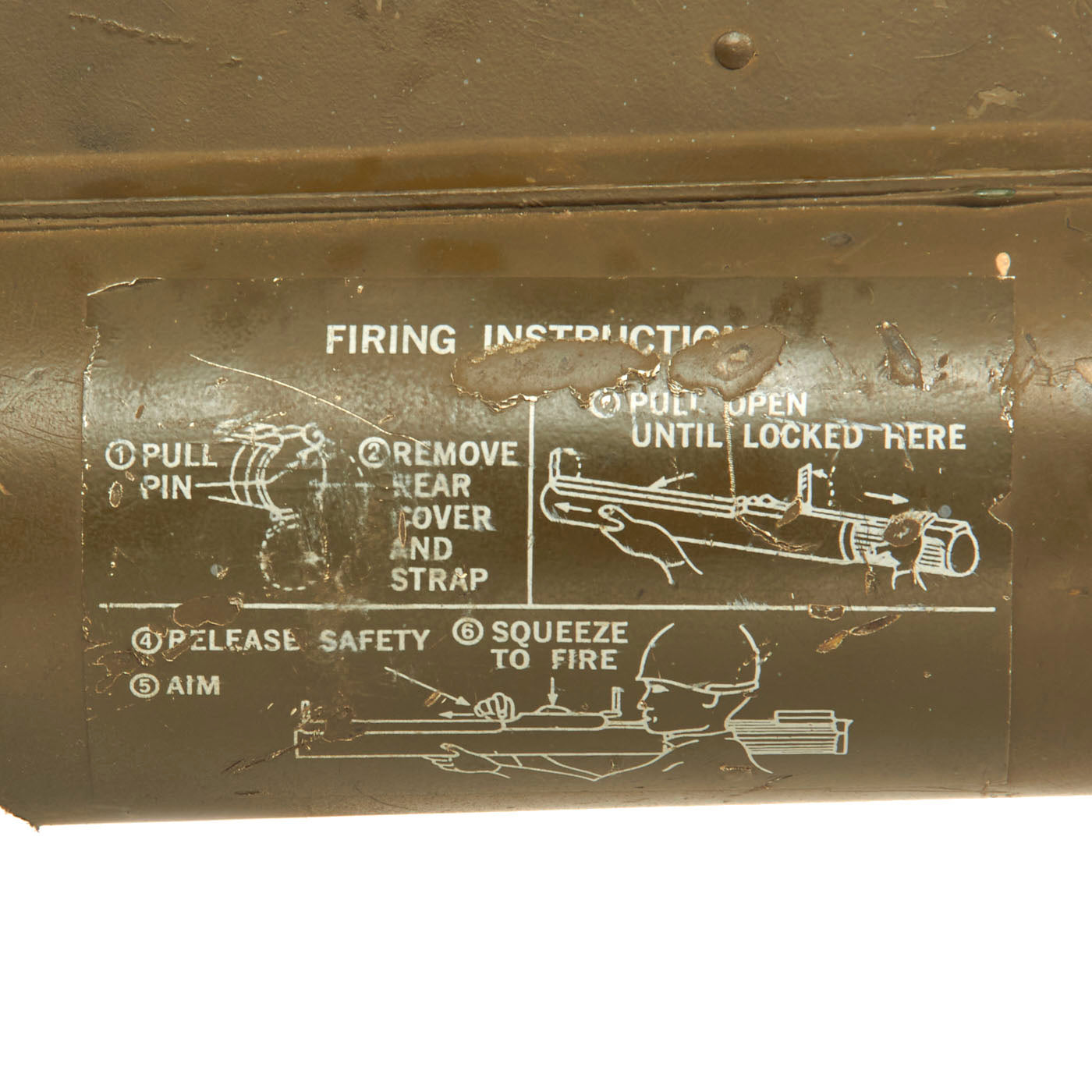 This very nice example has rear sight, which is often seen missing. The front sight “glass” is also present. The end cap and sling are missing unfortunately and there is a chip in the fiberglass on the front top. This tube was fired, more than likely on a demo range, retained, repainted and repurposed as a training aid.