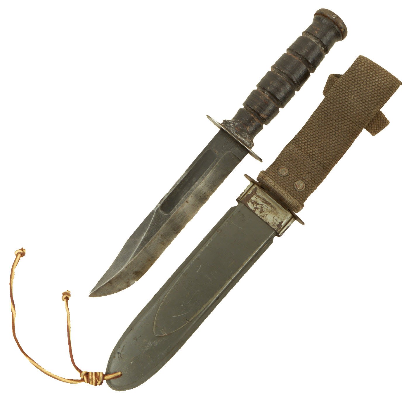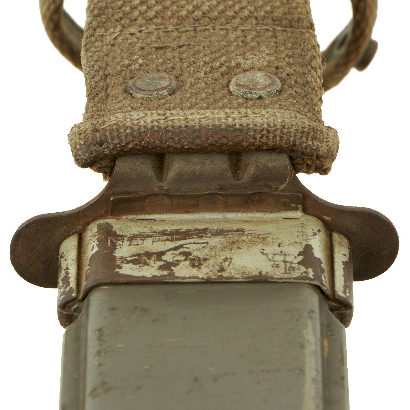 The scabbard is the WWII Mk2 version, very similar in construction to the M8 scabbard for the M3 fighting knife, with a thermoplastic impregnated cotton fabric body, metal throat, and canvas frog and securing strap. The front of the throat is marked U.S.N. / MK 2, and the rear is marked NORD - 6581 / B.M. Co. with a stylized V P logo. The NORD number is for the US Navy contract it was produced under, which was delivered between July 1944 and February 1945. It was manufactured by Beckwith Mfg Co. a division of Victory Plastics. Scabbard is in good condition, with some cuts on the edge of the body, and wear to the throat and frog. There is also light oxidation on the fittings.