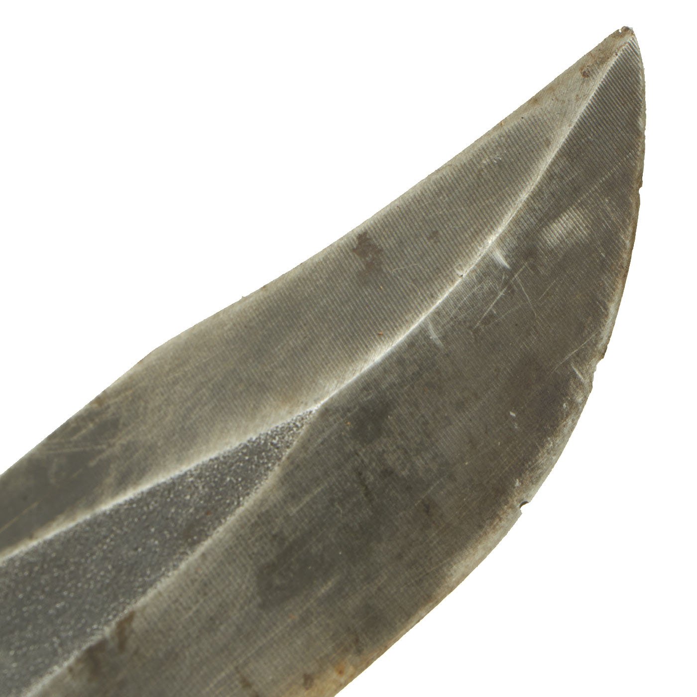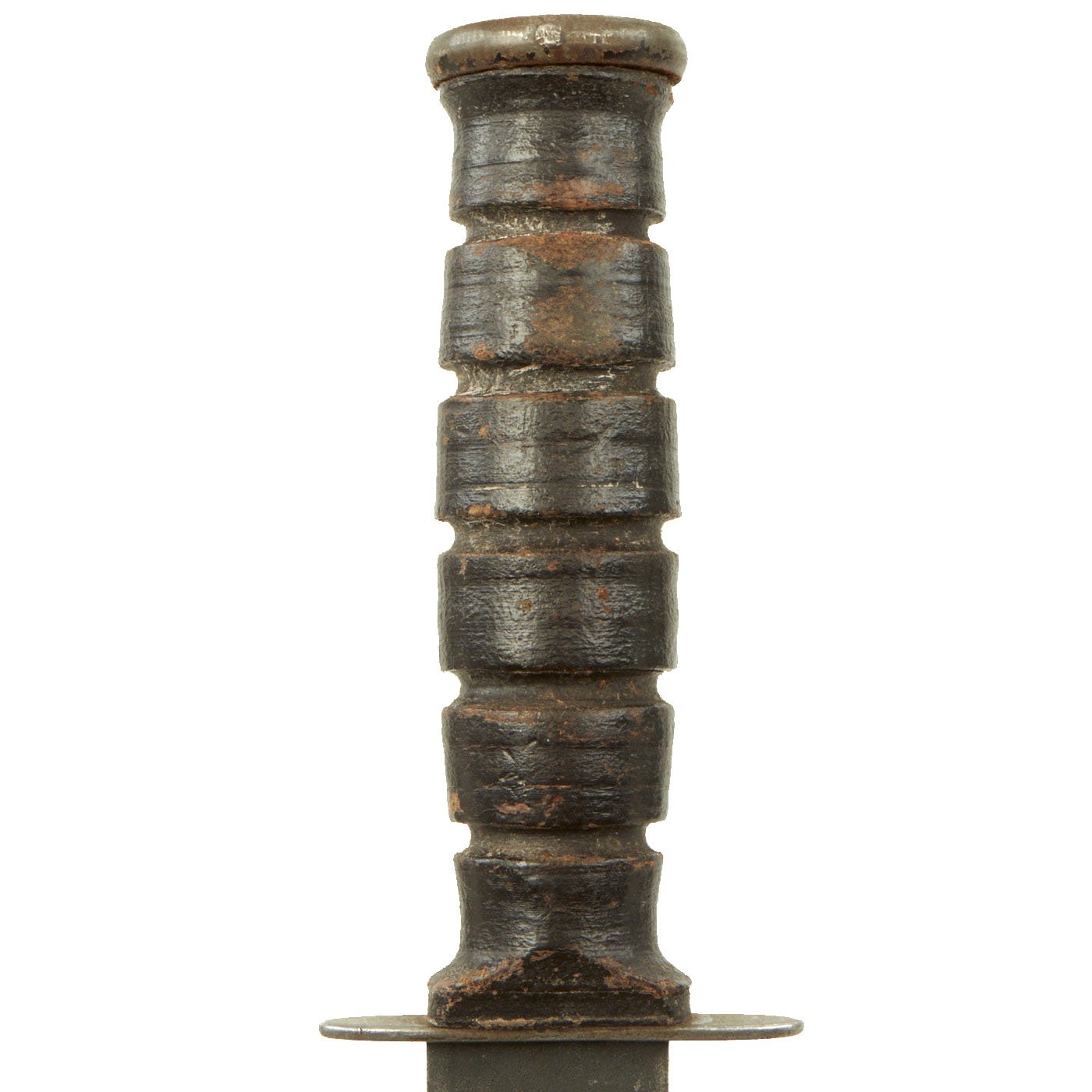 This knife features original "oxblood" anti-fungal painted leather washer grip, which is in very good condition, with no cracks or splitting, just the expected wear from light service. It has a 1/4" thick steel pommel with cross pinned tang. The blade on this example has seen little use, and still seems to have the original factory sharpening on the blade. The wear to the finish seems to come mostly from the scabbard and cleaning.