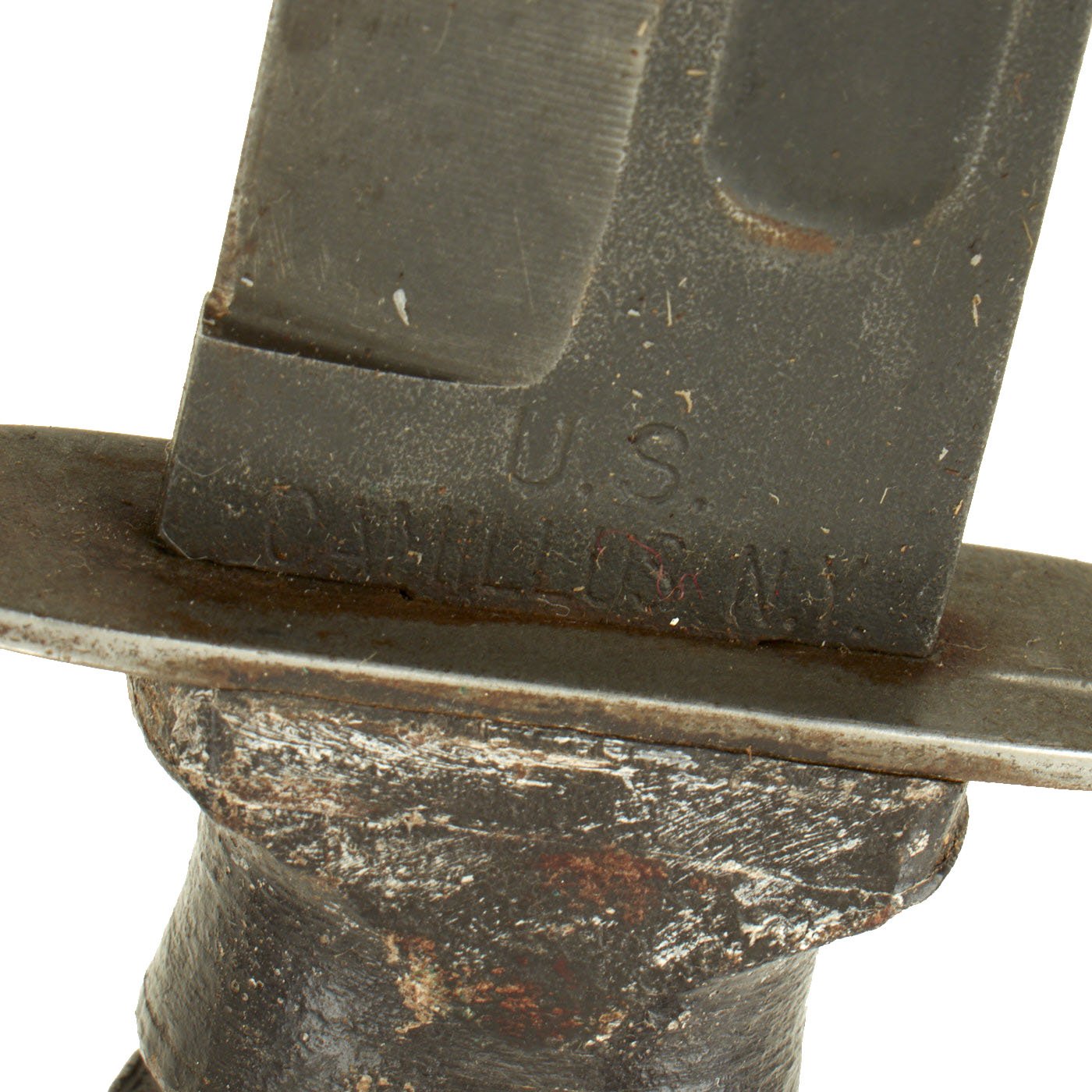 The markings on the blade and the straight crossguard indicate that this was manufactured somewhere between 1962 and 1974, which puts it right into the Vietnam War Era. Previously the knives would be marked specifically to the U.S. Navy or Marine Corps. After WWII, there was such a surplus that no additional orders for the knives were made until 1959. Union Cutlery / KA-BAR and Utica received the first orders, with Camillus receiving orders later.