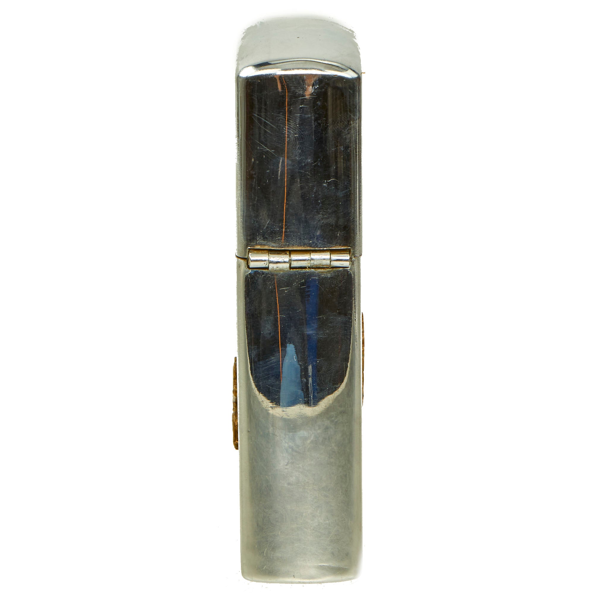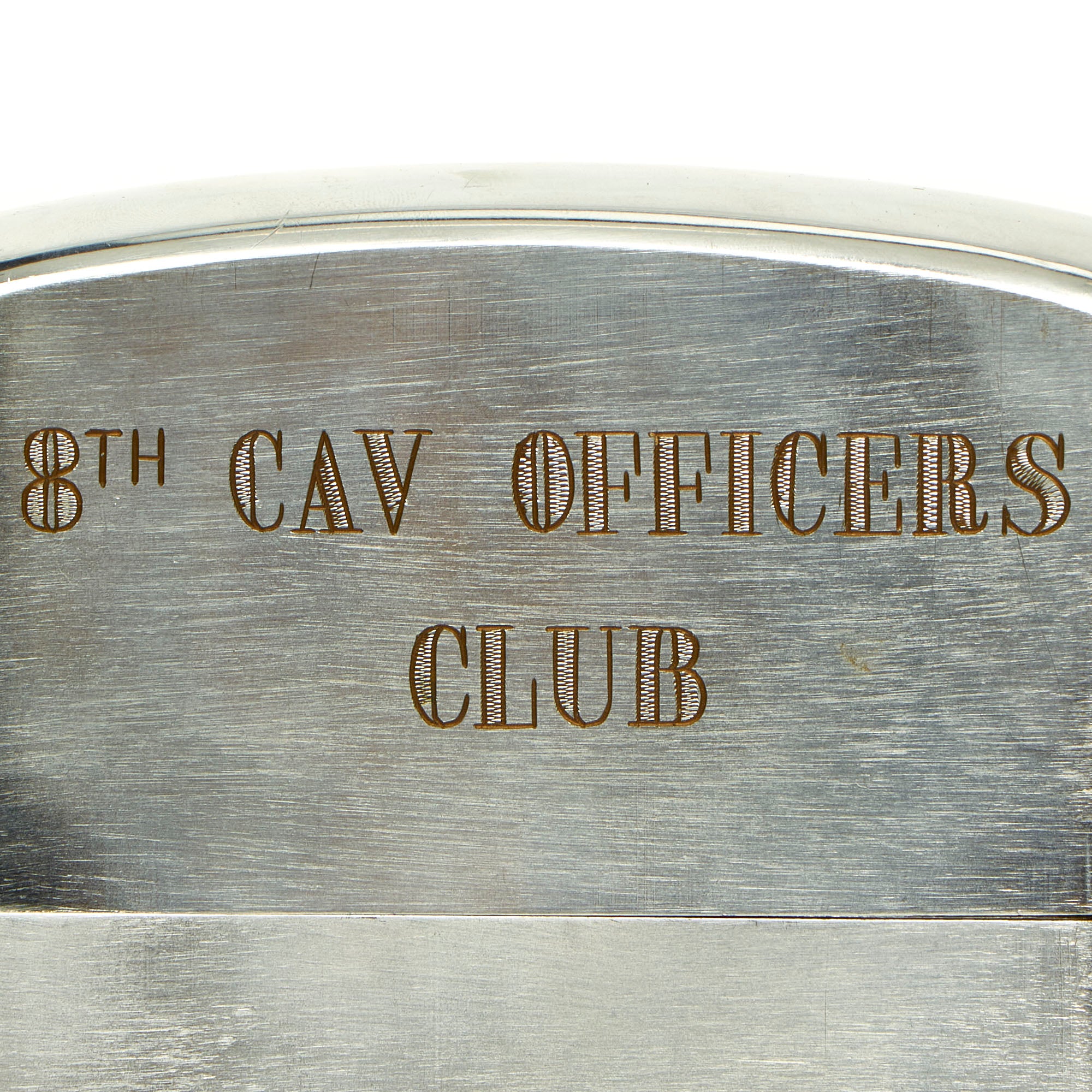Original Item: Only One Available. This is an extremely nice example of a Vietnam War era, Japanese made “flip top” zippo style table lighter. The lighter was either presented to or made by the officers of the 2nd Battalion, 8th Cavalry Regiment for their Officers Club. The lighter stands at 6 ⅓” tall with a base width of 4 ¼” and displays quite well. The construction is still sound and we believe that with a new flint, some fluid and minor cleaning this would be a nice, functional example again.