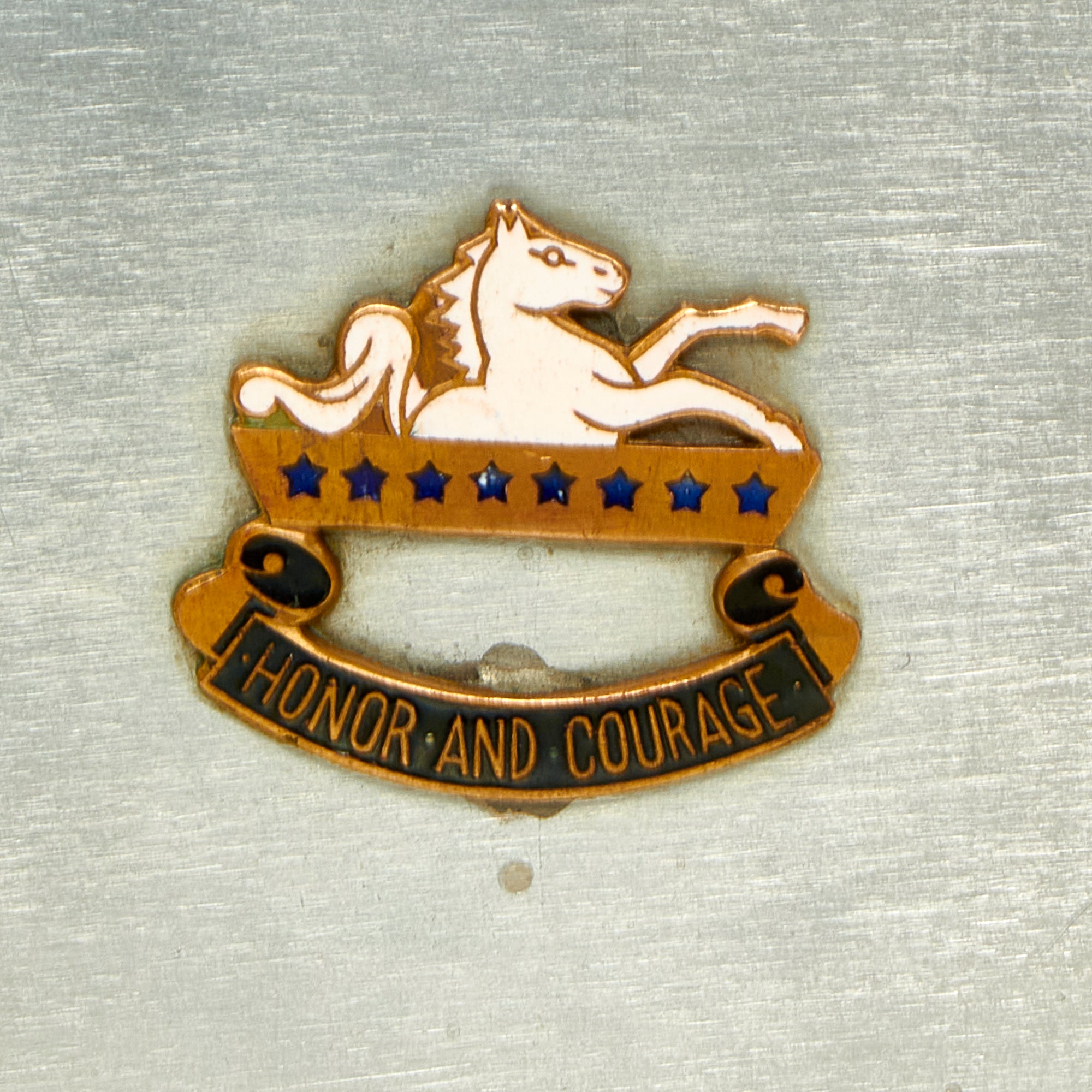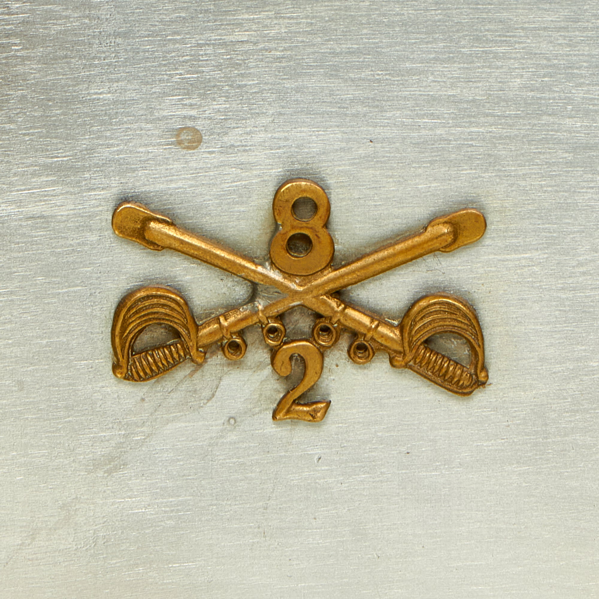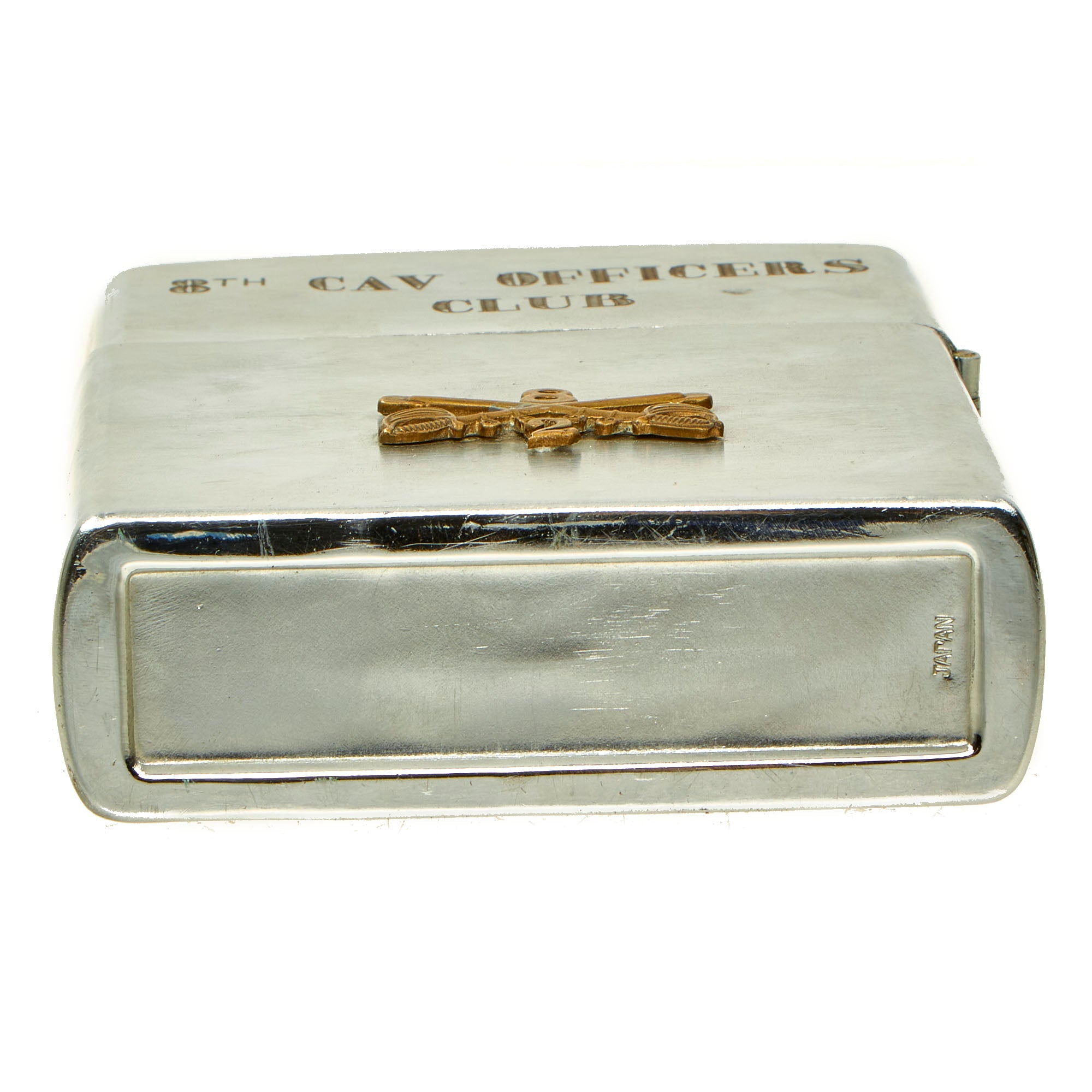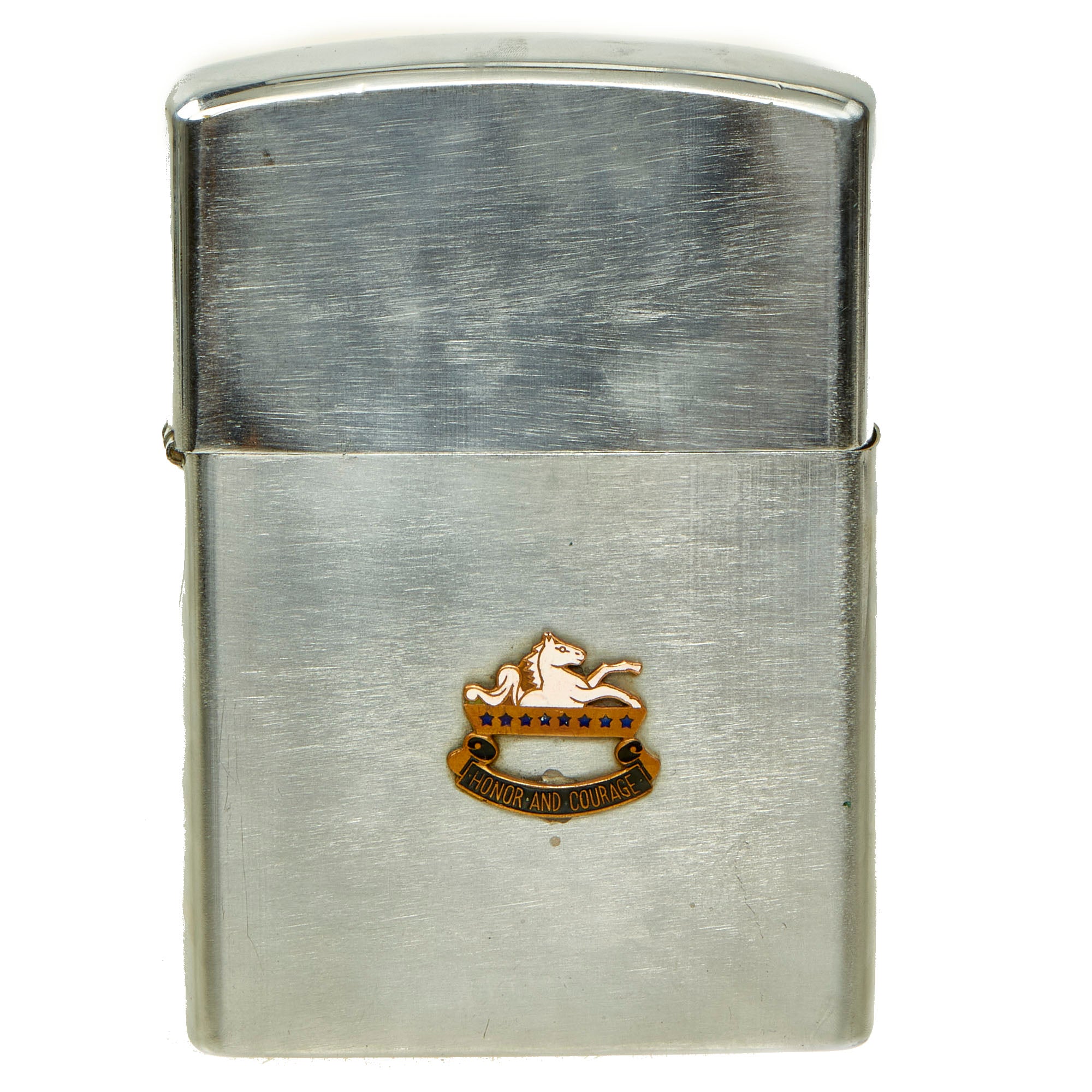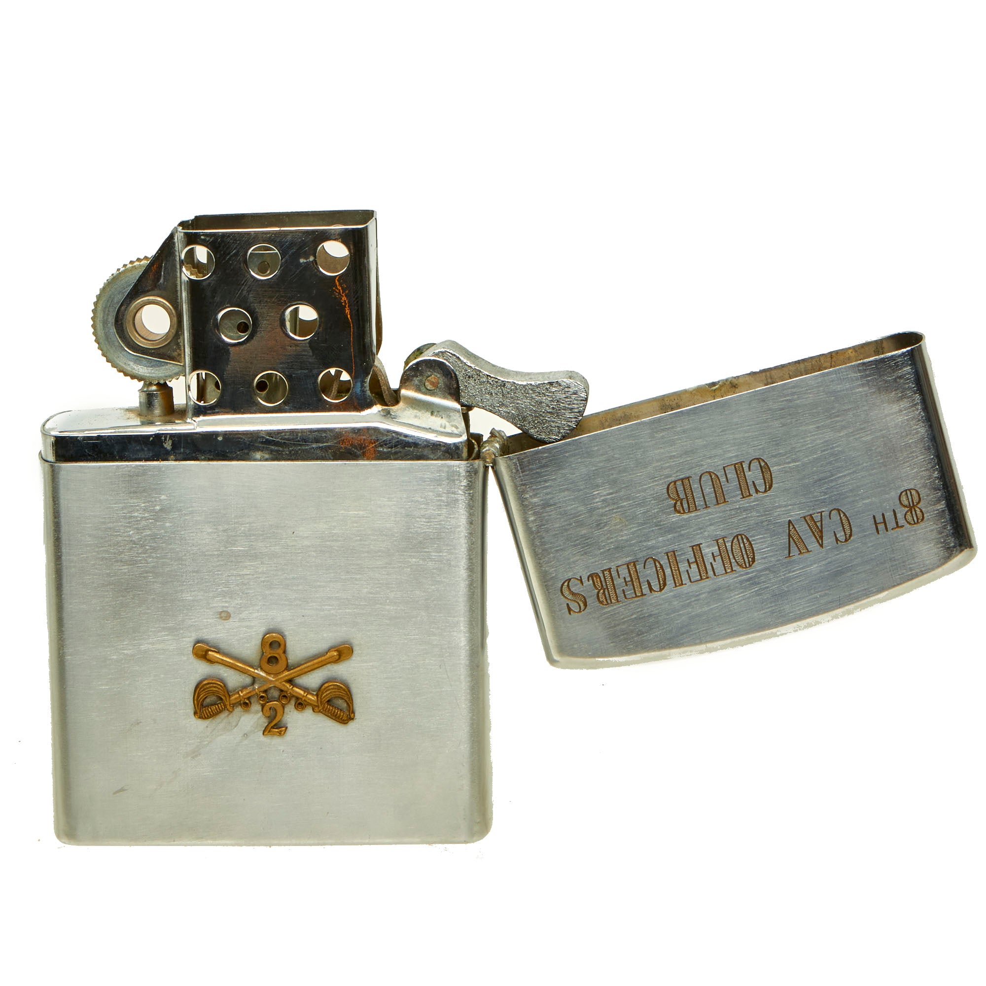 The lighter features the crossed sabers cap device for the 8th Cavalry Regiment, 2nd Battalion on one side and the Regimental Distinctive Unit Insignia on the other. Both devices are still in fantastic condition and retain all of their original details.