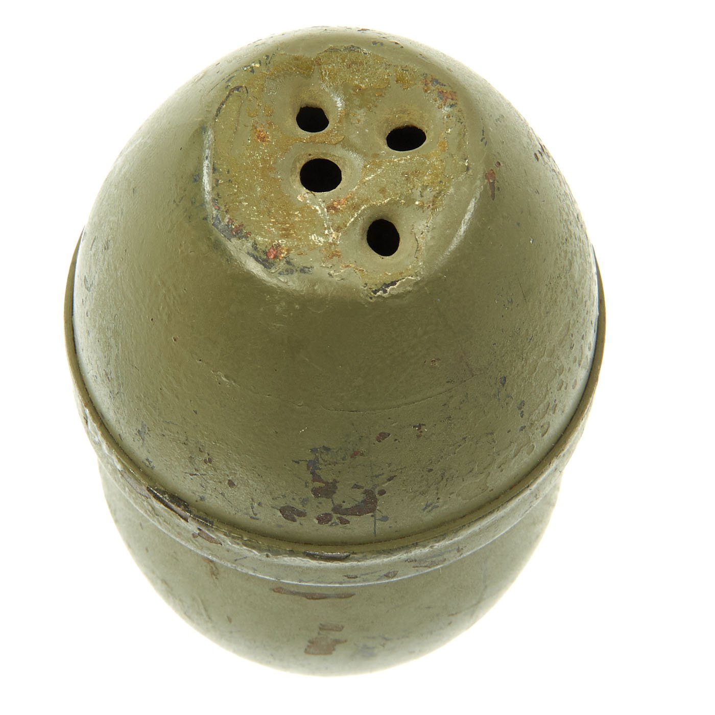 This example is quite nice, with a lovely OD Green paint job, and comes with the deactivated fuze and spoon. There are holes punched in the bottom of the grenade, which were used to help deactivate the grenade. Ready to display!