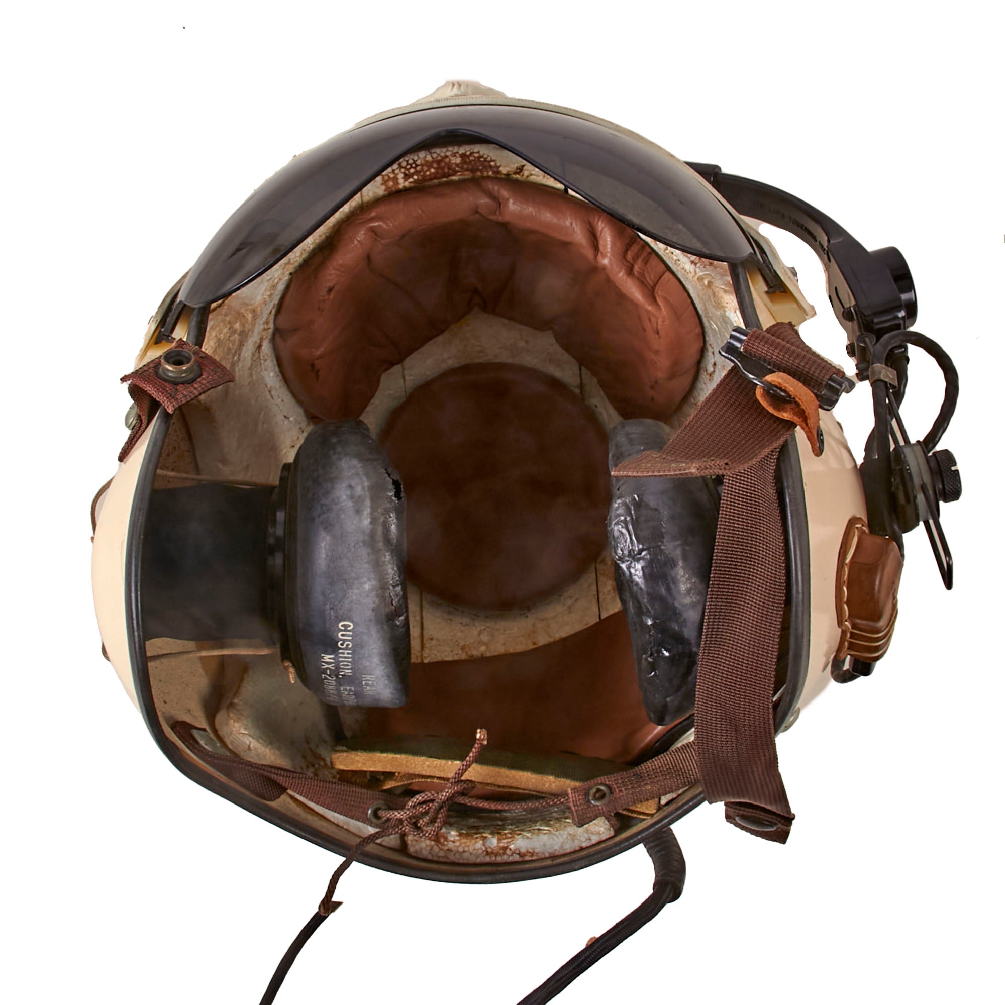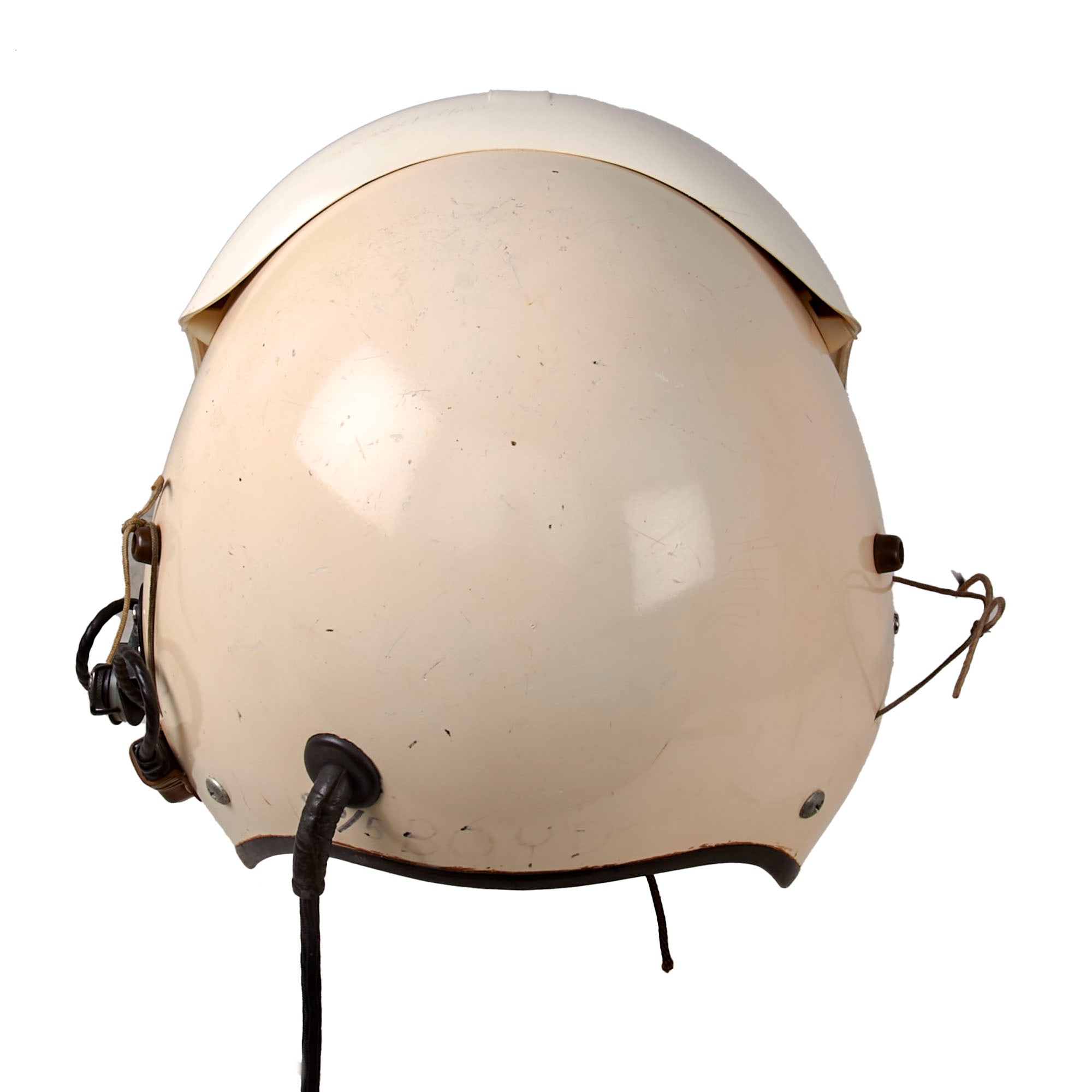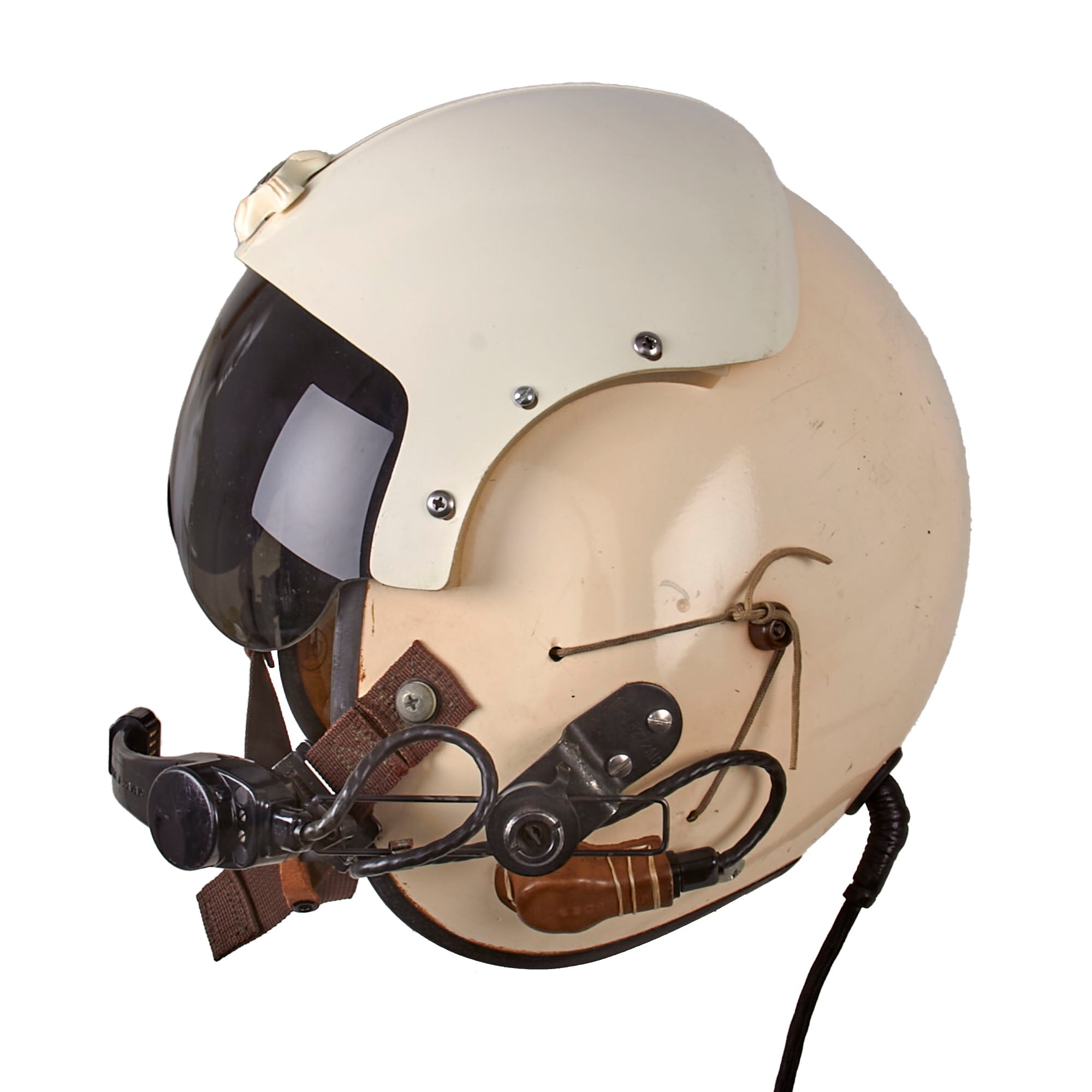 The visor is fully functional and displays great when extended. The helmet also retains its styrofoam and leather passing on the interior, with all straps still retained. This is a great example of the Quintessential Vietnam Helicopter Crewman Helmet in white! Ready for further research and Display!
