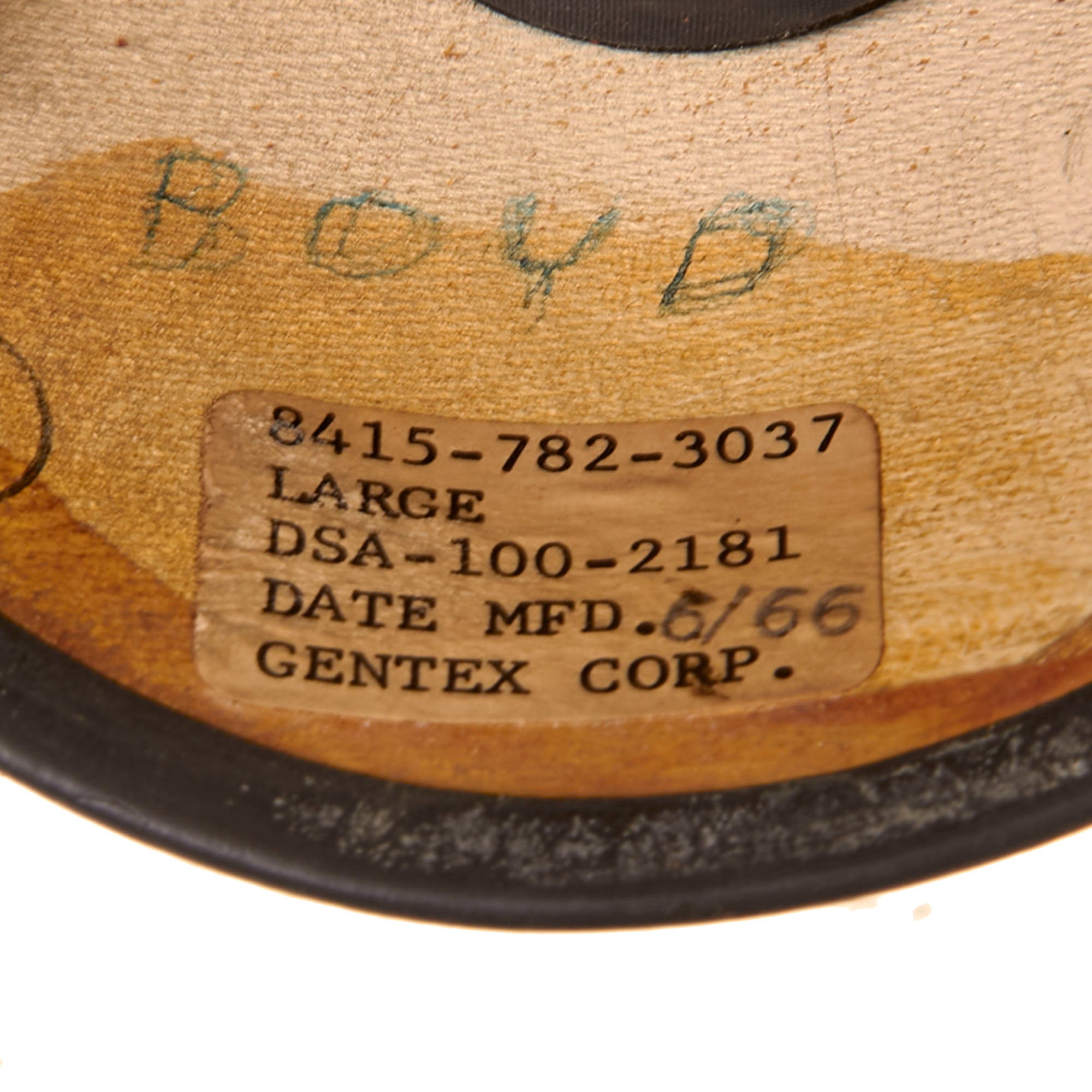 Original Item: Only One Available. This is a nice example of a Vietnam War APH-5 Flying Helmet, as used by all branches of service during the Vietnam War. This Helmet appears to have been in storage for most of its life. Has a functional tinted visor as well as boom mic and ear padding. Size is a LARGE. The name BOYD is written on the interior, and SP/5 BOYD is written on the back, for Specialist 5th Class Boyd.