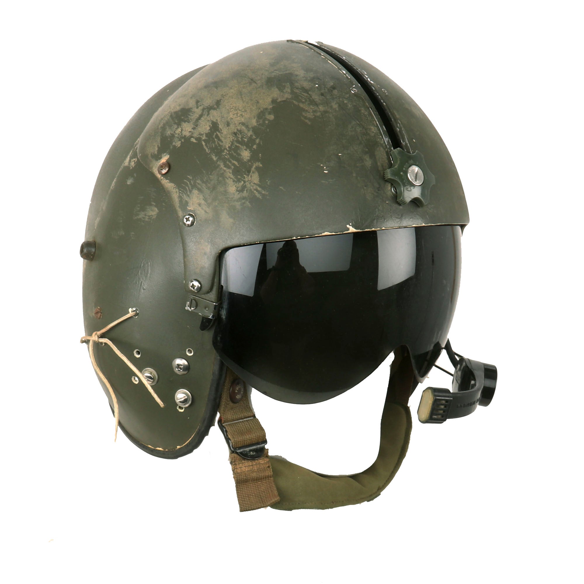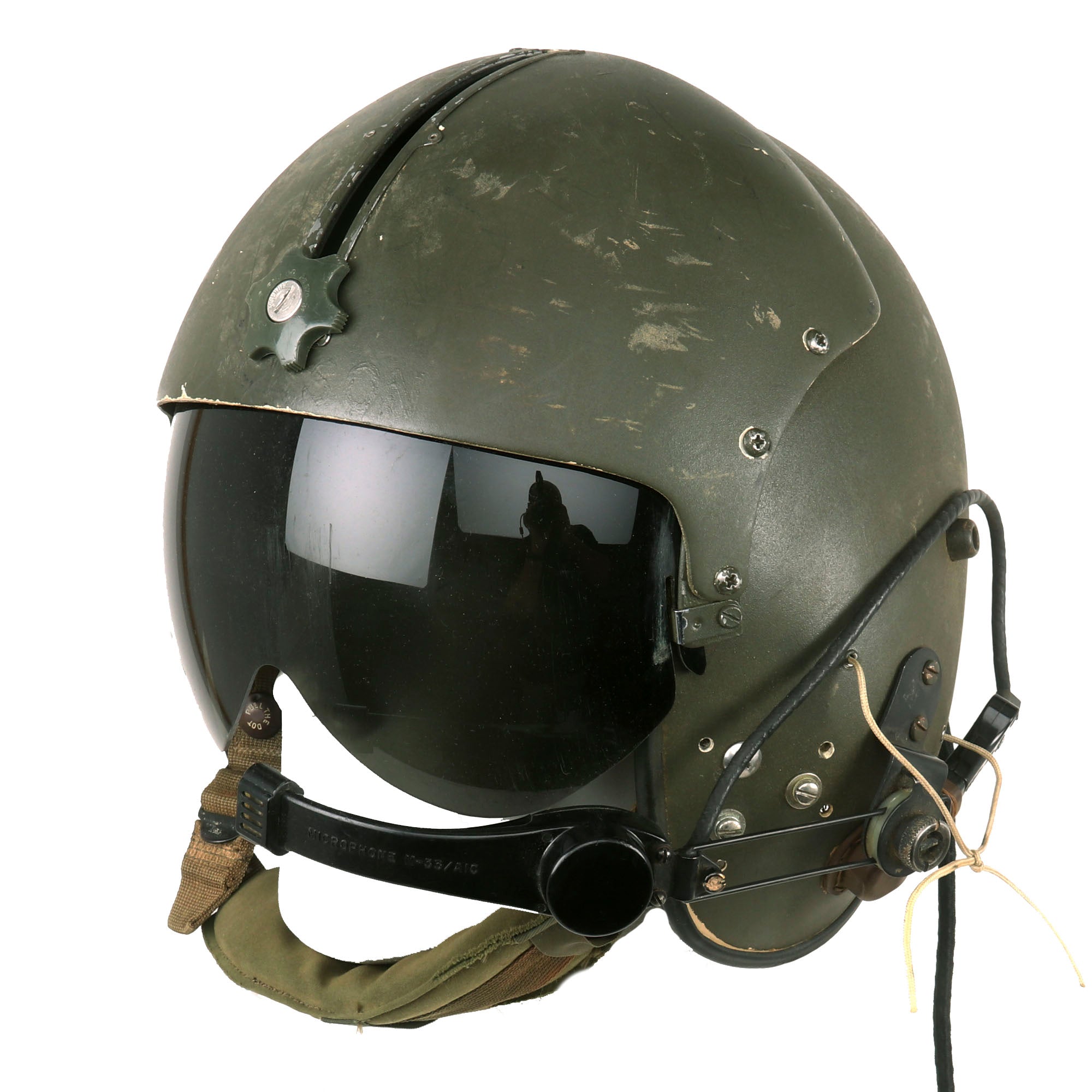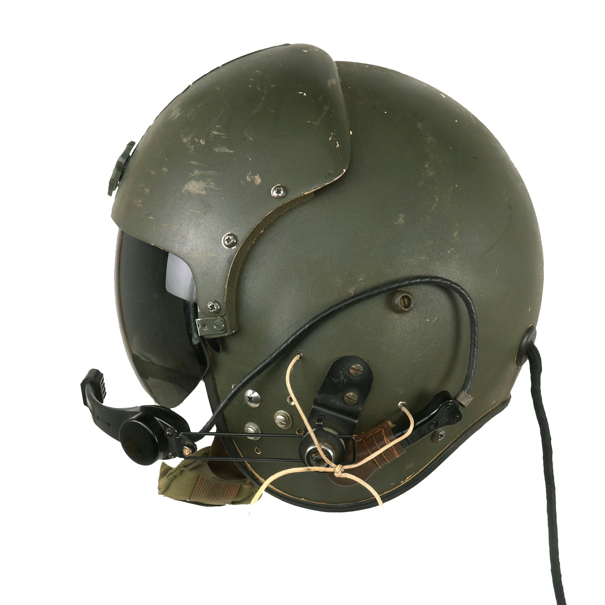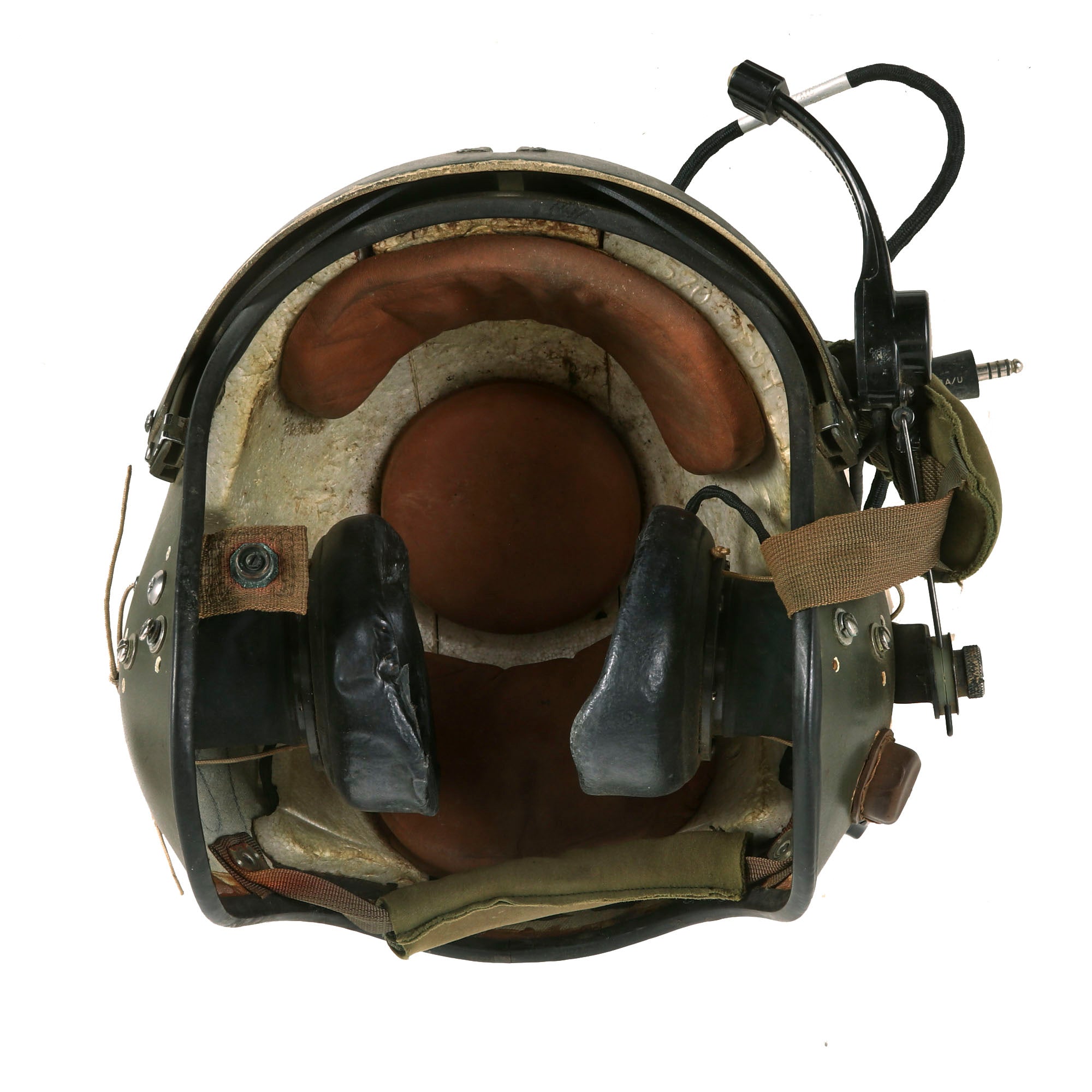 The visor is fully functional and displays great when extended. The helmet also retains its styrofoam and leather passing on the interior, with all straps still retained. This is a great example of the Quintessential Vietnam Helicopter Crewman Helmet in its original storage bag! Ready for further research and Display!