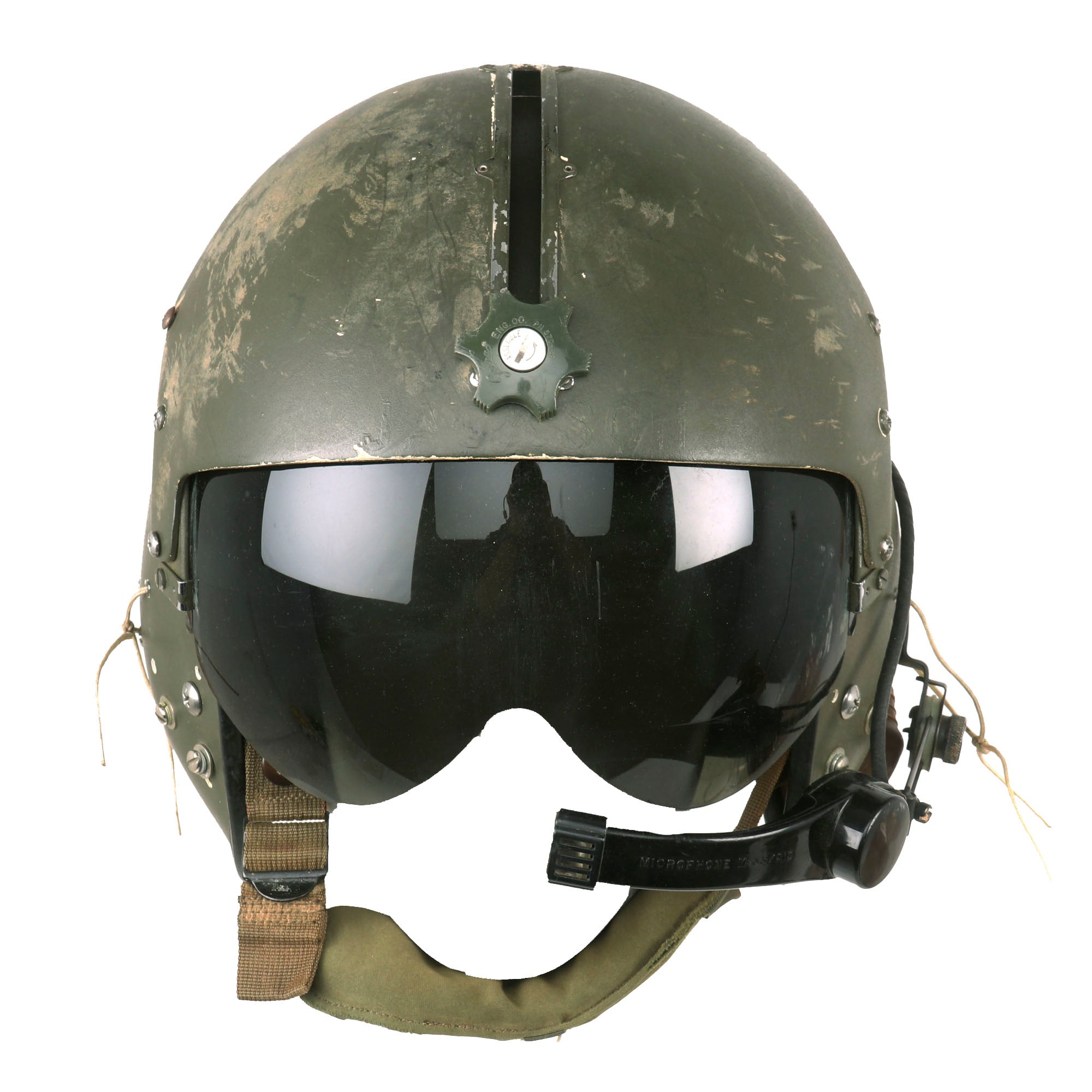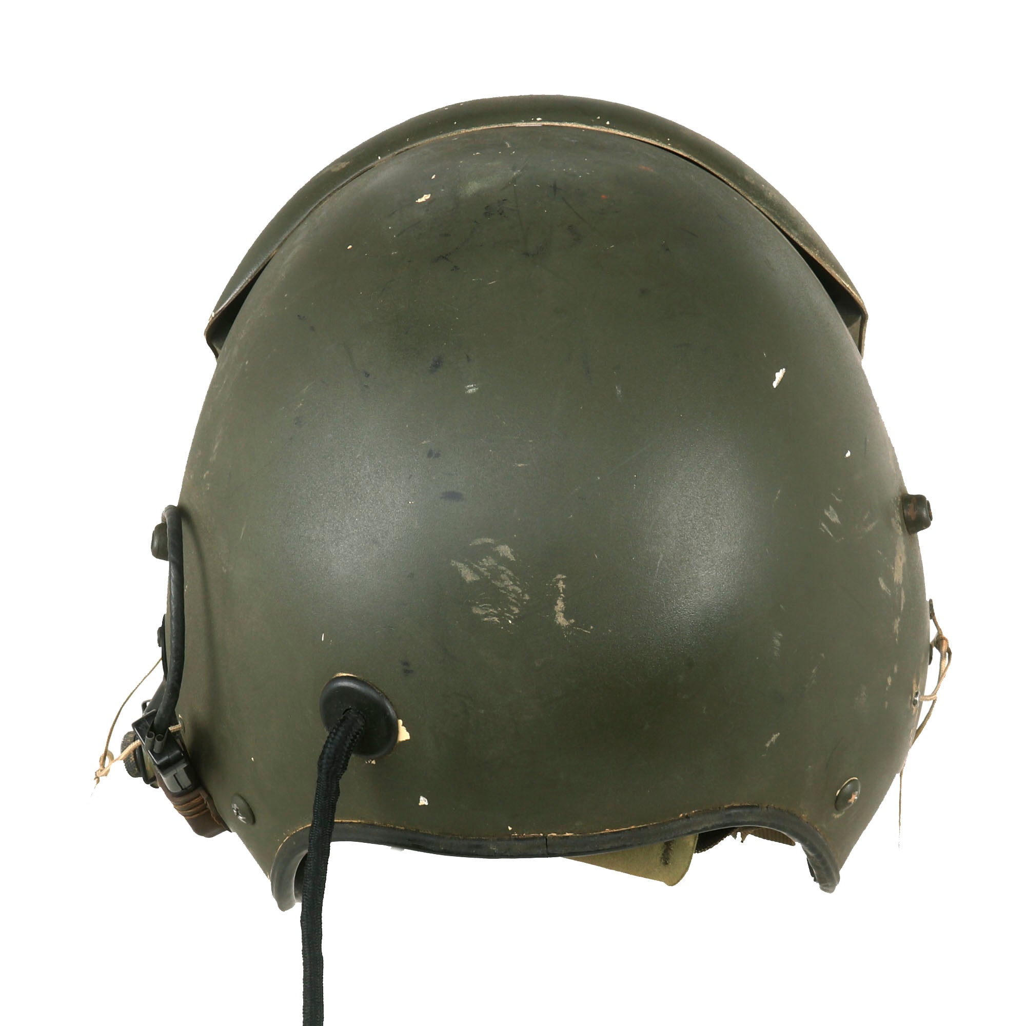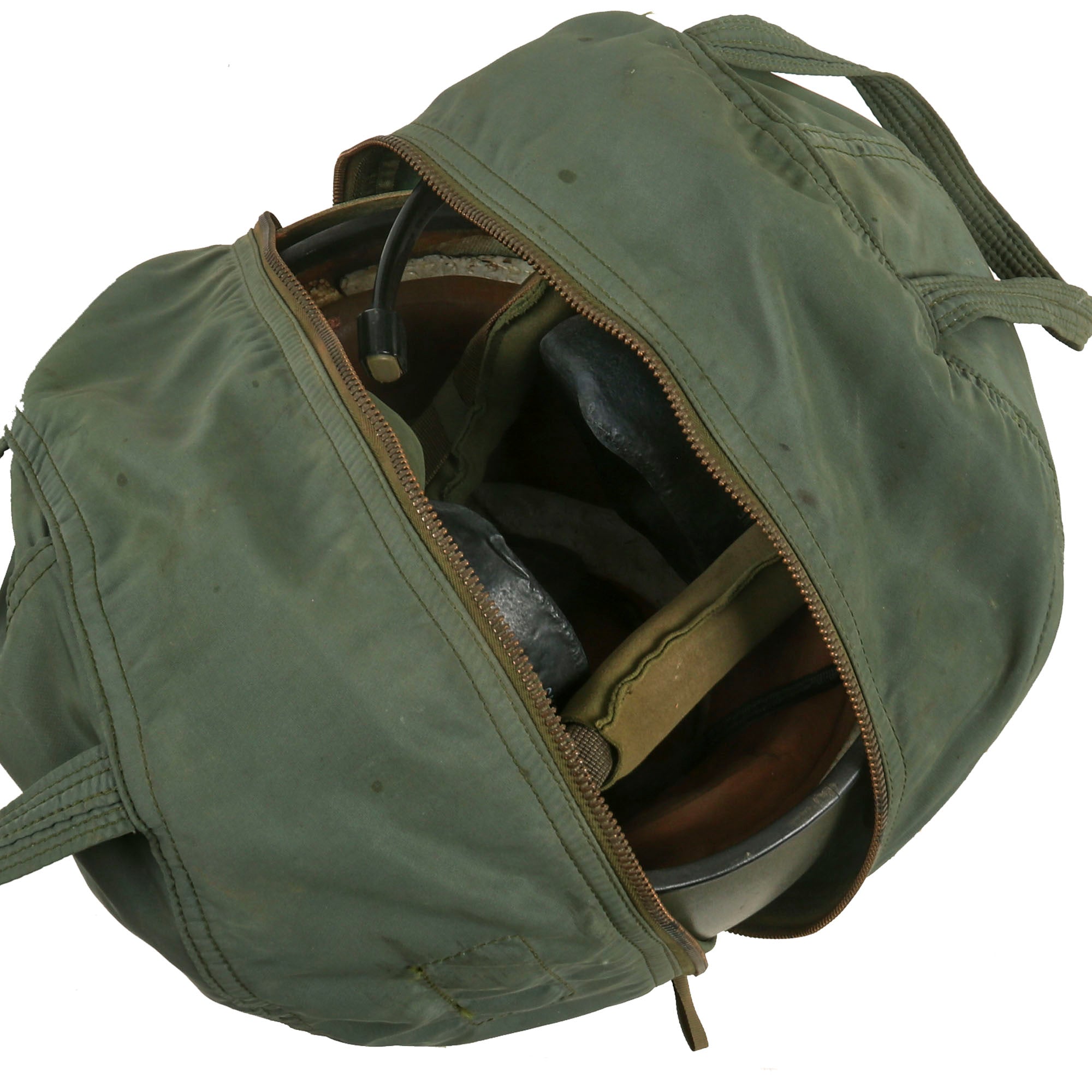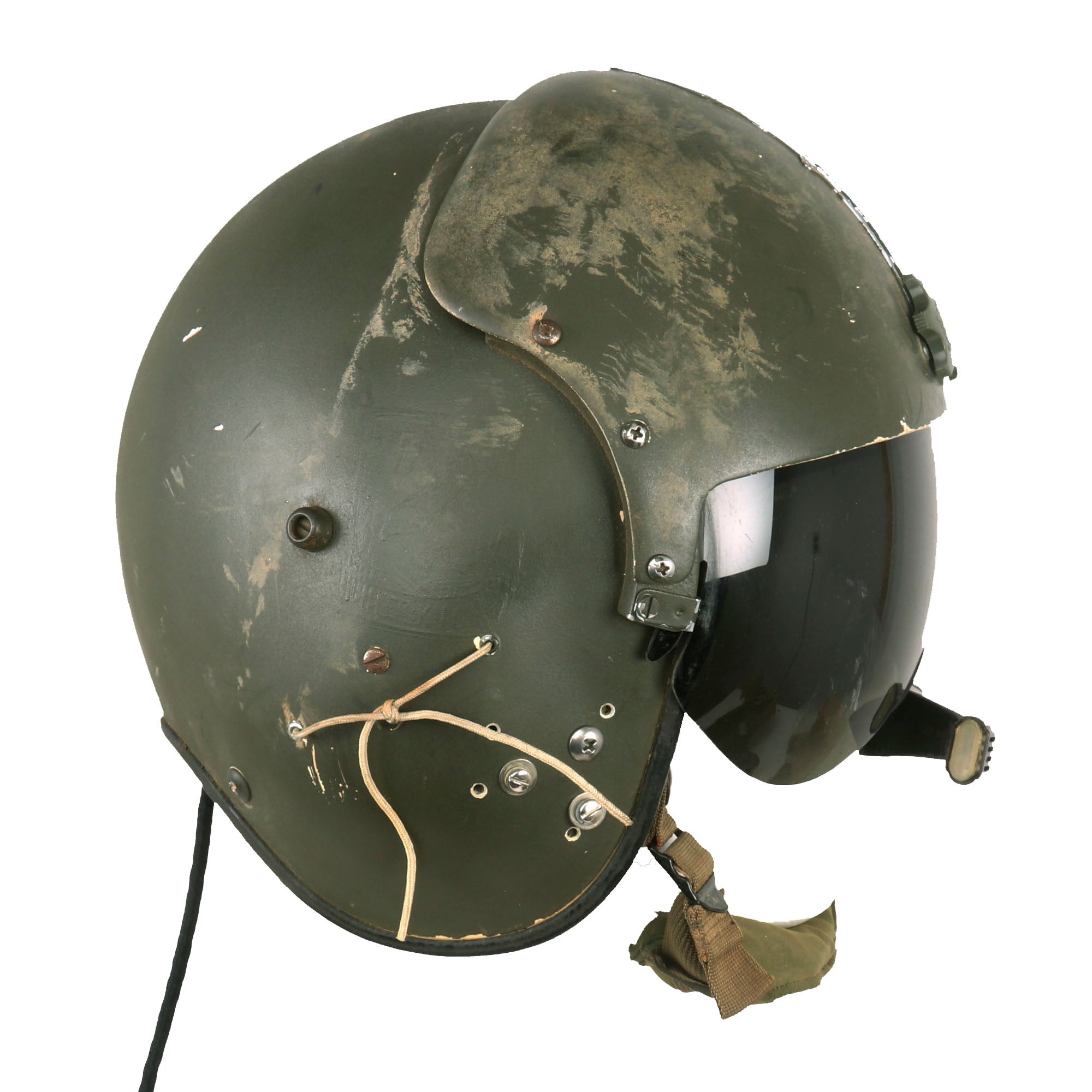The visor is fully functional and displays great when extended. The helmet also retains its styrofoam and leather passing on the interior, with all straps still retained. This is a great example of the Quintessential Vietnam Helicopter Crewman Helmet in its original storage bag! Ready for further research and Display!