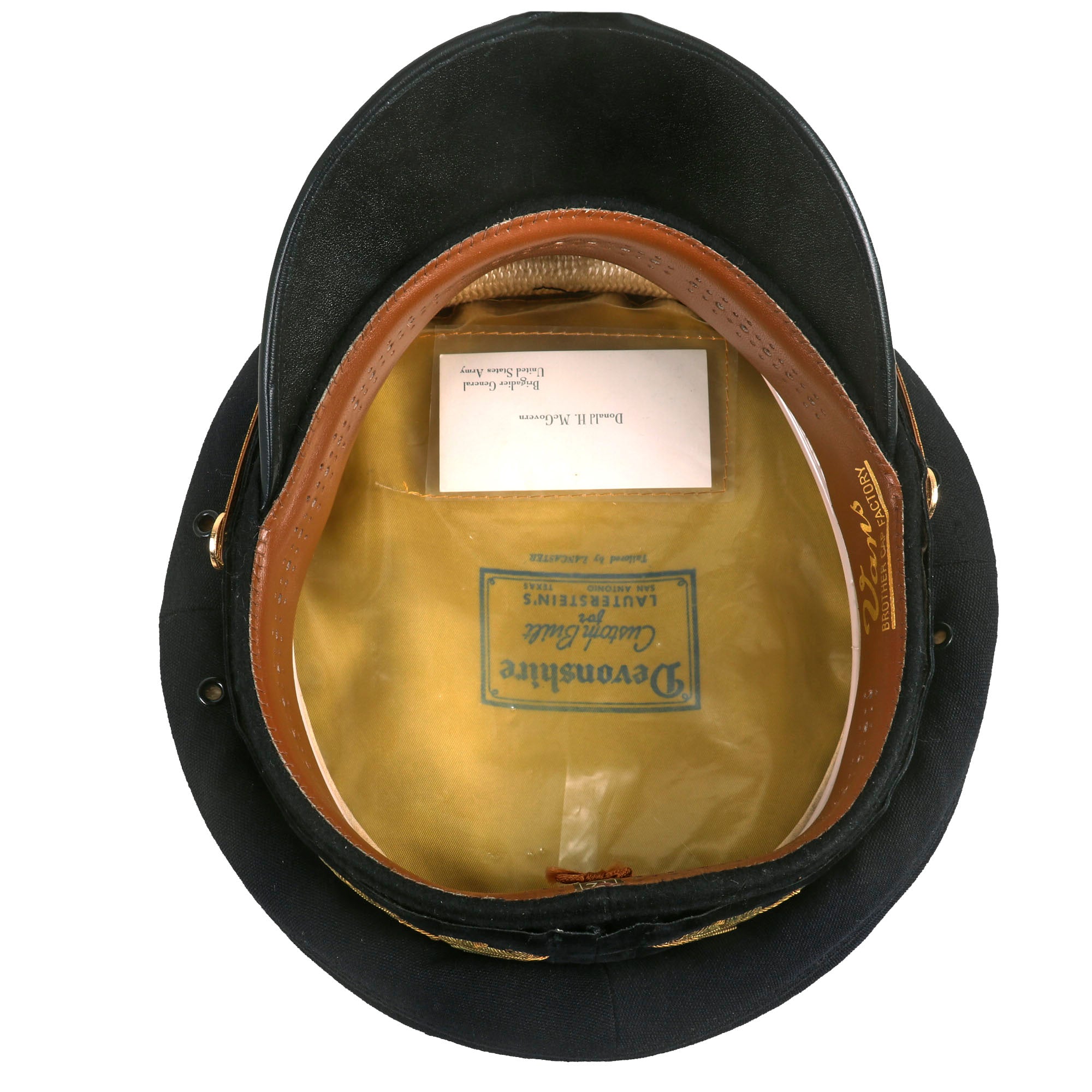Original Item: Only One Available. This is a fantastic example of an early Vietnam War Era (1968-69) US Army Dress Blues Uniform Peaked Visor for a General Officer. The cap shows very little signs of wear and is in near unissued condition. The top celluloid lining still retains the original “business card” for Brigadier General (1 Star) Donald H. McGovern.