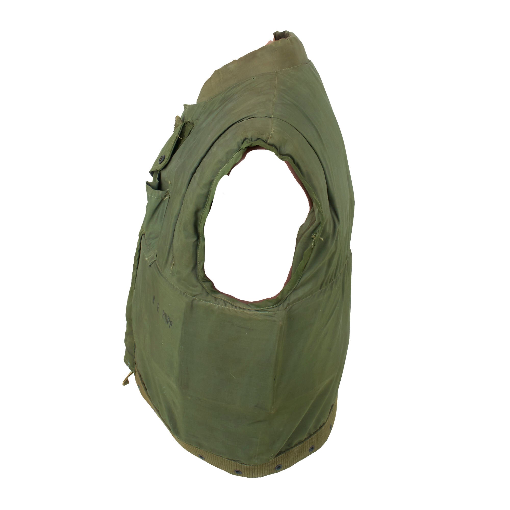 Over the right shoulder of the vest runs an approximately 45 cm long piece of rope sewn into cotton fabric, which is known as the "Rope Ridge". It prevents the strap of a slung rifle from slipping off the rather smooth shoulder of the vest. As this is the first pattern, there are no pockets. There is a stamped name on the front of the vest, R.E. BUPP, which likely indicates issue to Ronald E. Bupp, who graduated from the William Penn Senior High School in 1969, and enlisted in August 1969. By 1972 he was a Sergeant serving as Technical Chief with the 1st Battalion, 4th Marine Regiment, 3rd Marine Division in Okinawa.