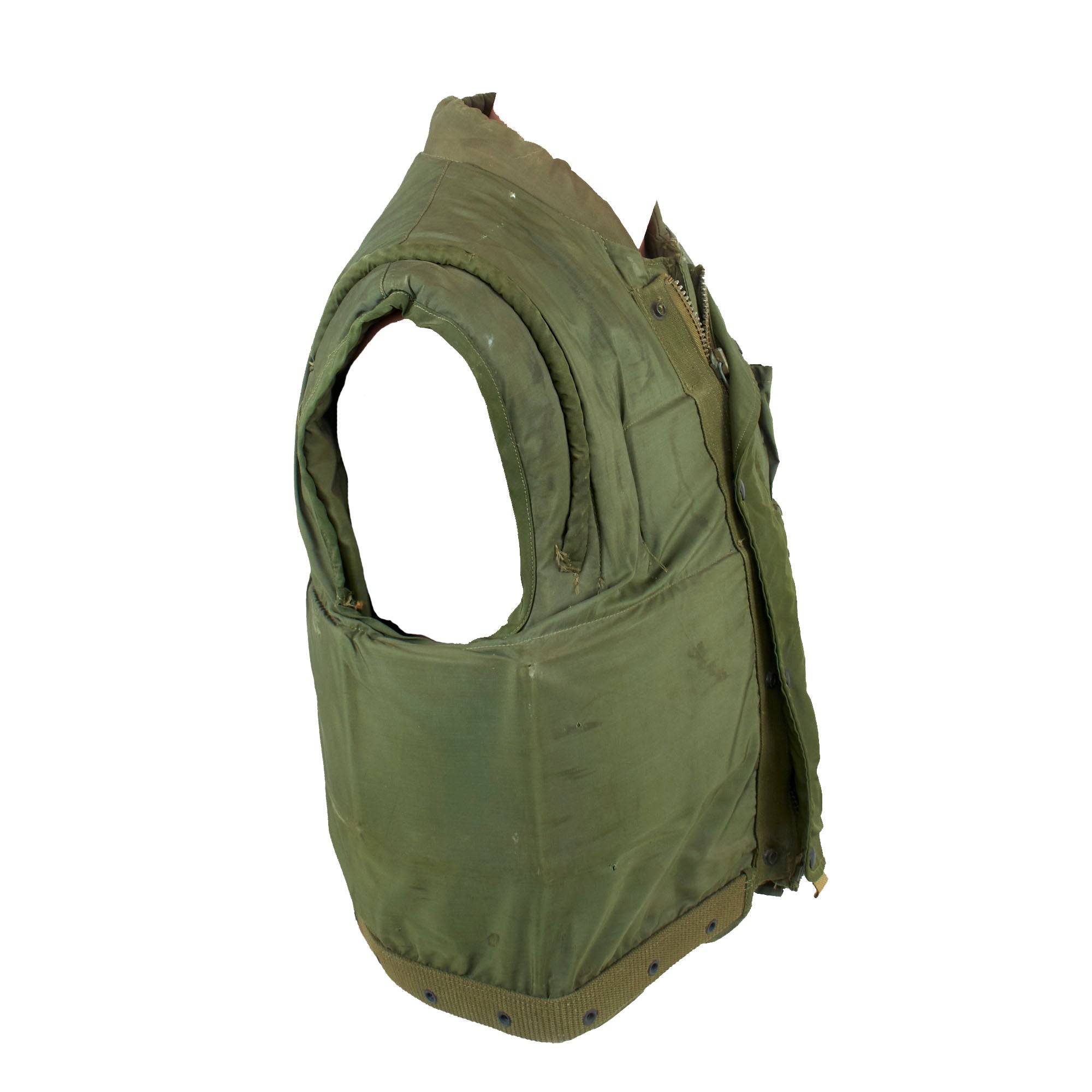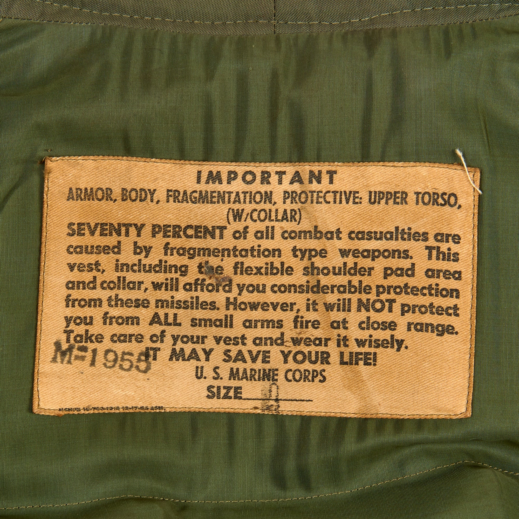 Original Item: Only One Available. This is a lovely example of the infamous M-1955 “Flak Jacket” as used by United States Marines since its introduction in 1955. This example is the scarce first pattern without pockets, and was unconverted after the second pattern was introduced.