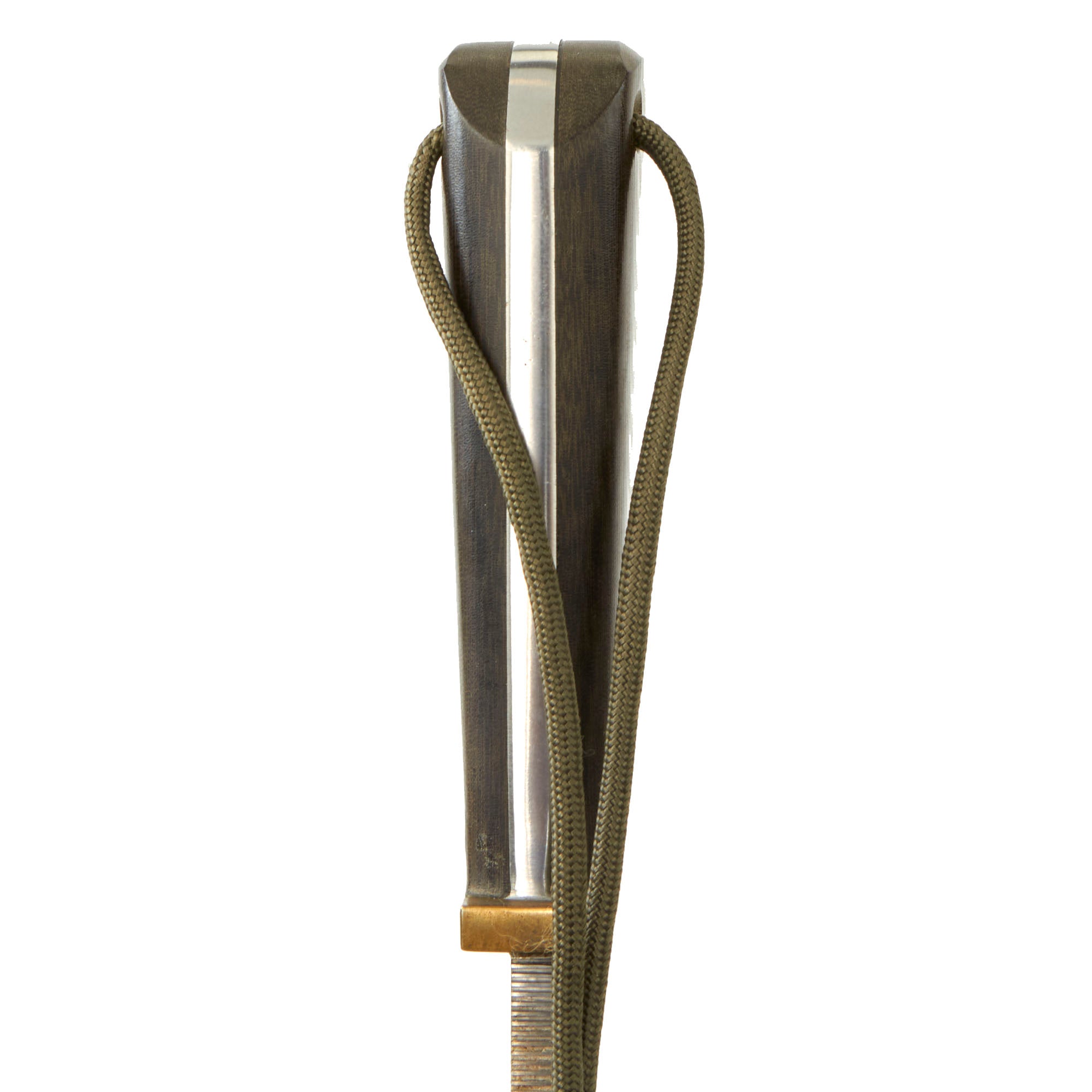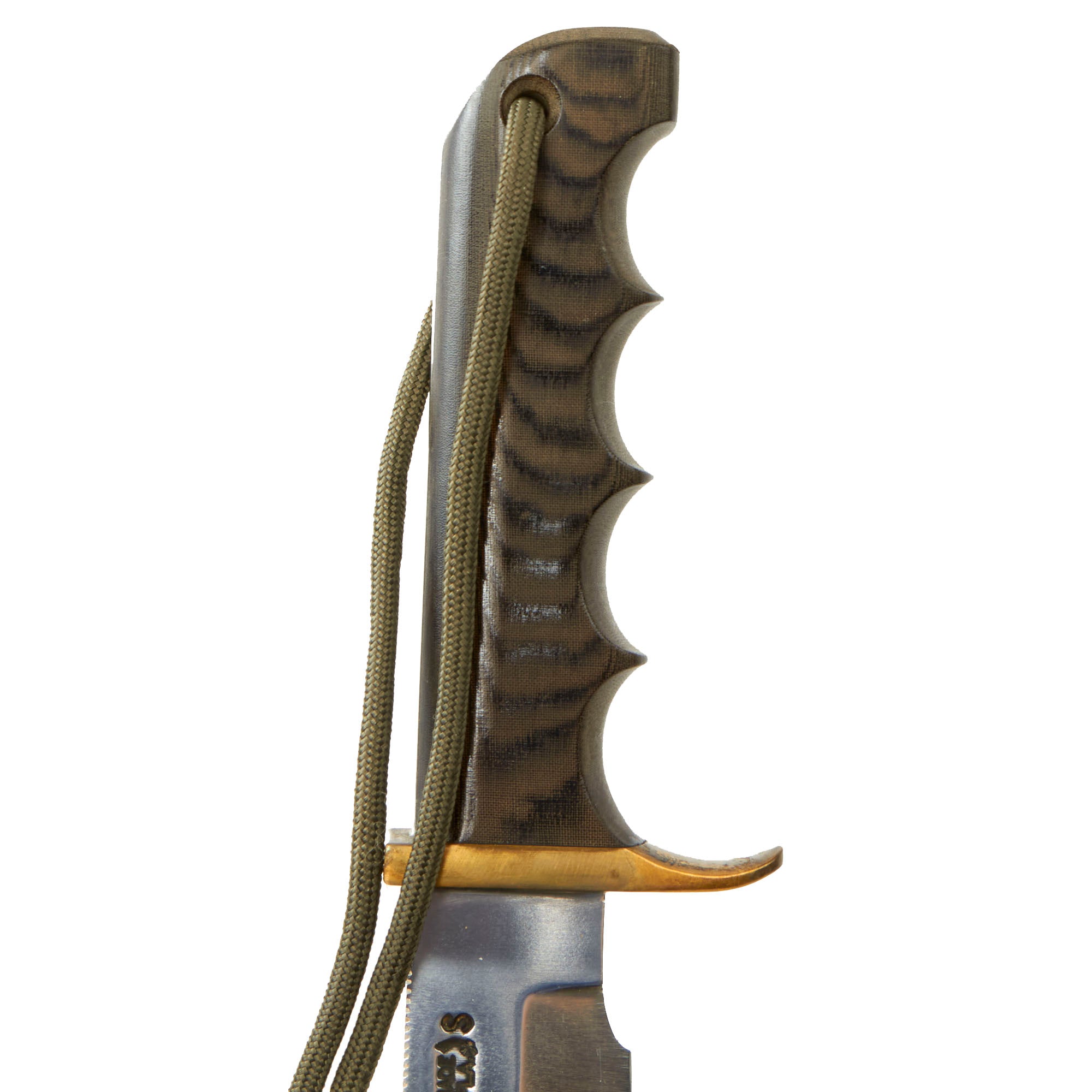 Brass cross guard, with black micarta handle with finger grooves. The knife comes with its original marked Randall brown leather sheath, complete with intact securing/leg strap.