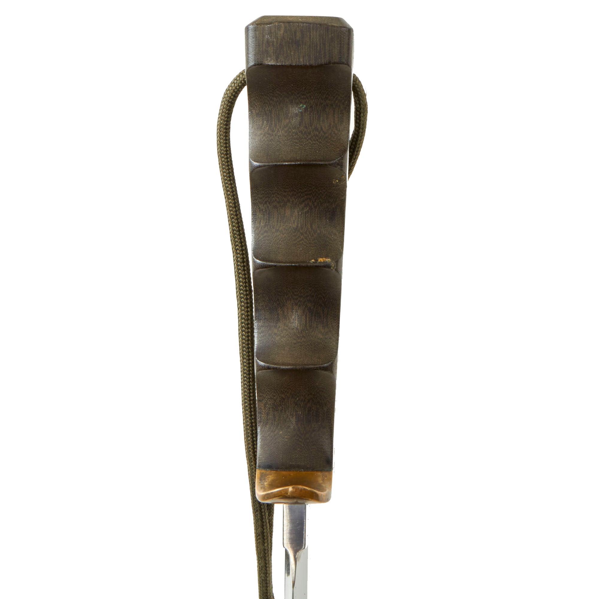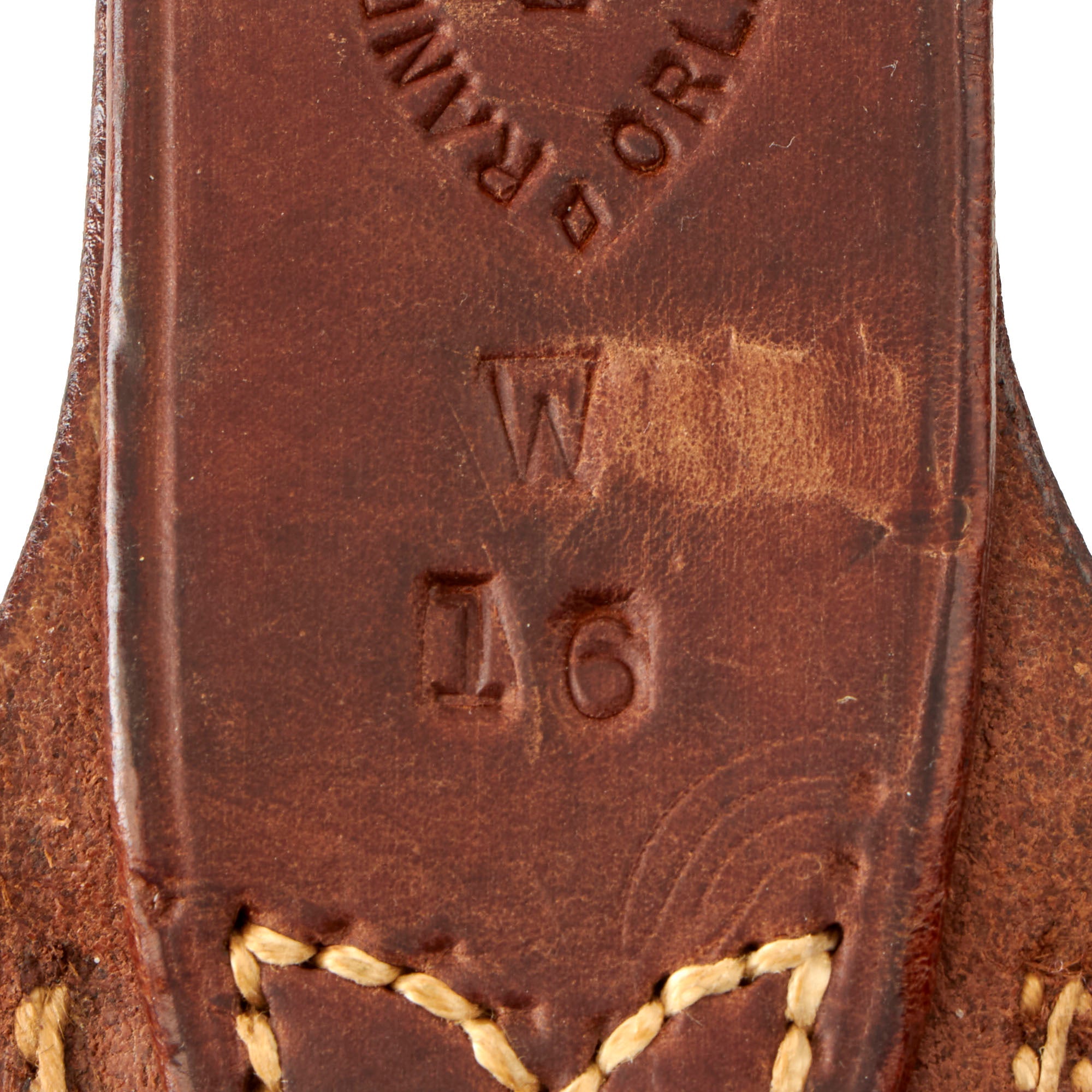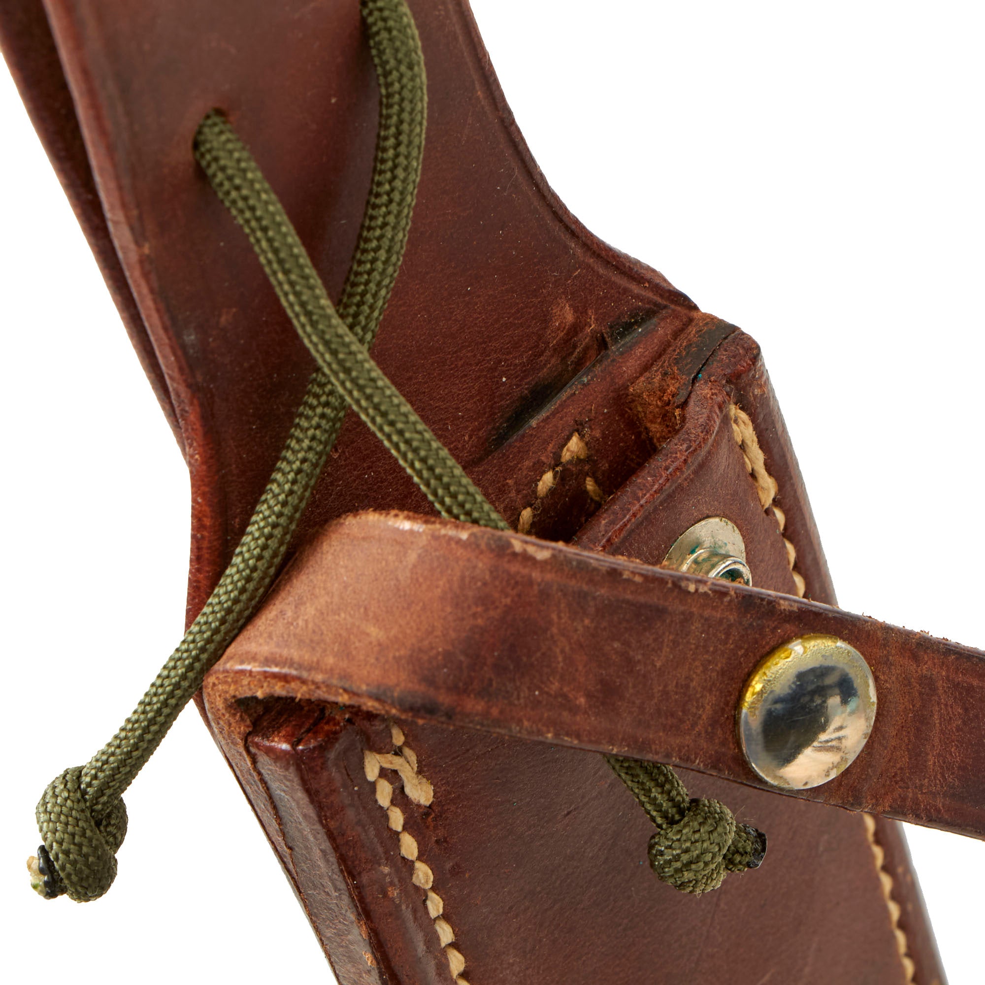The original Randall Sheath is also fine with tight stitching, attractive original russet brown finish, intact closure strap. Overall, the leather is in very good order, and is nice and pliable. There is oxidation on the metal fittings, and scuffs and scratches, as expected with any piece of historic leather.