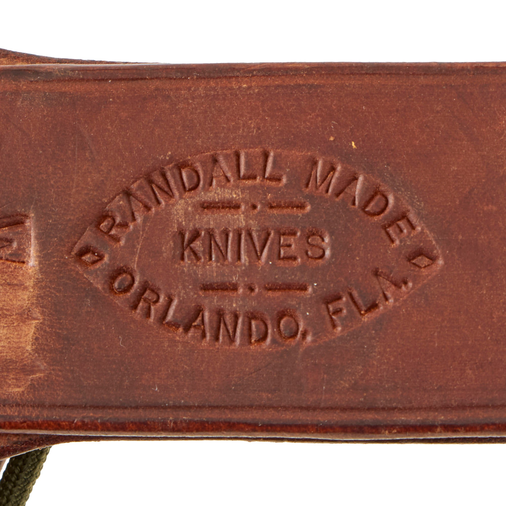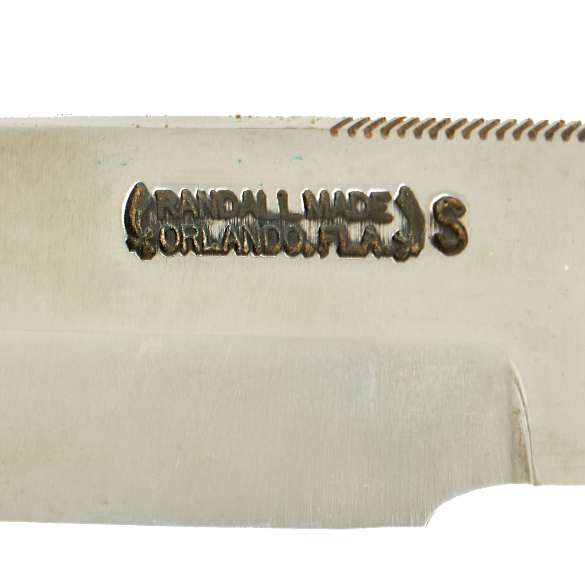 The knife measures 11 ½ inches overall, with a 7 inch steel blade, outfitted with a 1 ⅜ inch wide sharpened single edge and the scimitar flanked address reading "RANDALL MADE/ORLANDO, FLA." on the left side of the blade.