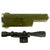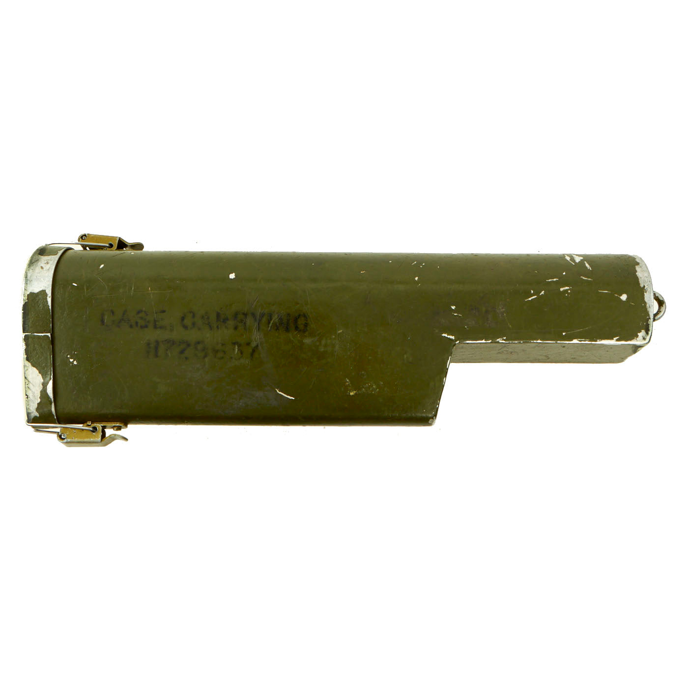The green hard case still retains a good majority of the original paint and still has faint, but readable markings: CASE, CARRYING / 11229637. The condition reflects many years of service use and it definitely served its purpose in protecting the optic. There is no extensive damage present to either the case or the belt loop attachment on the back side.