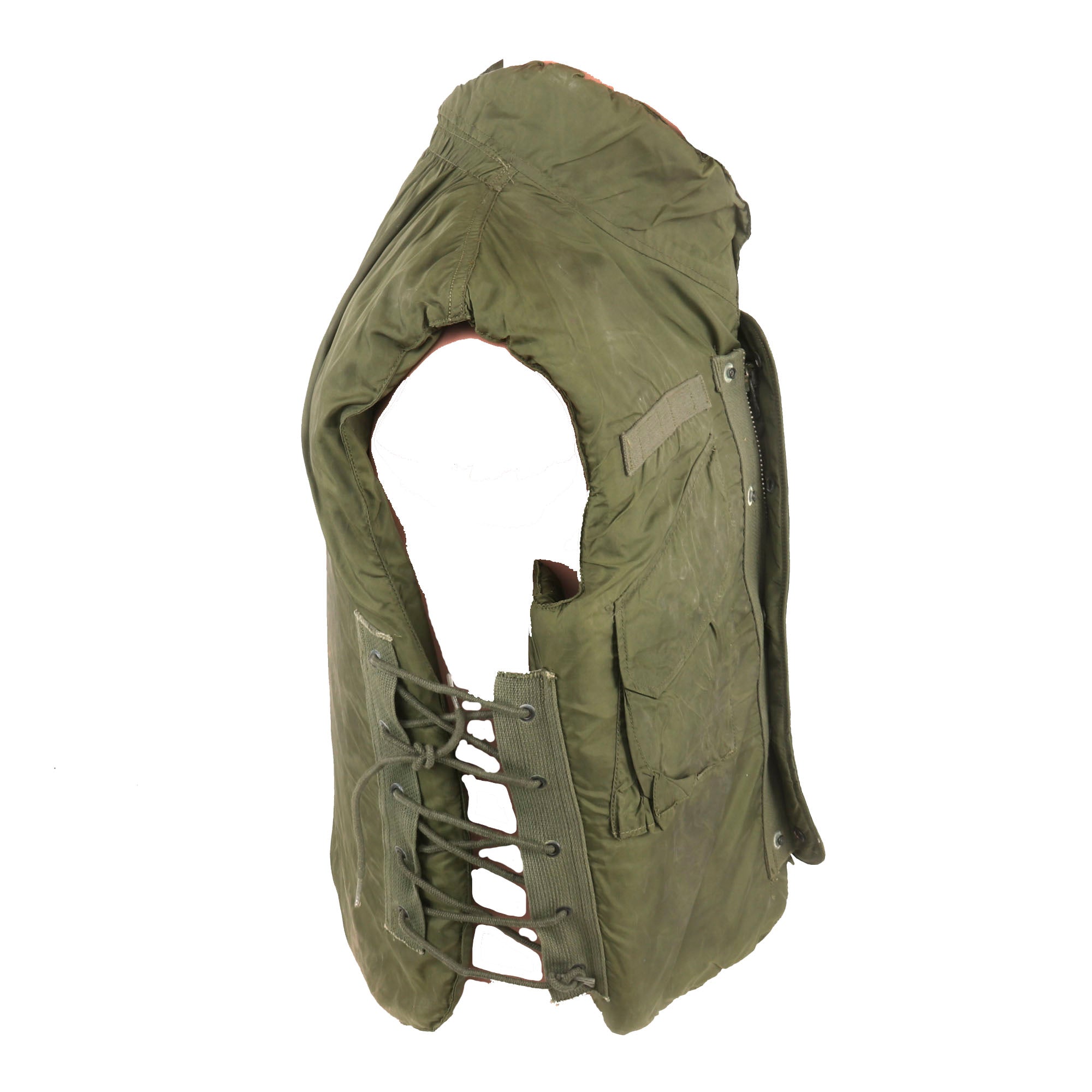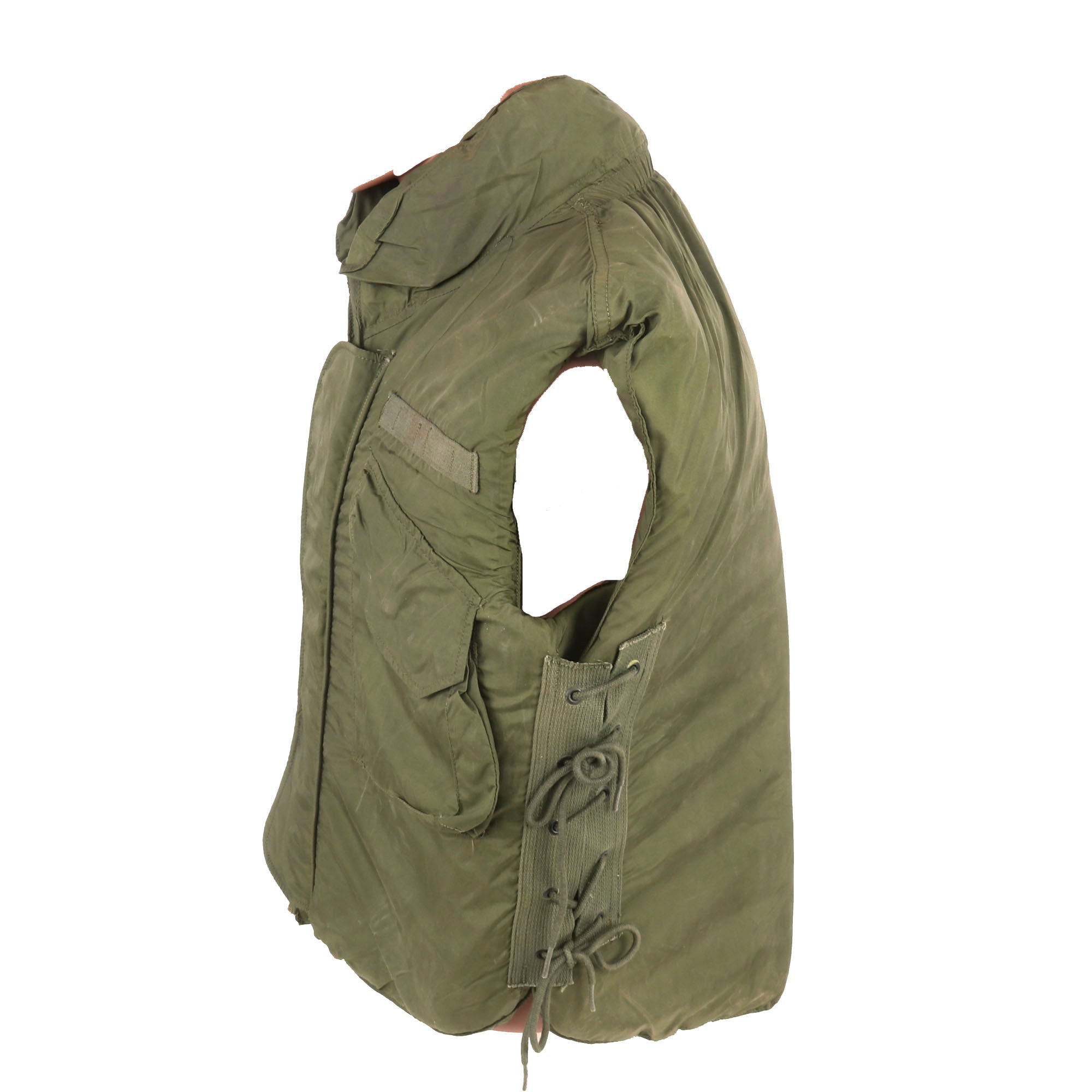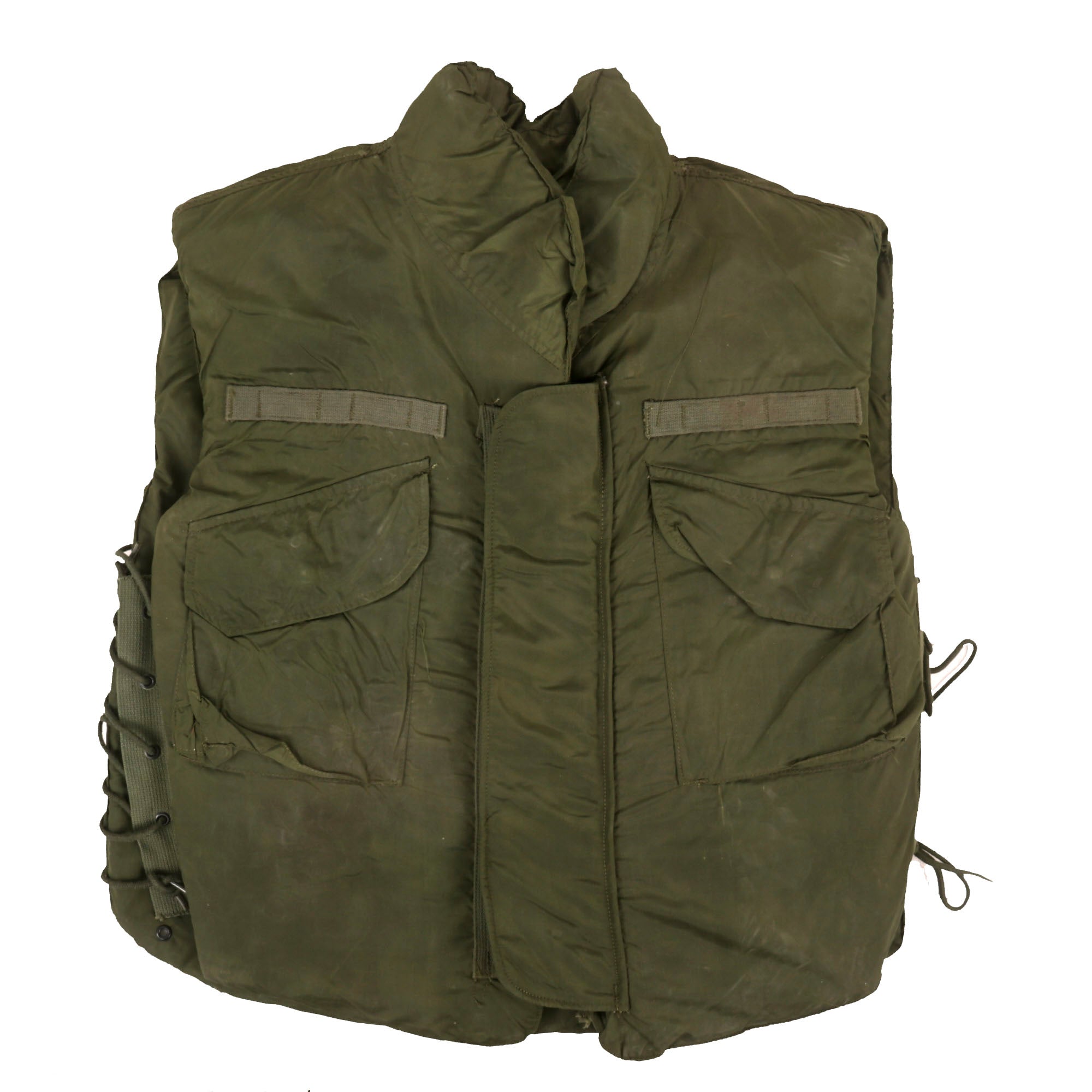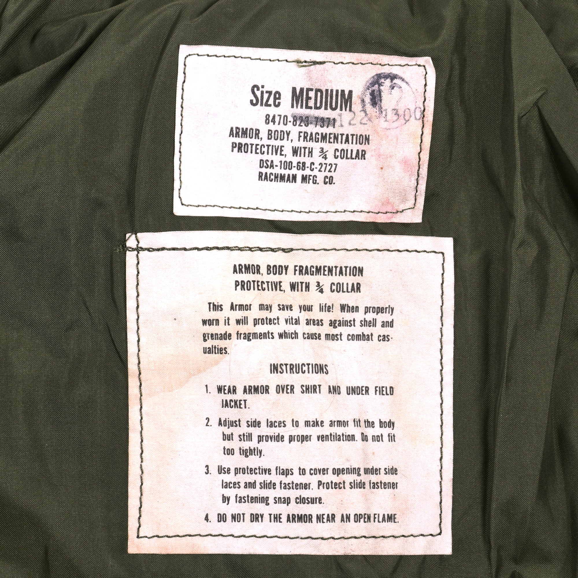 Original Item: Only One Available. This is a good condition M69 Flak Vest Body Armor with 3/4 Collar in a size MEDIUM. These were designed with side elastic drawstrings, snap reinforced front zipper, and front two pockets. This allowed a secure fit and maximum protection from shrapnel and low velocity projectiles. This is a very early production, dated 1968.Widely used by Army infantry, Navy sailors and Marines also were equipped with these, though not widely. Like its predecessor M-1952A, it was fabricated from 12 plies of ballistic nylon, to protect the wearer from explosion fragments. In fact, the name “M69” is the 1969 version of this series body armor’s model (ARMOR, BODY FRAGMENTATION PROTECTIVE, WITH ¾ COLLAR). This example differs from the normal M69 as there are snap closures instead of the velcro used in the official M69. Since this series of body armor are similar to each other, people refer to all of them by “M69”.This example still retains both labels, the first reading:SIZE MEDIUM8470-823-7371 (122-1300)ARMOR, BODY, FRAGMENTATIONPROTECTICE, WITH ¾ COLLARDSA-100-68-C-2727RACHMAN MFG. CO.This indicates it was manufactured in 1968 by the Rachman Manufacturing Company. The bottom instruction label reads:ARMOR, BODY FRAGMENTATIONPROTECTIVE, WITH 3/4 COLLARThis armor may save your life! When properly worn, it willProtect vital areas against shell and grenade fragments whichCause most combat casualties.INSTRUCTIONS1. WEAR ARMOR OVER SHIRT AND UNDER FIELD JACKET2. Adjust side laces to make armor fit the body but stillprovide proper ventilation. Do not fit too tightly.3. Use protective flaps to cover opening under side lacesand slide fastener. Protect slide fastener by fastening snapclosure.4. DO NOT DRY THE ARMOR NEAR AN OPEN FLAME.The flak jacket is in wonderful, service worn condition, offered in size medium.Comes ready for display.
