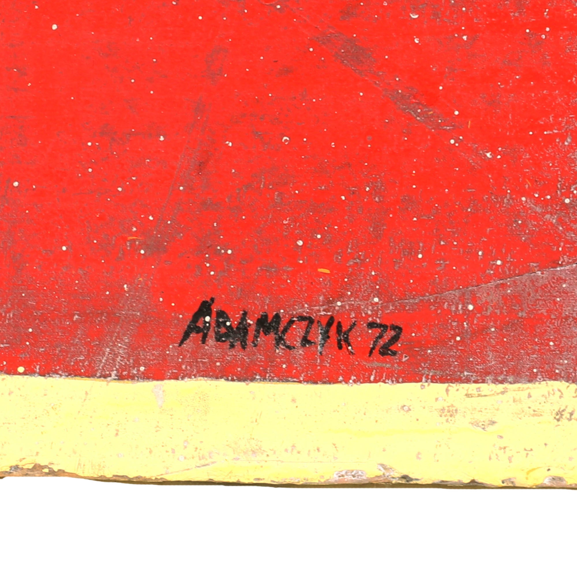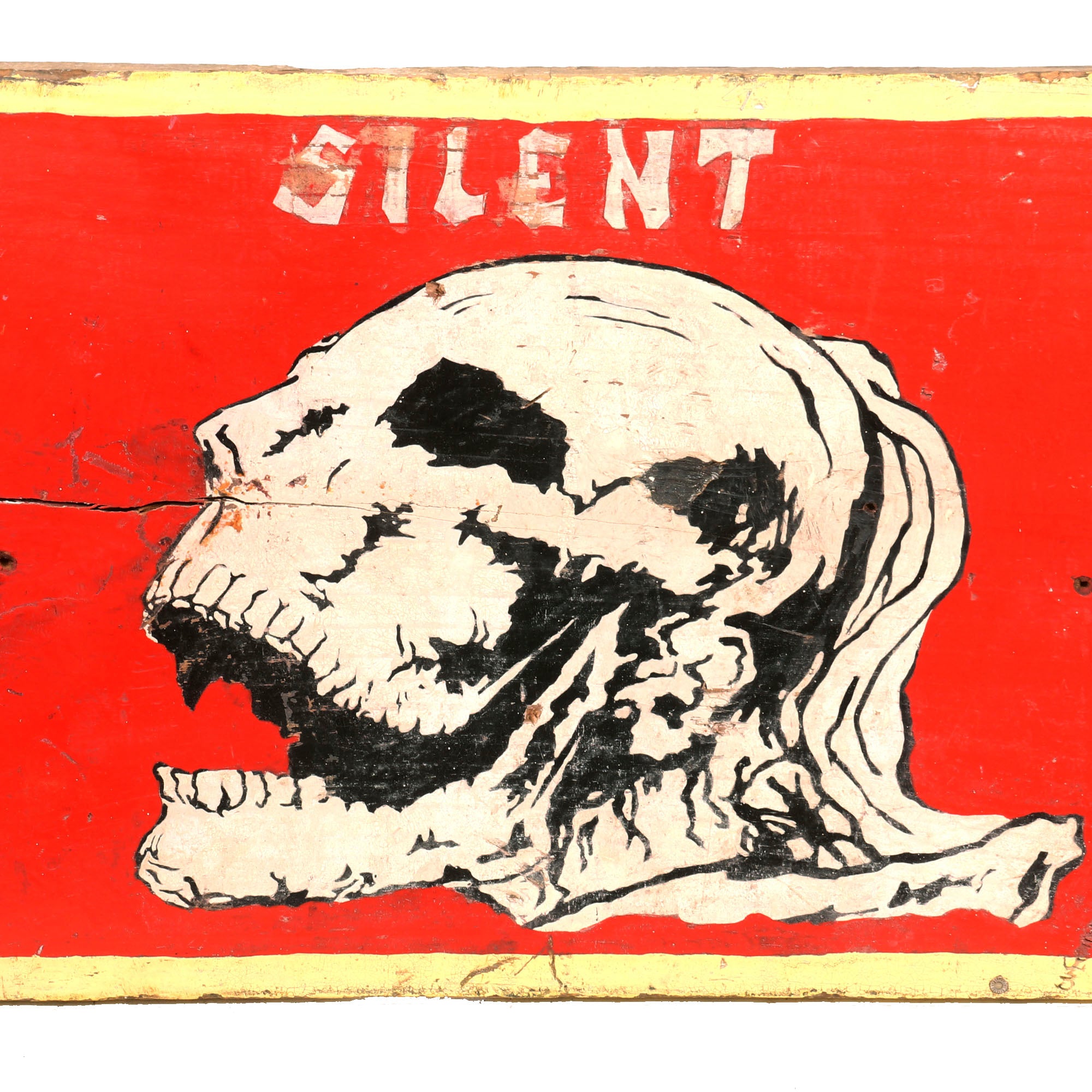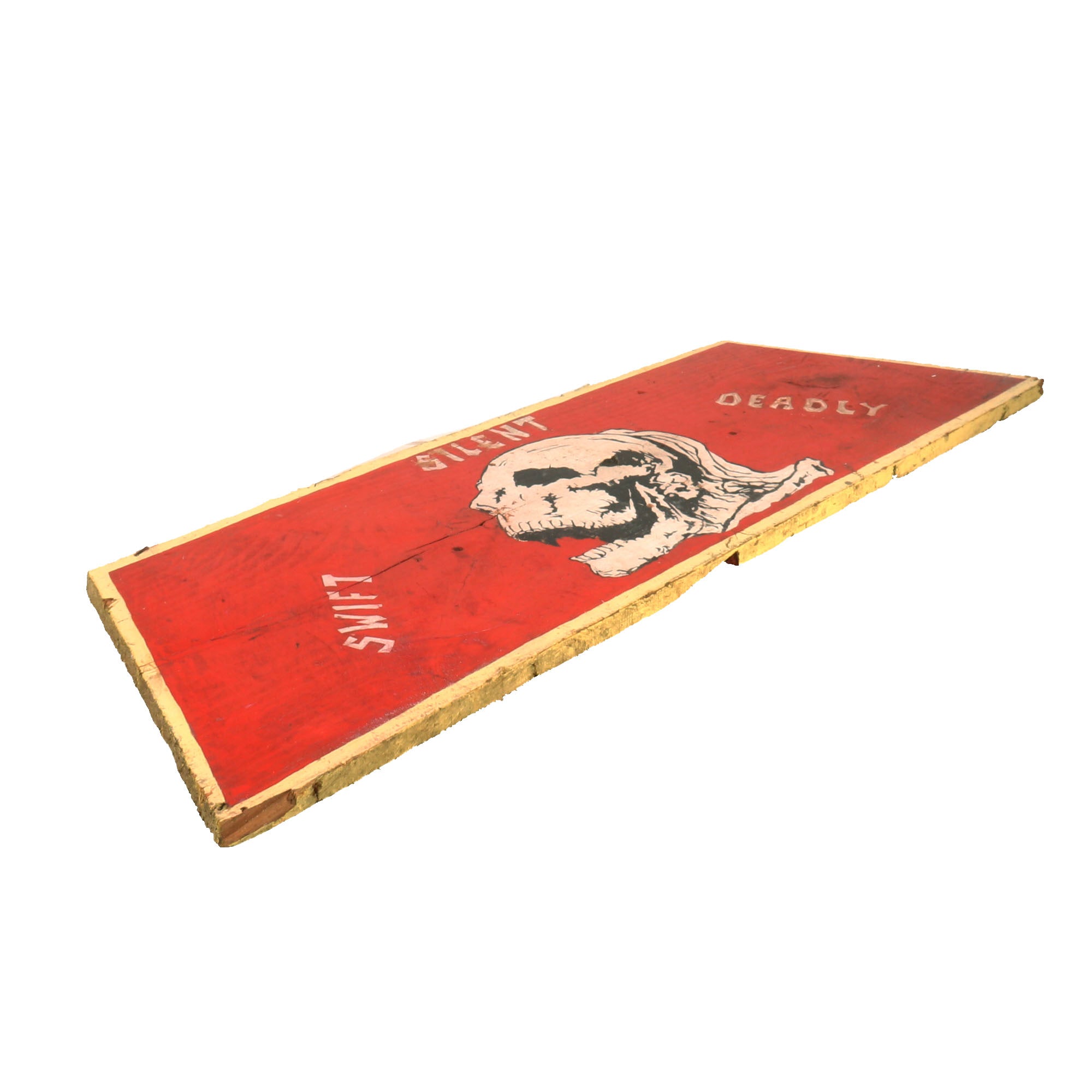 Original Item. One-of-a-Kind. This is a phenomenal trapezoidal wooden sign for use by the 2nd Reconnaissance Battalion of the United States Marine Corps. The sign is painted red with a tan border and a screaming skull painted in the middle surrounded by the phrase SWIFT SILENT DEADLY. It is signed ADAMCZYK ‘72 in the bottom right corner. The sign is roughly 39” long at the bottom and 29½” long at the top, 11¼” tall, and about ¾” thick.