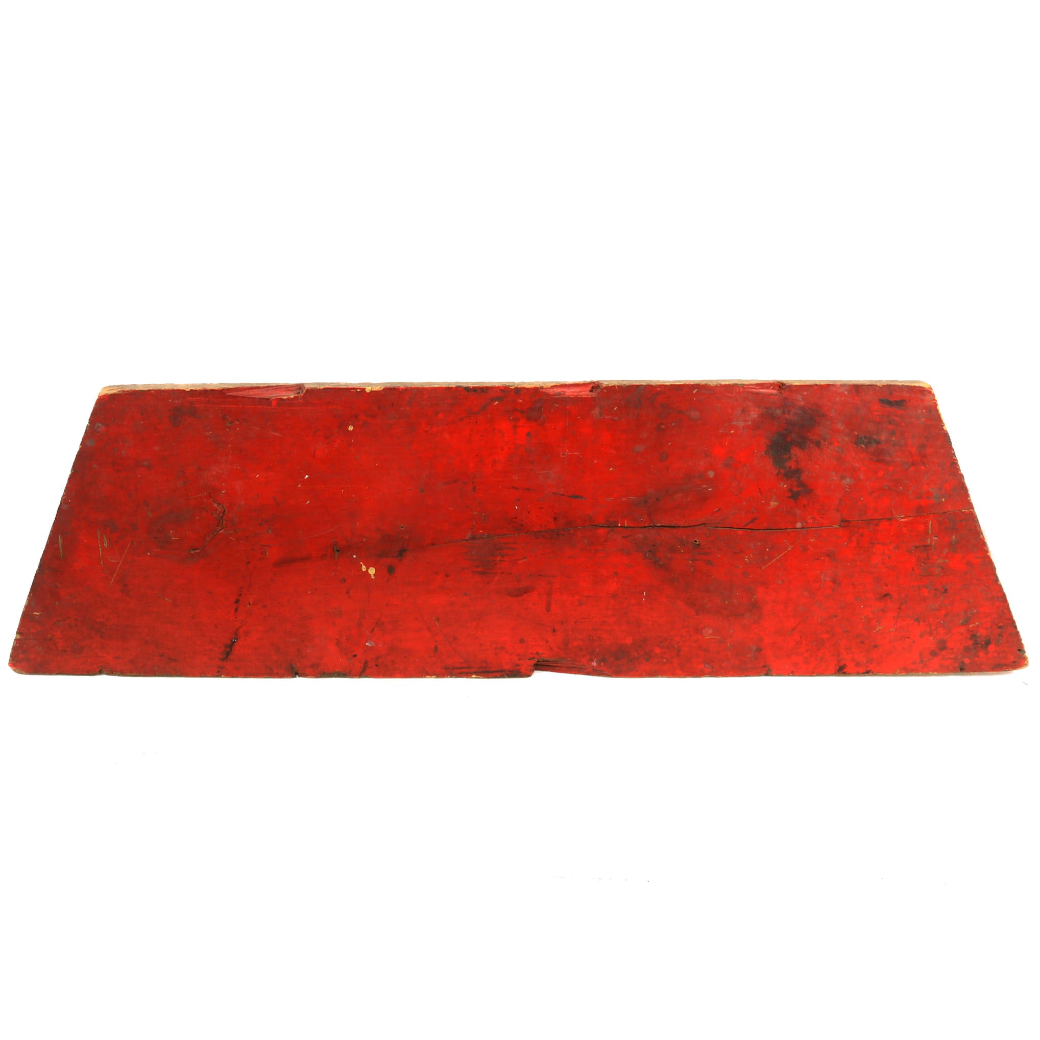 The sign has some damage as shown including a large crack stretching from the left side to near the center, and it has about six holes from nailing, likely meaning it was used as a barracks or mess hall sign. The paint is nearly all retained without any serious damage, and the damage that is present provides a fantastic patina to the sign. The back of the sign shows some wood loss especially at the bottom, but as the red paint is painted over this loss, it likely happened during the period.