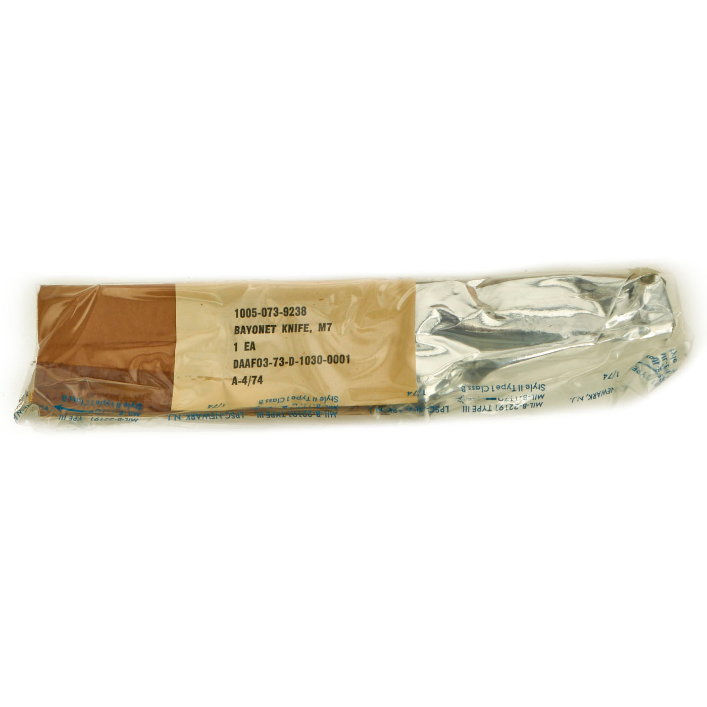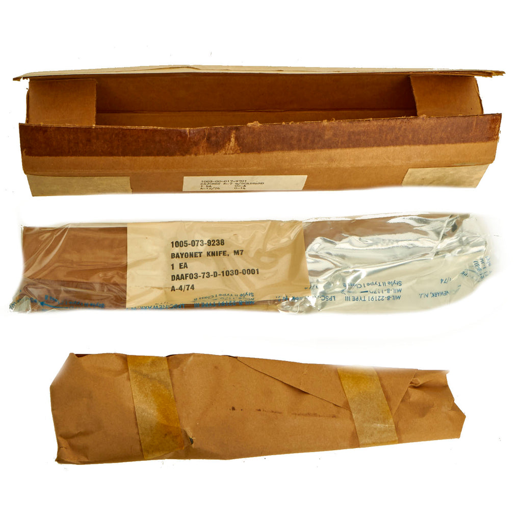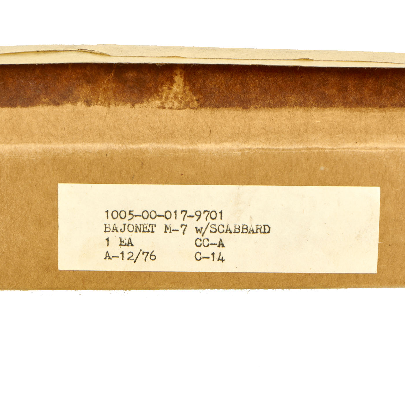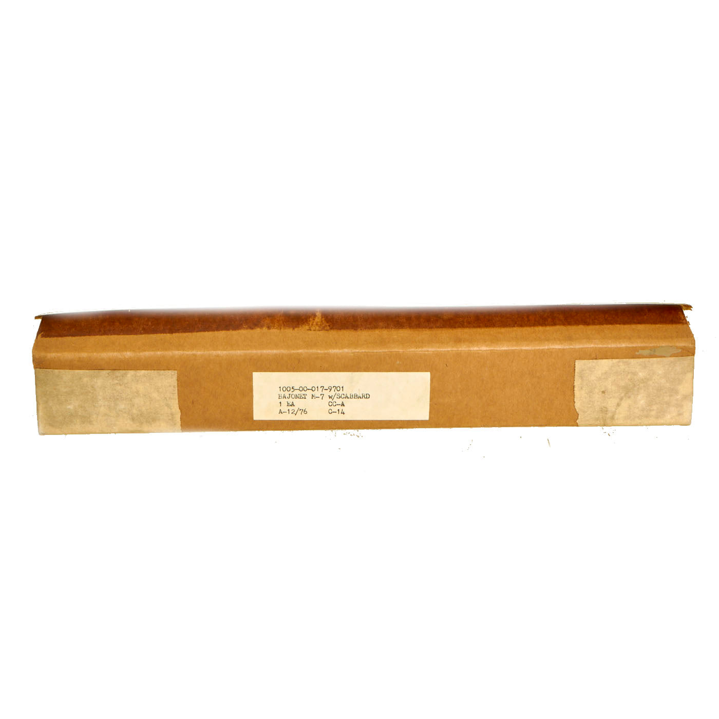 Original Item: Only One Available. Now this is a fantastic opportunity to add an unopened and unissued M7 bayonet to your collection! We have not opened the packaging, but they were removed from the repack box to confirm the contents of the bayonet and scabbard. If you should choose to open the items, be mindful, although these are still packaged, there could be minor oxidation present. The contents came in a box that differs from the original box in which this set would have came in, so the numbers do not match. The bayonet packaging is dated 1973, and the “repack” box is dated 1976.