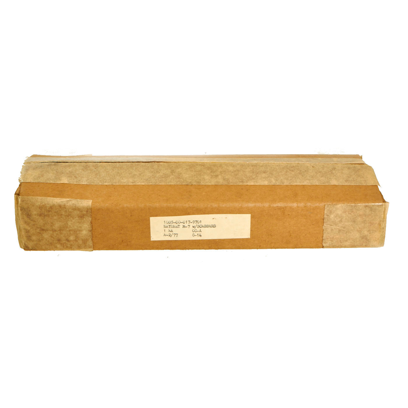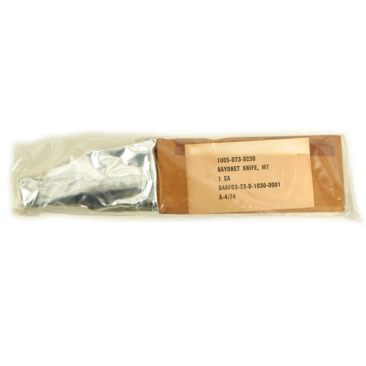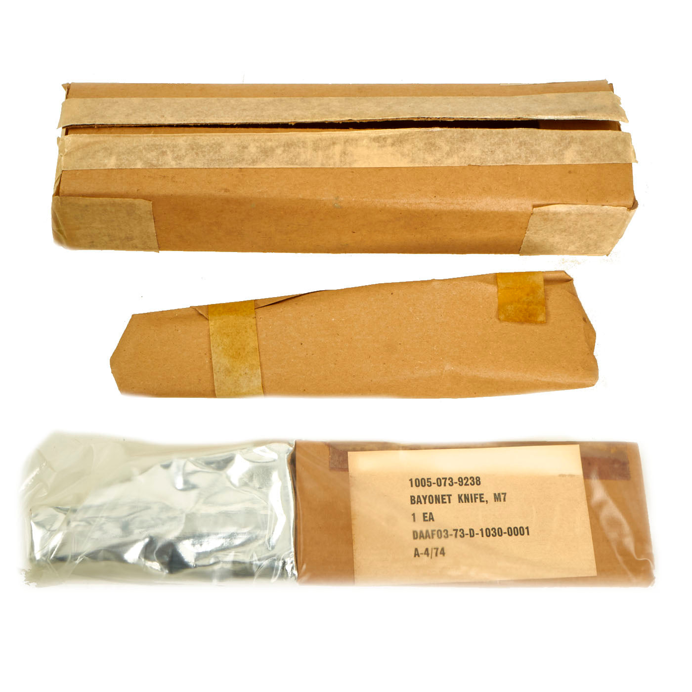 Original Item: Only One Available. Now this is a fantastic opportunity to add an unopened and unissued M7 bayonet to your collection! We have not opened the packaging, but they were removed from the repack box to confirm the contents of the bayonet and scabbard. If you should choose to open the items, be mindful, although these are still packaged, there could be minor oxidation present. The contents came in a box that differs from the original box in which this set would have came in, so the numbers do not match. The bayonet packaging is dated 1973, and the “repack” box is dated 1977.