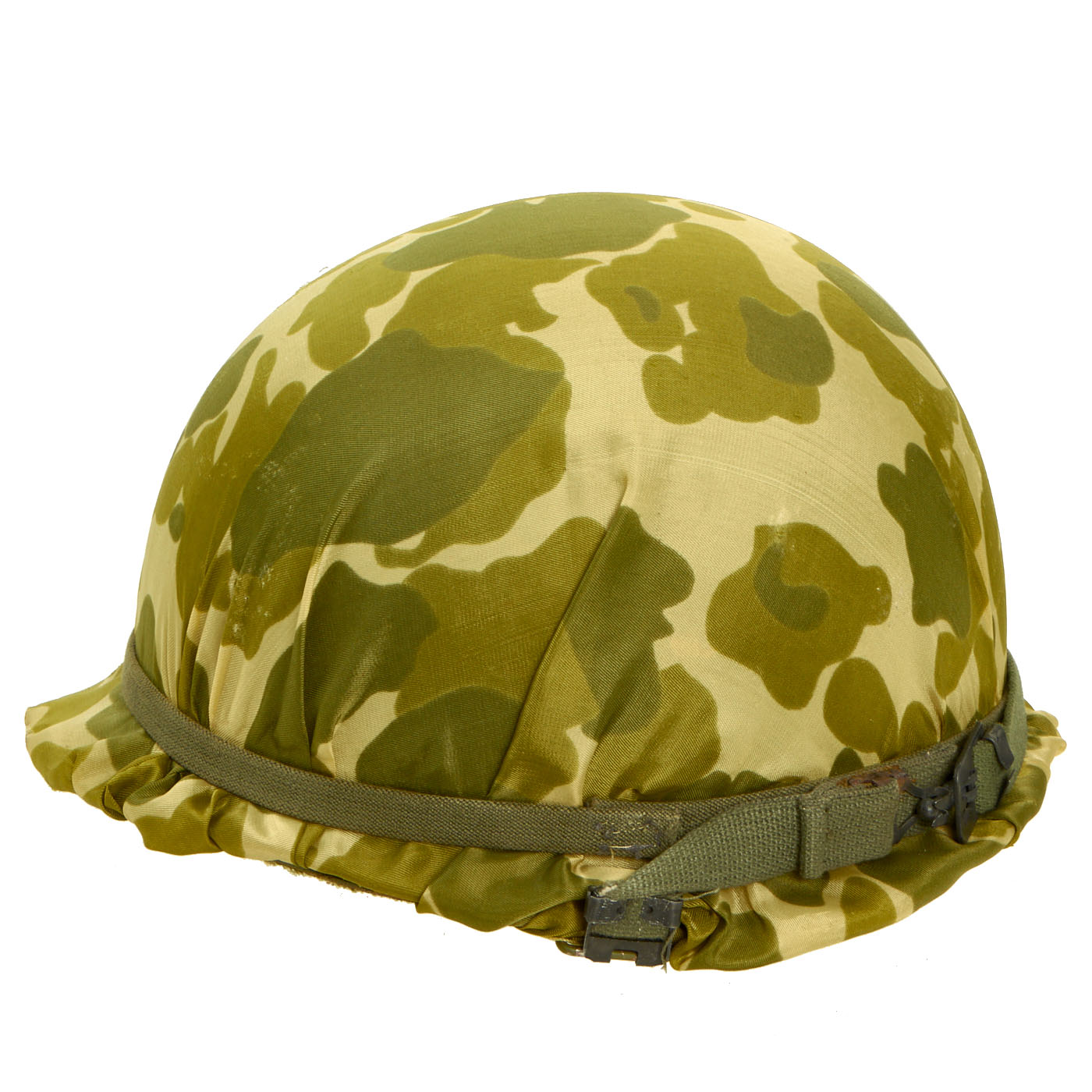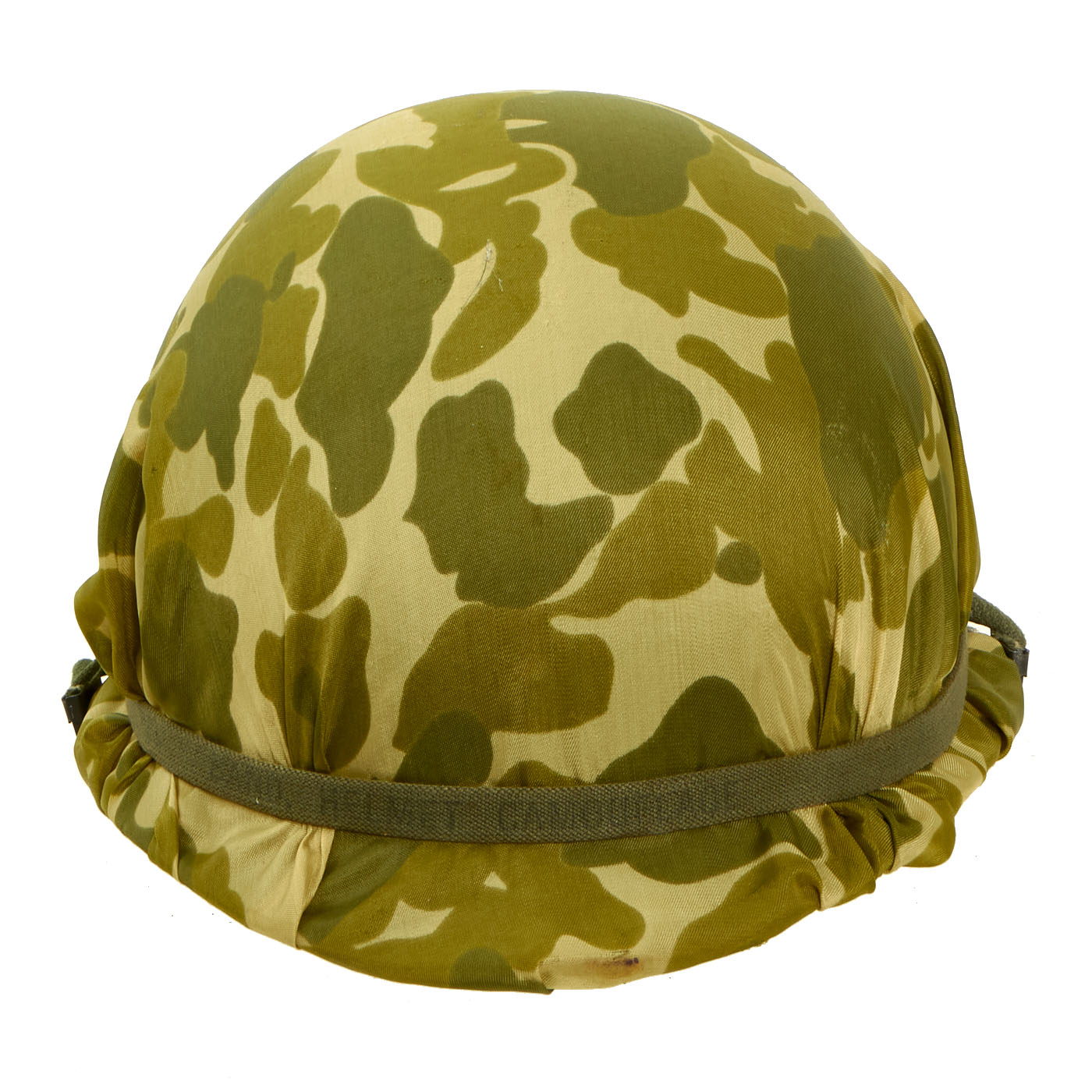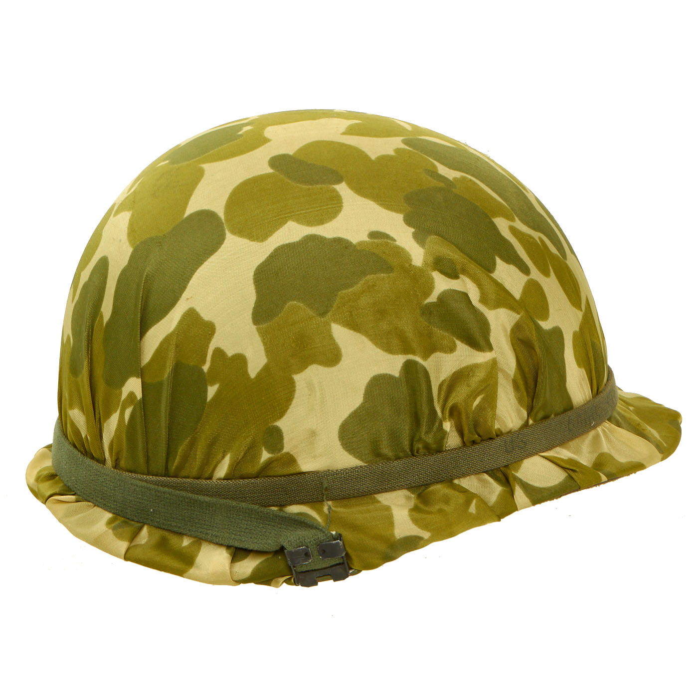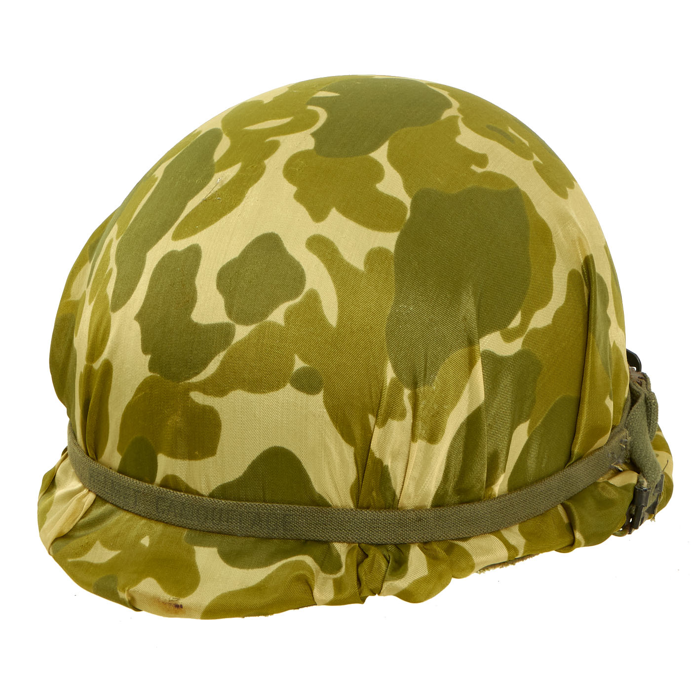 This helmet is a fine example and still retains all of its original Vietnam War parts and the shell has all original corked grain paint. The cover used is a section of parachute canopy silk. It was a common practice during WWII, Korea and the Vietnam War to use canopy silk as a helmet cover when one was needed. This cover does not appear to be field used and was more than likely a later addition.