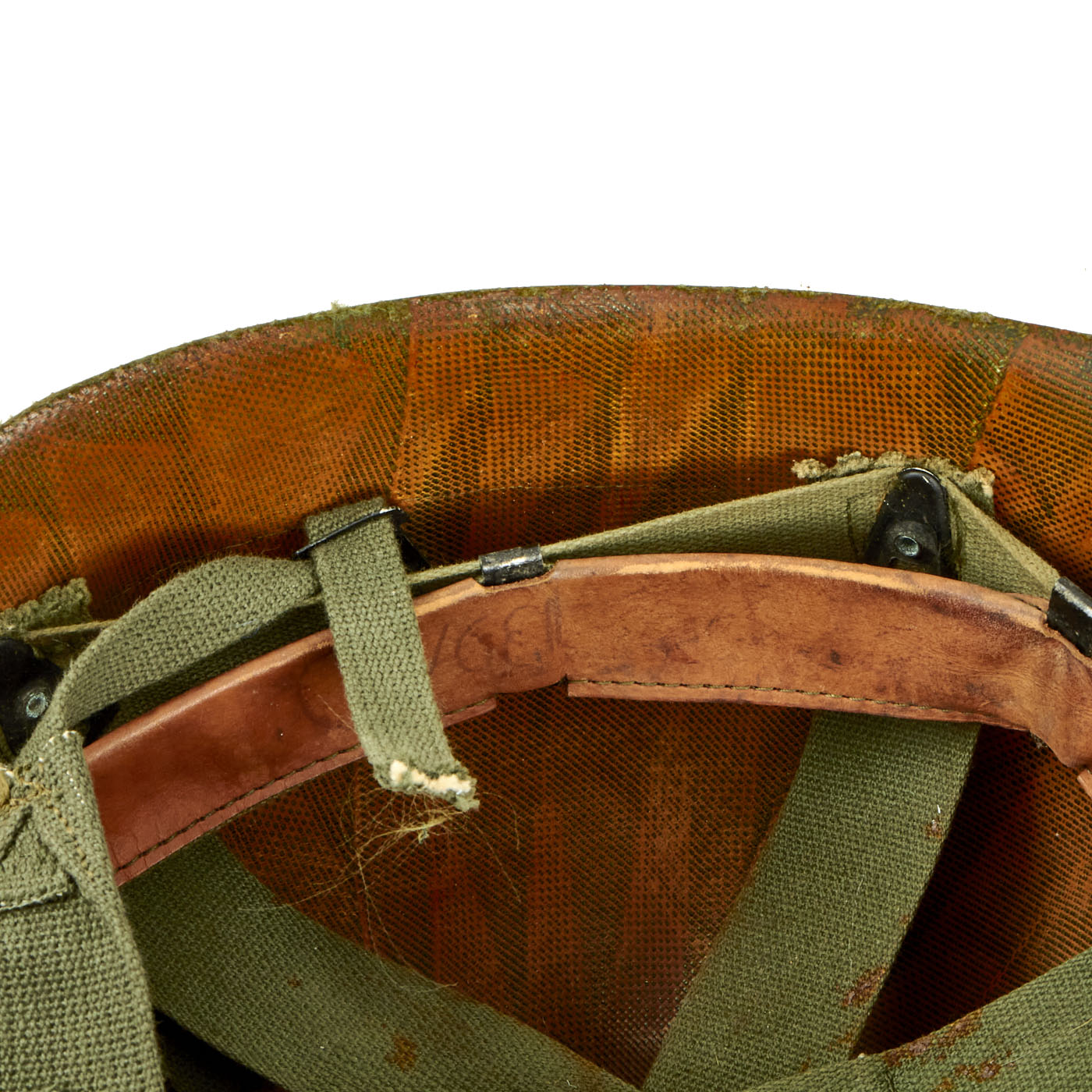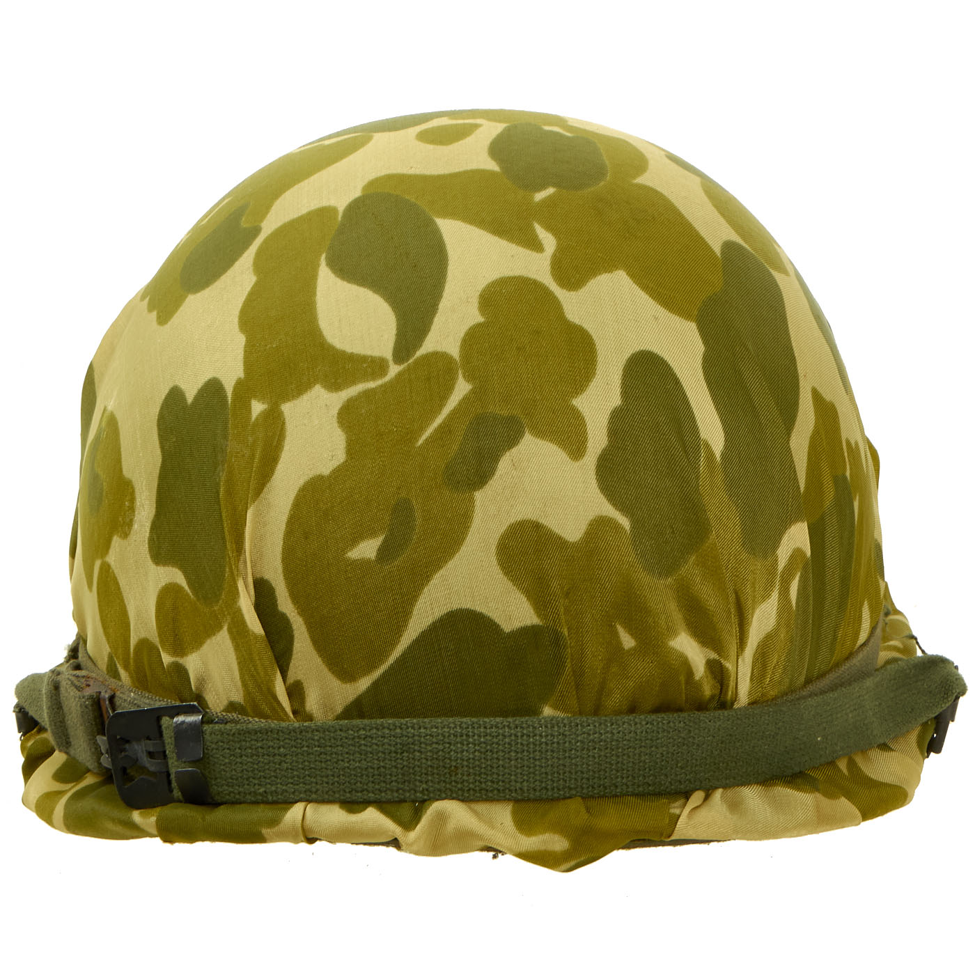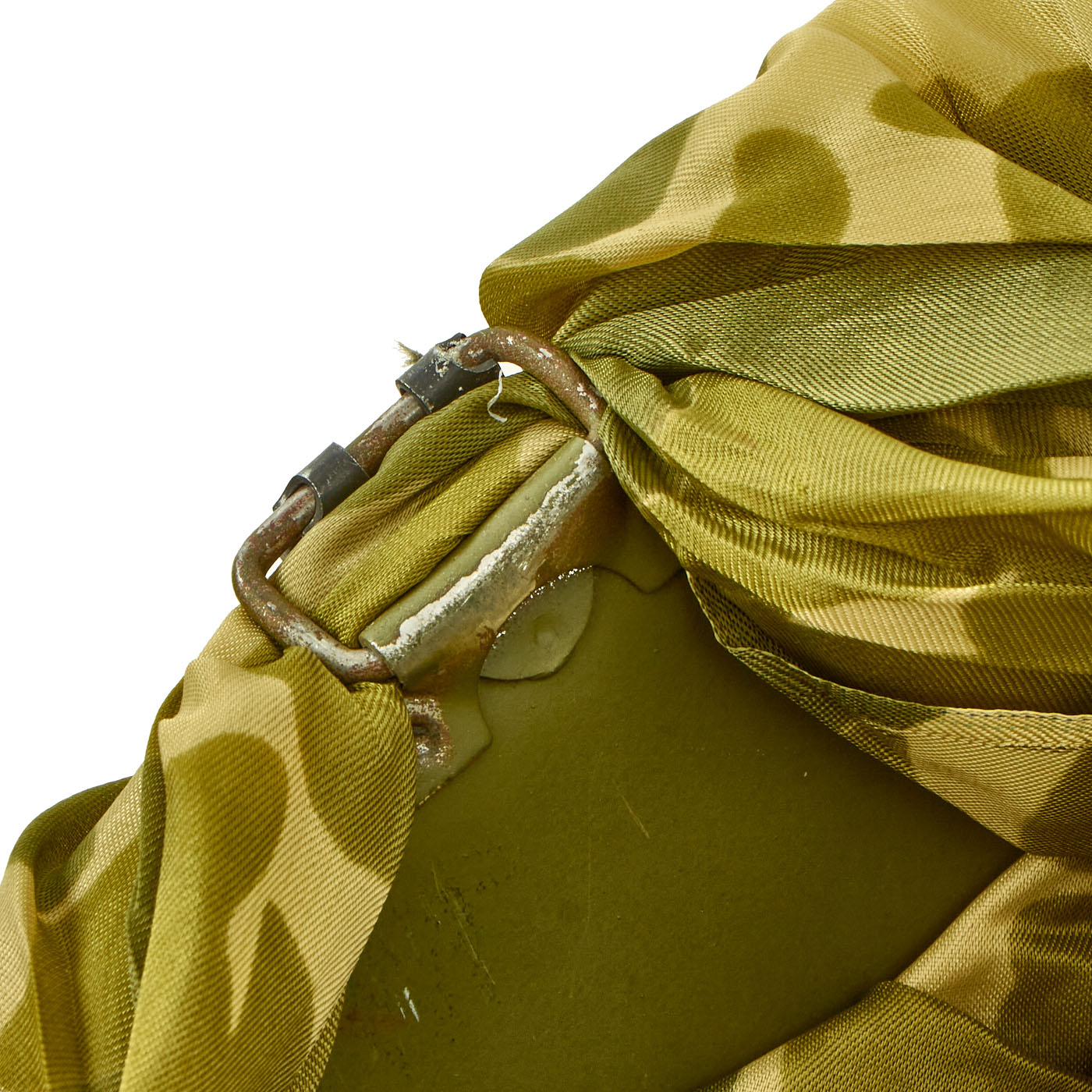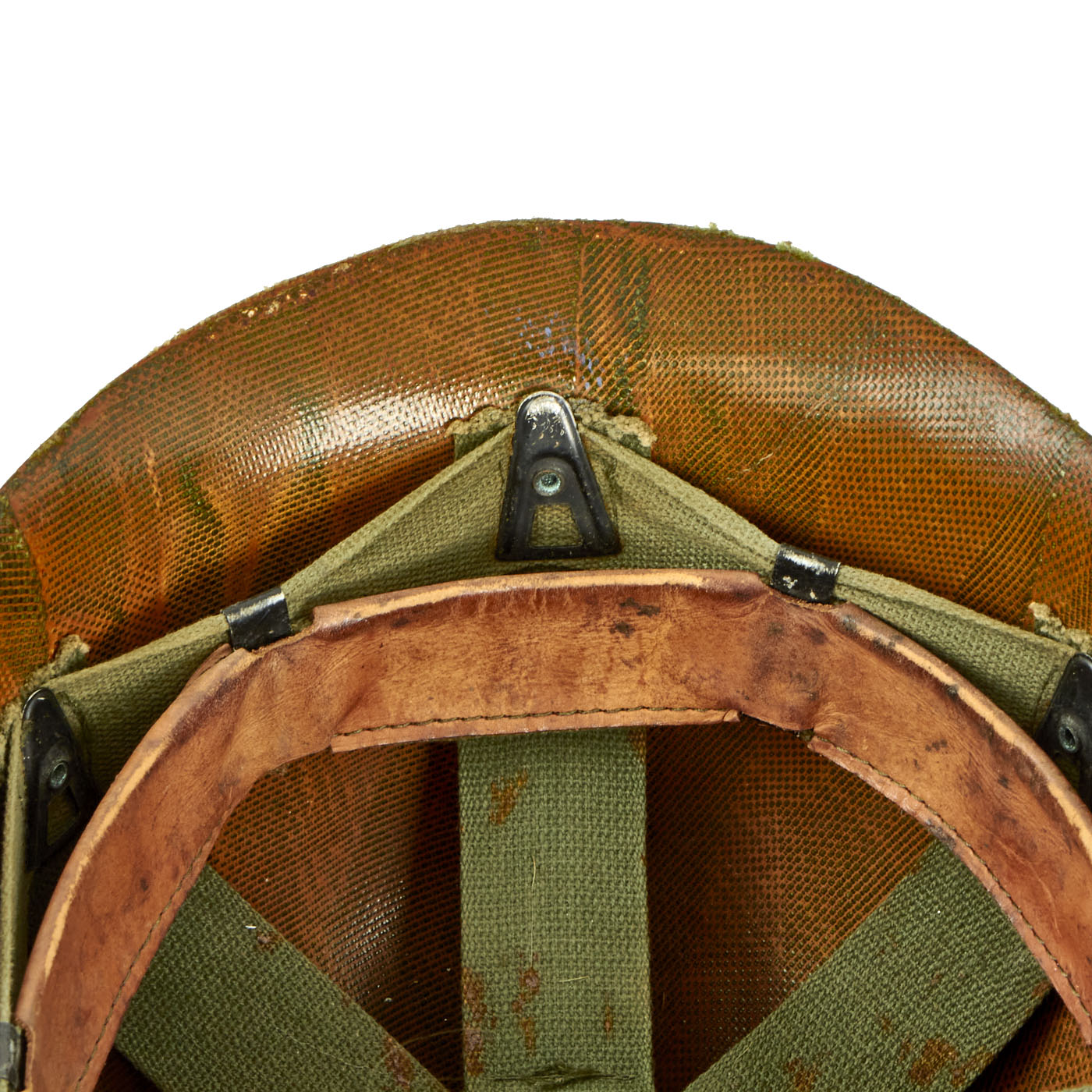 This helmet is a fine example and still retains all of its original Vietnam War parts and the shell has all original corked grain paint. The cover used is a section of parachute canopy silk. It was a common practice during WWII, Korea and the Vietnam War to use canopy silk as a helmet cover when one was needed. This cover does not appear to be field used and was more than likely a later addition.